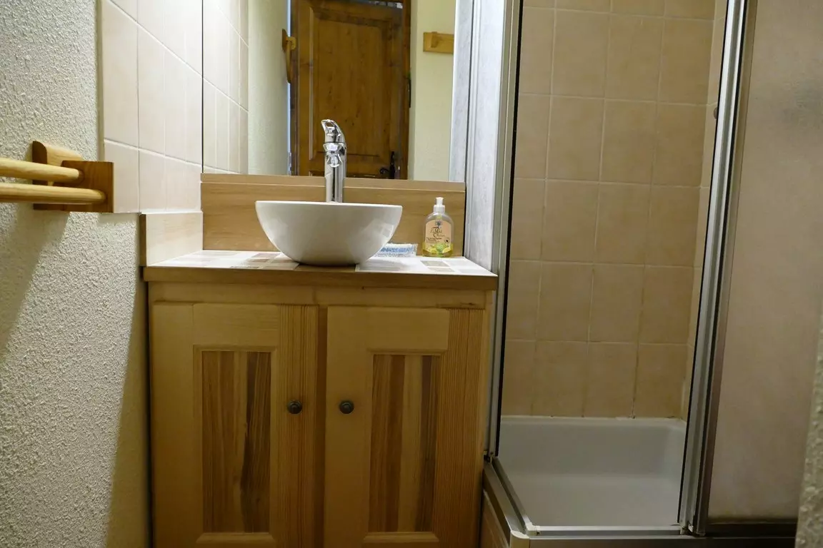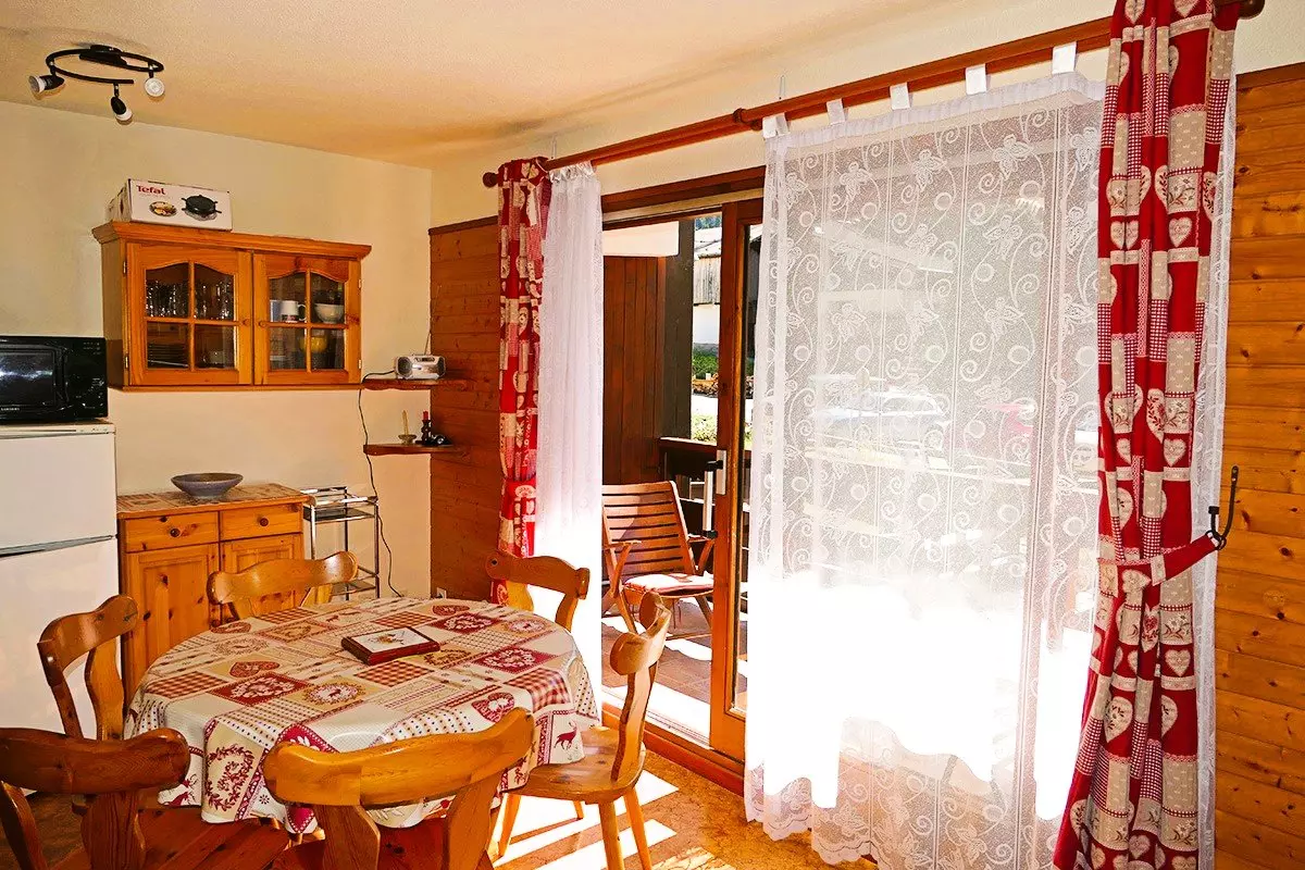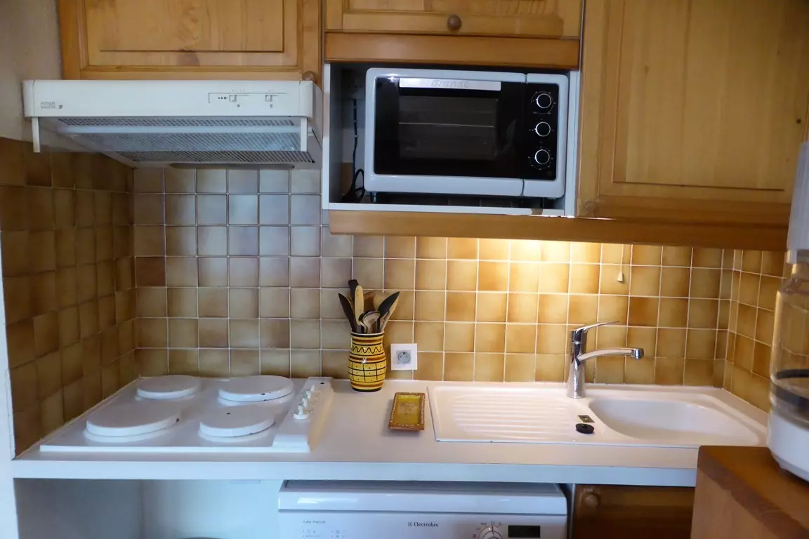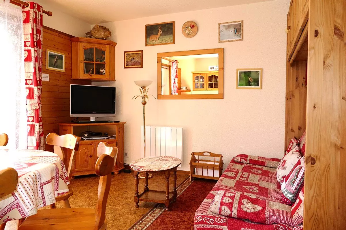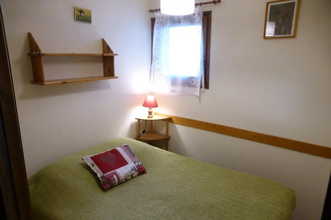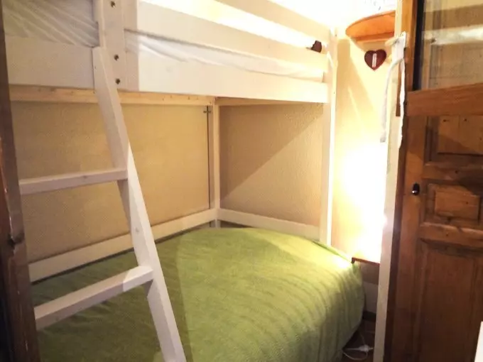 Living room with dining area, relaxation area (TV, sofa bed) and well-equipped kitchenette opening onto the living room (fridge-freezer, dishwasher, kettle, oven, microwave, toaster, coffee maker and raclette machine) - 1 shower room (hair dryer) - separate toilet - bedroom (window) with 1 double bed 140 - 1 bedroom with 2 bunk beds: 120 and 90 (with window) - ski locker - cupboards.