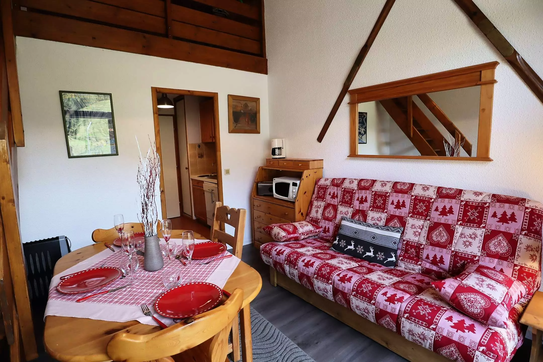 Entrance cabin with 2 bunk beds - living room with 1 sofa bed - south-west balcony - mezzanine: 1 alcove with 1 single bed, 1 double bed in a bedroom - kitchen area - bathroom Separate WC. Wifi. Dishwasher. Small washing machine. Ski and boot room. Box available.