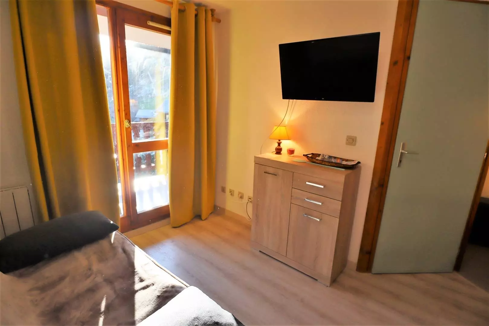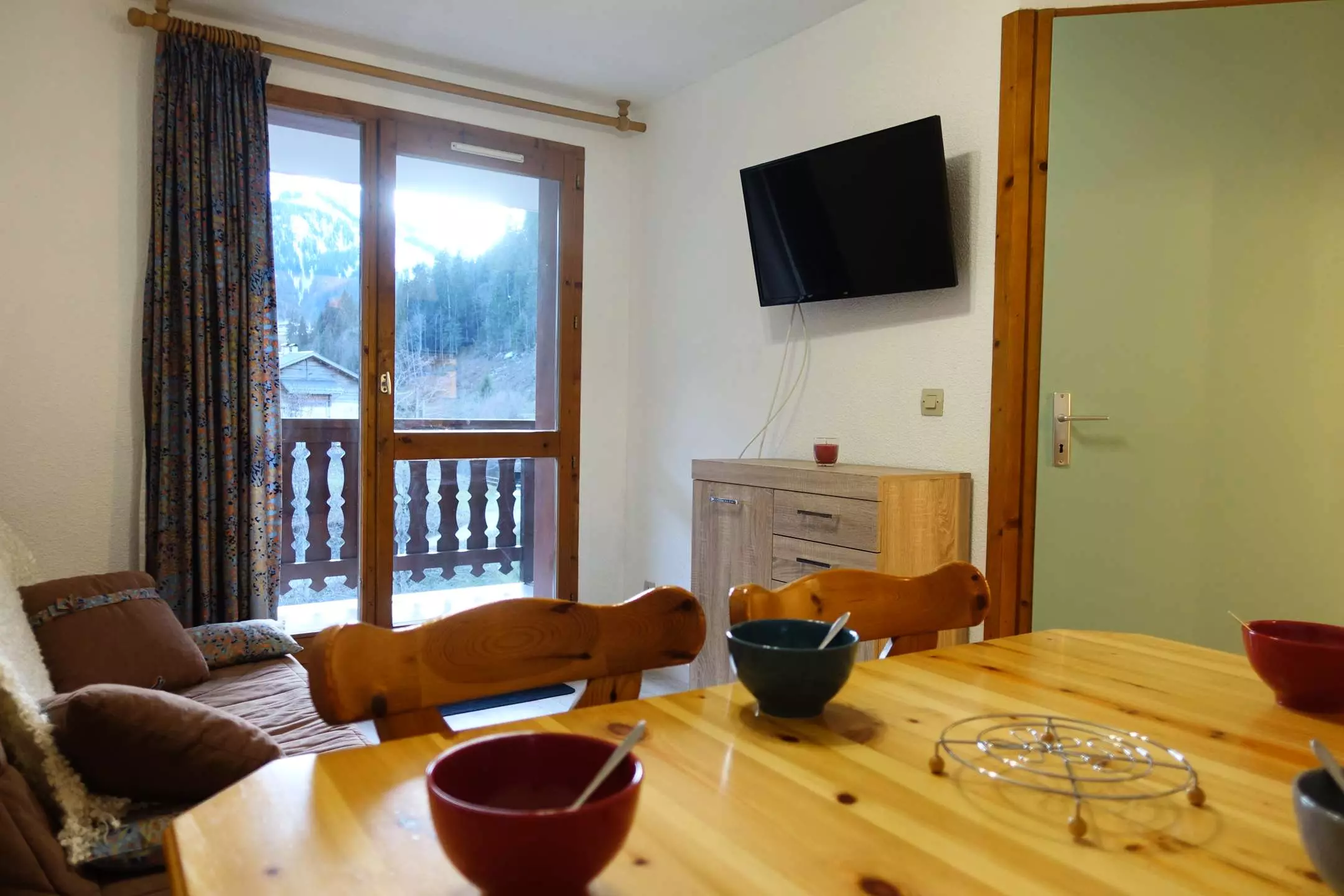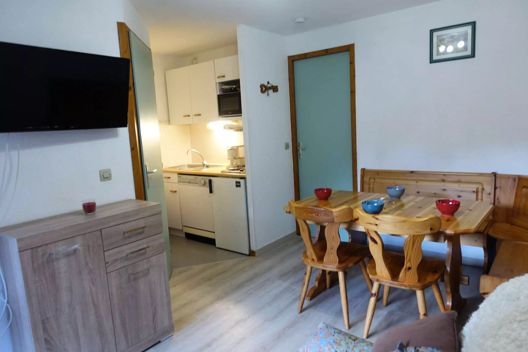 Living room with kitchenette (dishwasher) opening onto a large south-facing balcony - 1 bedroom with 1 bed 140 x 190 - 1 closed cabin area (2 bunk beds 90 x 190) - bathroom - toilet - ski locker. Extra sofa bed in the living room (140 x 190).