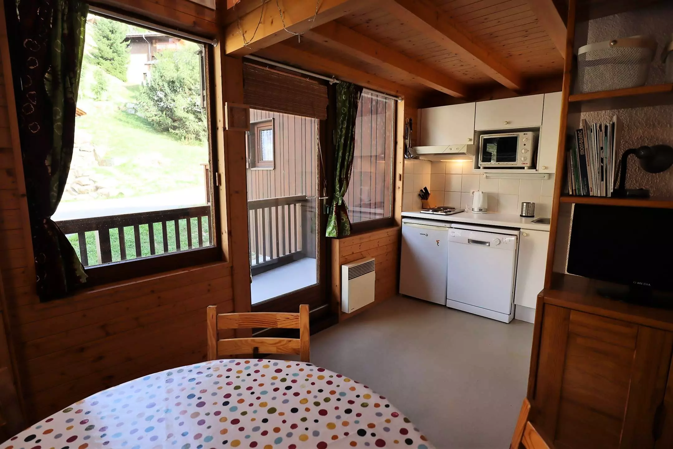 On the ground floor: Living room with dining area (round table) and well-equipped kitchenette (dishwasher, refrigerator, sink, electric oven, 2 electric hotplates, filter coffee maker, kettle, etc.). Large closet at the entrance + kitchen cupboards. Television. Wi-Fi.