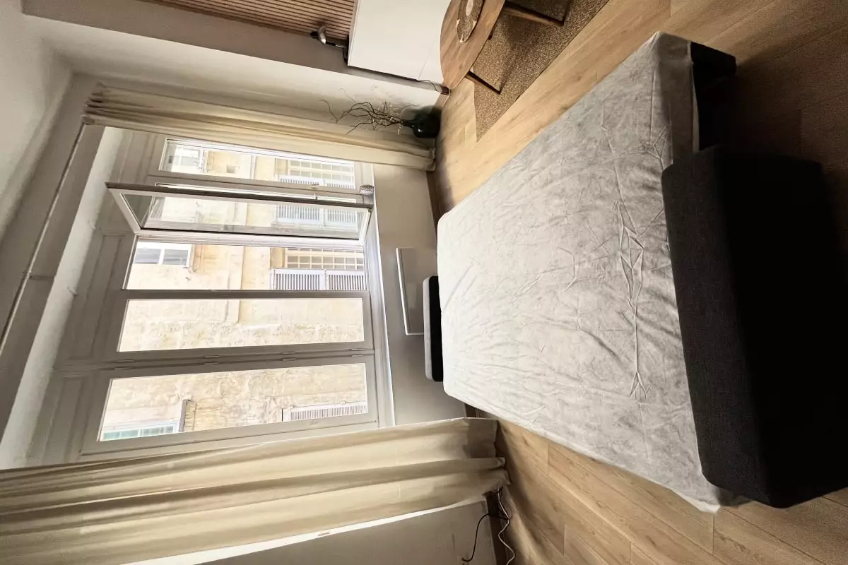 - an open bedroom with a double bed located approximately 6m from the living/dining room;