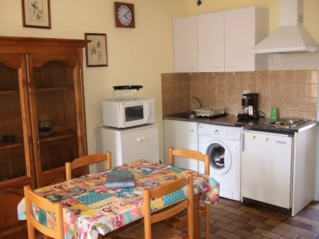 KITCHENETTE: small refrigerator, microwave, mini-oven, 2 hotplates, washing machine, cupboard