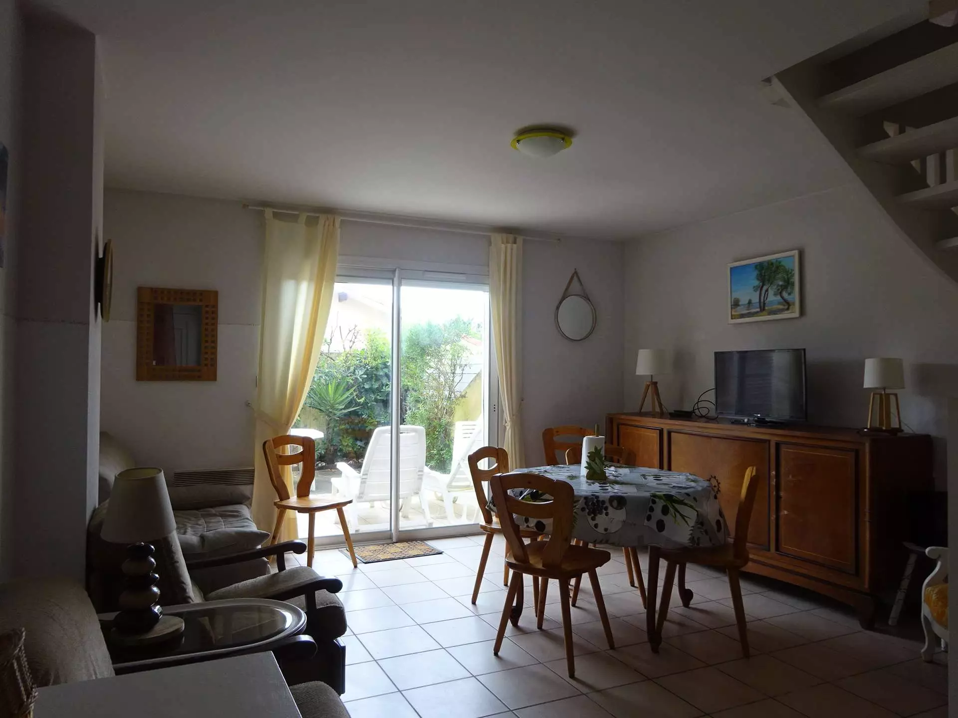 MAIN ROOM: table, chairs, 2-seater sofa, 2 armchairs, sideboard, television