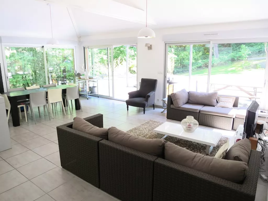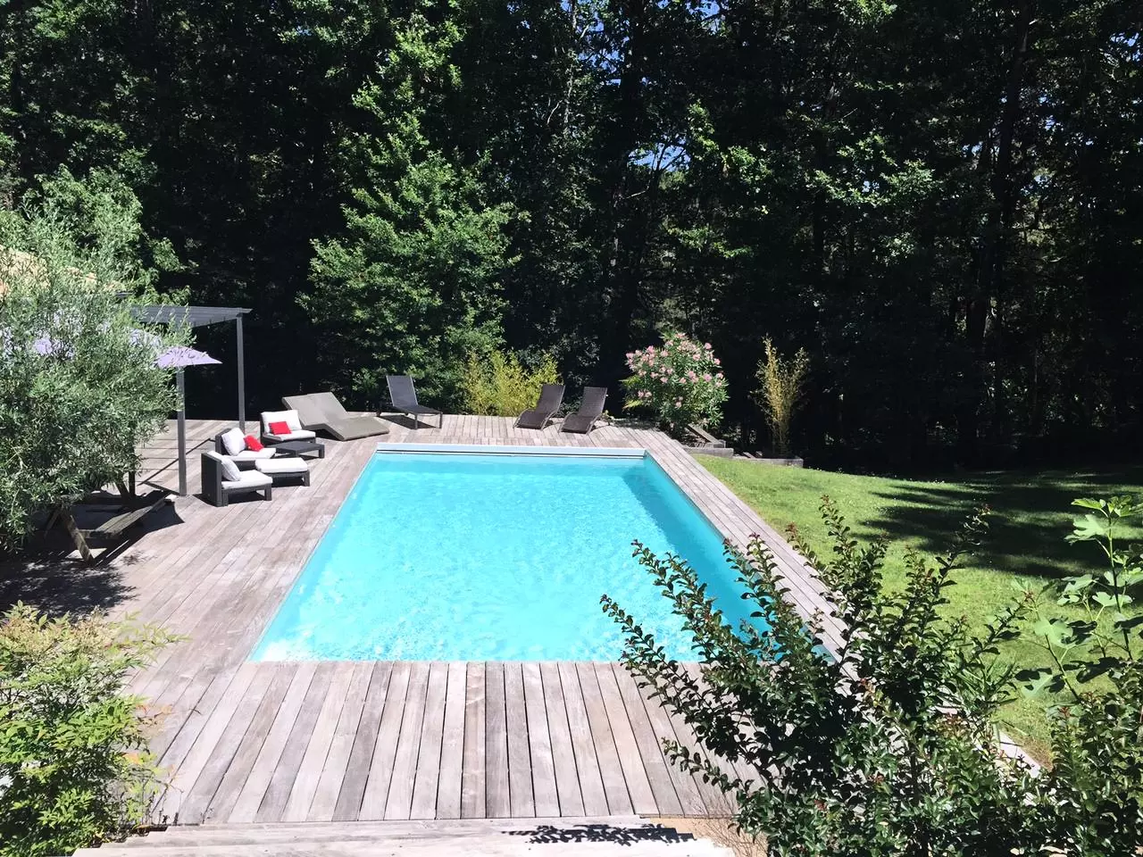 MAIN ROOM: table, chairs, 2 3-seater sofas, TV, large bay windows onto the terrace and an extension to a swimming pool which is sunny all day long and equipped with deckchairs and garden furniture