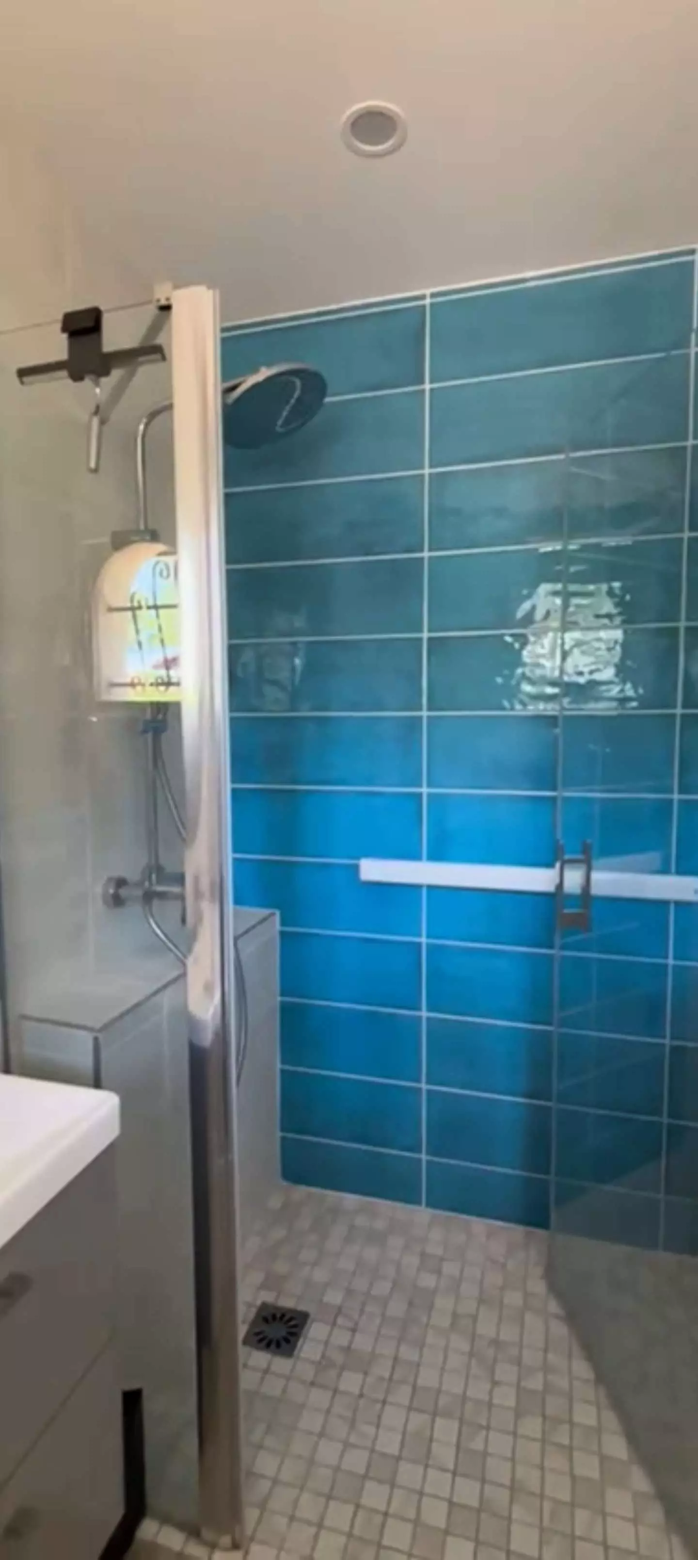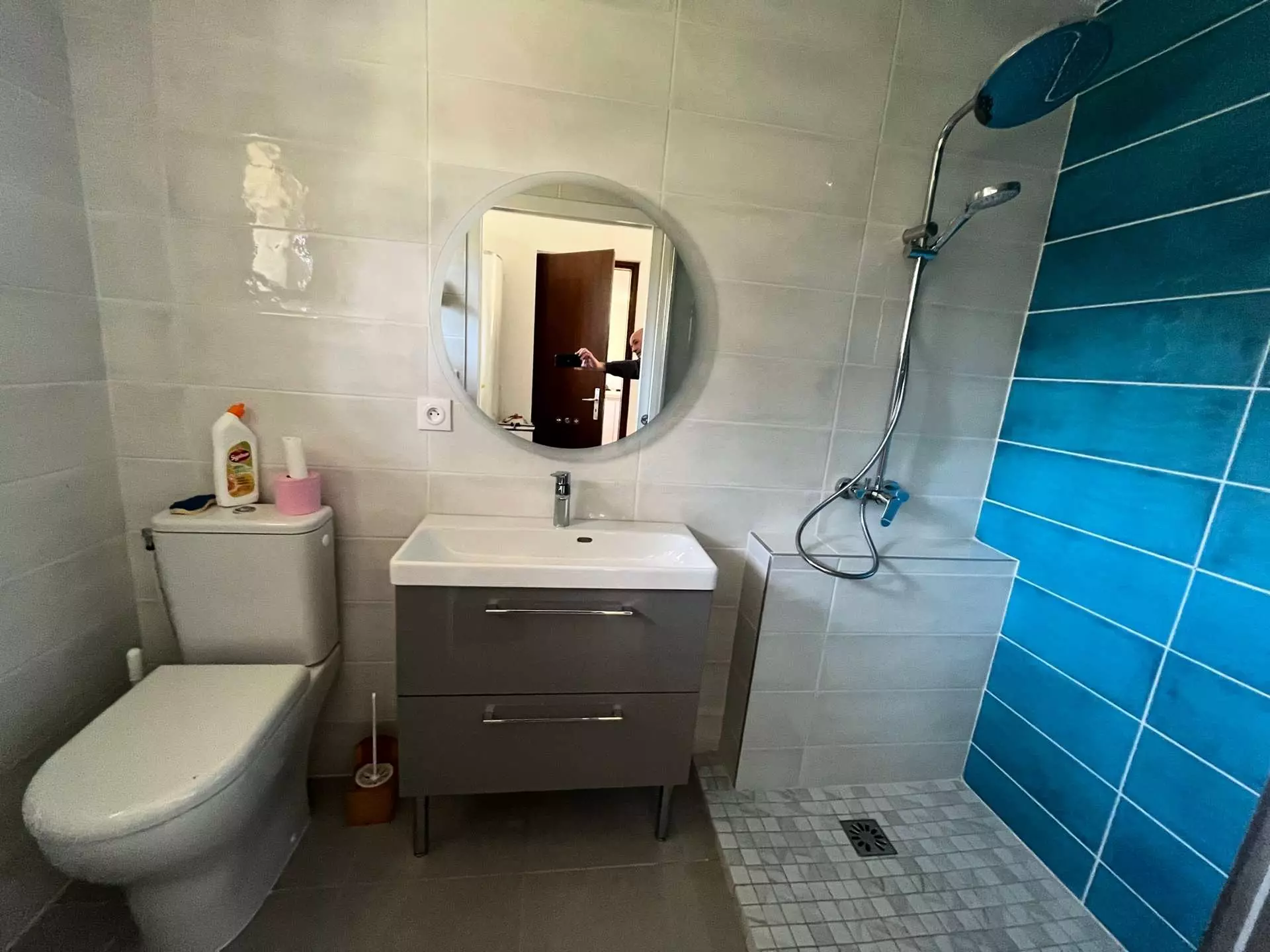 Tiled room with 1 armchair, coffee table, bathroom with walk-in shower, sink, toilet, washing machine.