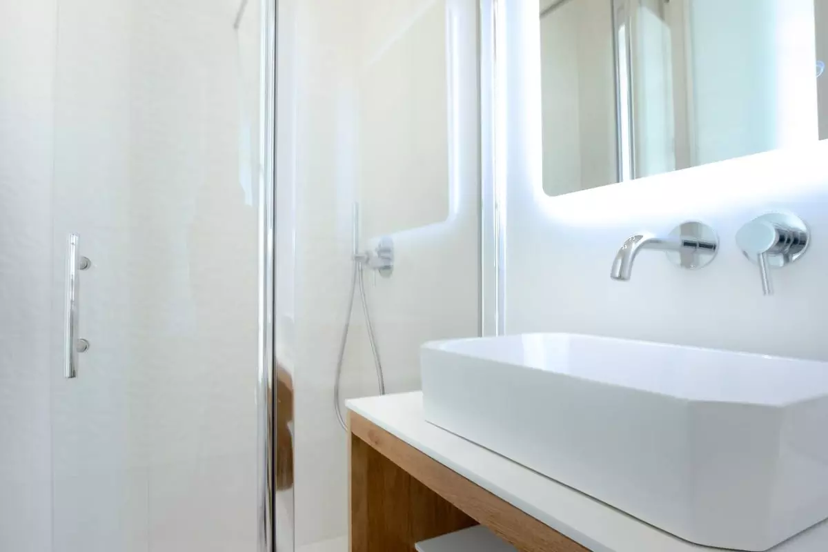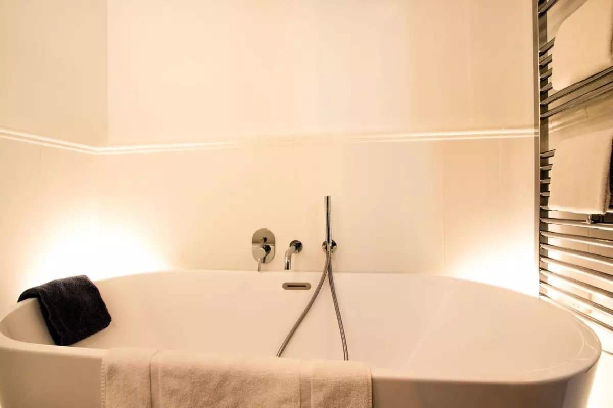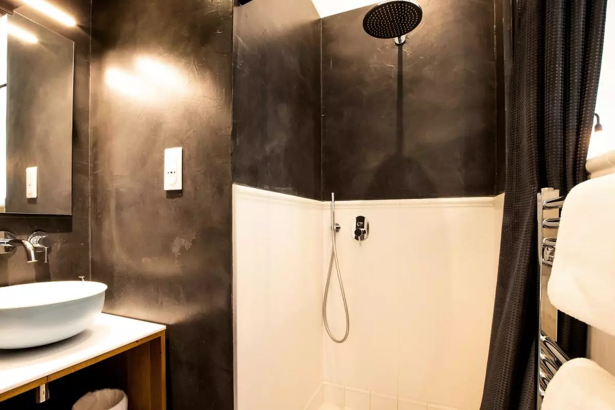The apartment features three spacious bedrooms, each with its own unique character. The master suite features a comfortable double bed and a private bathroom with a contemporary freestanding bathtub. The other two bedrooms, also equipped with double beds, offer exceptional comfort, each with a private bathroom featuring elegant walk-in showers.