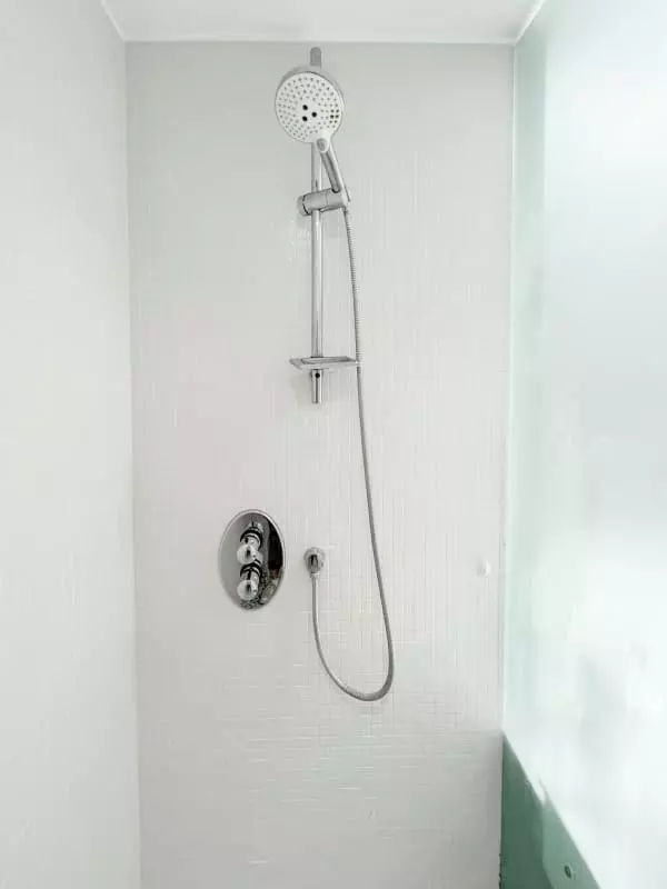 A bathroom with shower and double sink, as well as 2 bedrooms make up the sleeping area of the apartment.
