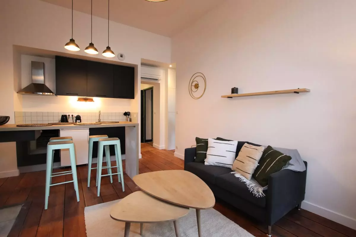 Come and settle into this cozy and welcoming apartment, nicely decorated in an urban and friendly atmosphere, organized around a bright living room with equipped kitchen, sofa ambiance and upholstered armchairs, 2 comfortable bedrooms, one furnished with a double bed 160 and storage, the other with a sofa bed for 2 people. The bathroom is equipped with a walk-in shower, sink and heated towel rail and a separate toilet. Coordinated and warm furnishings. Located on the 4th floor, without elevator, enter by 3 small steps in the living room and enjoy a breathtaking view of the rooftops of Bordeaux. Reversible air conditioning.