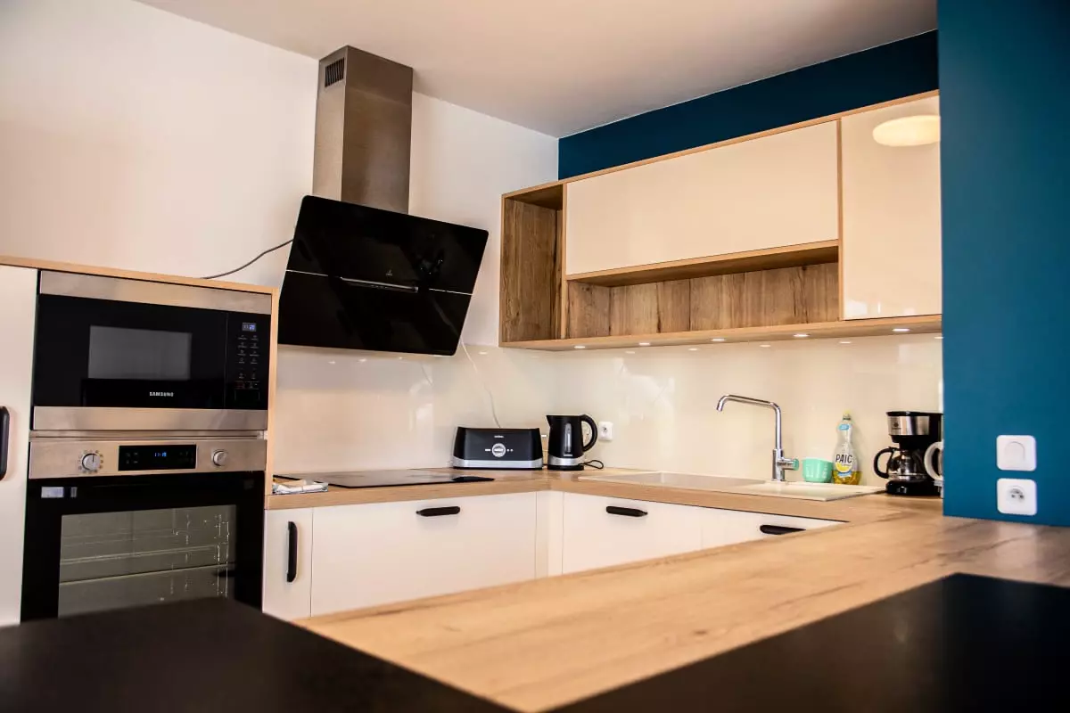 The kitchen has a long worktop and is fully equipped with a range hood, fridge/freezer, and basic utensils.