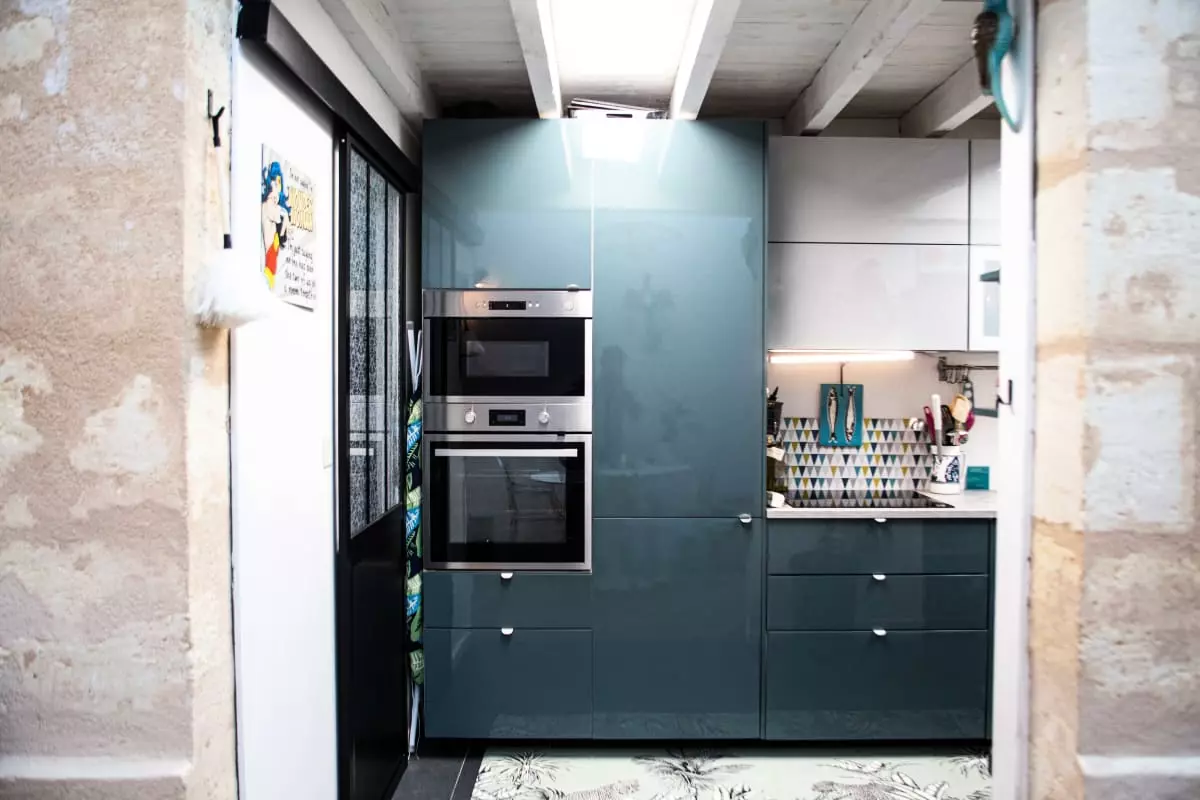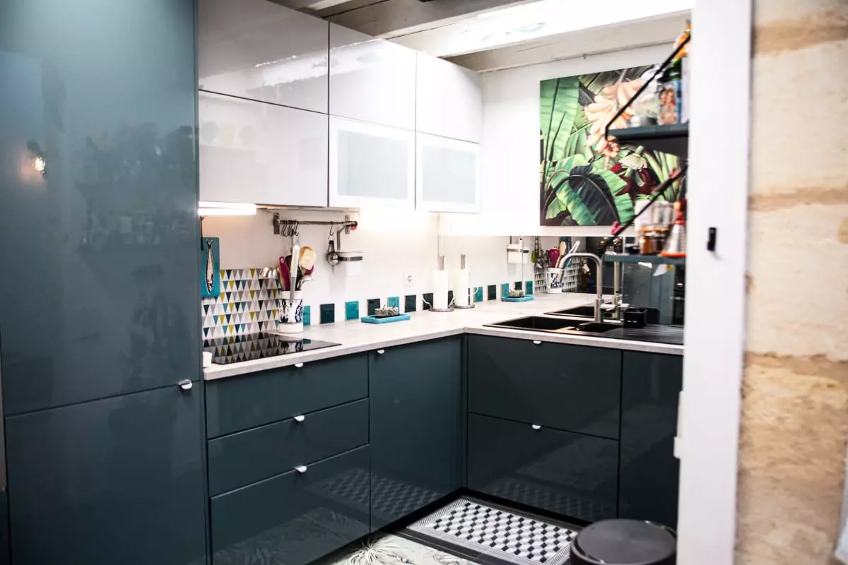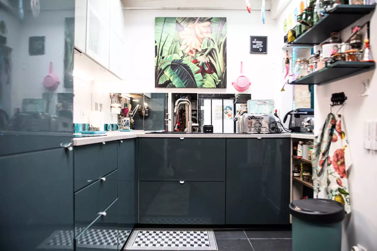 The kitchen has a long worktop and is fully equipped with a range hood, dishwasher, fridge/freezer, and basic utensils.