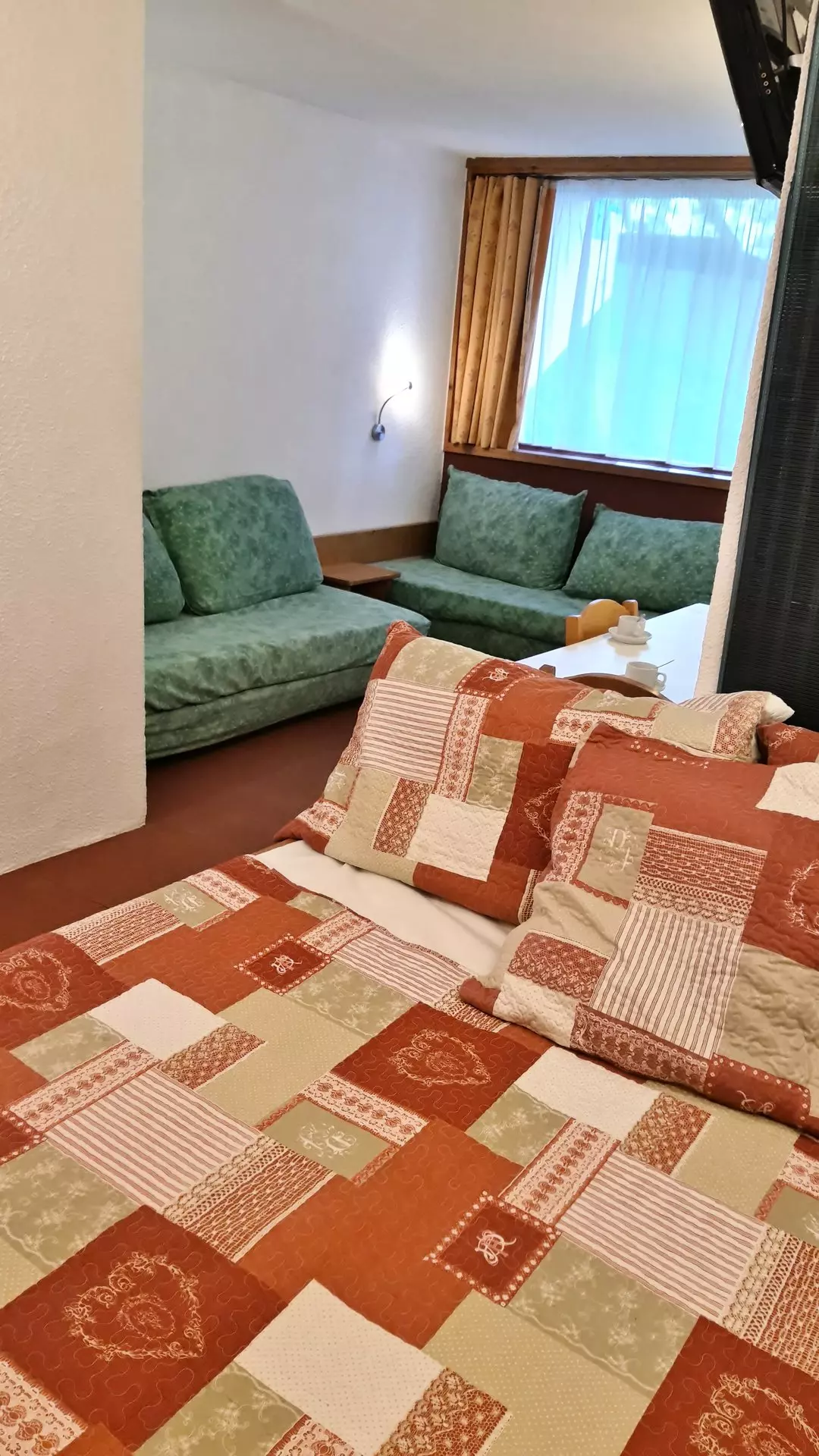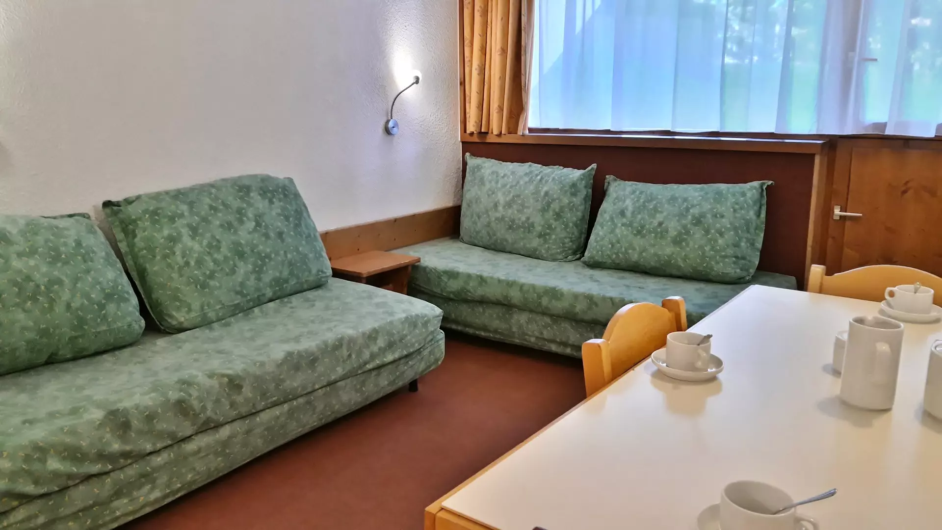 Living room with an alcove and 1 sofa bed + trundle bed allowing sleeping for 2 people in 160cm, two single sofa beds in 80cm, and a television.