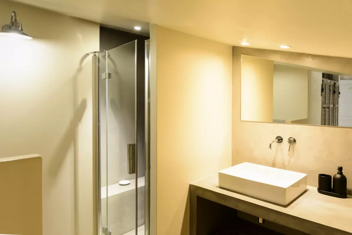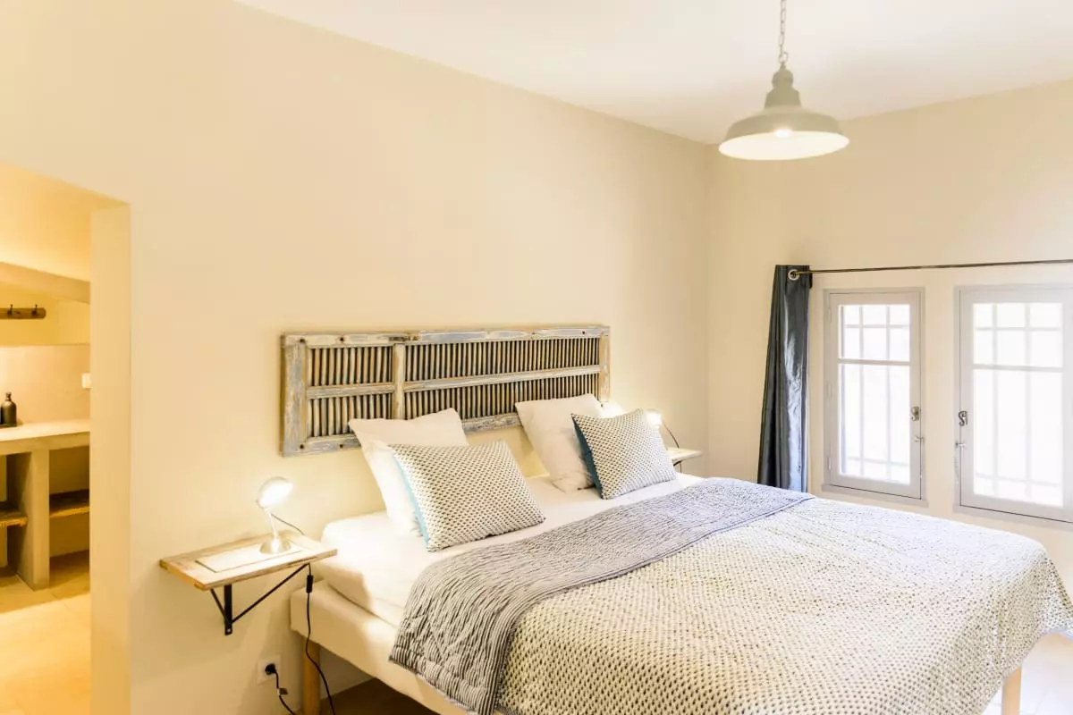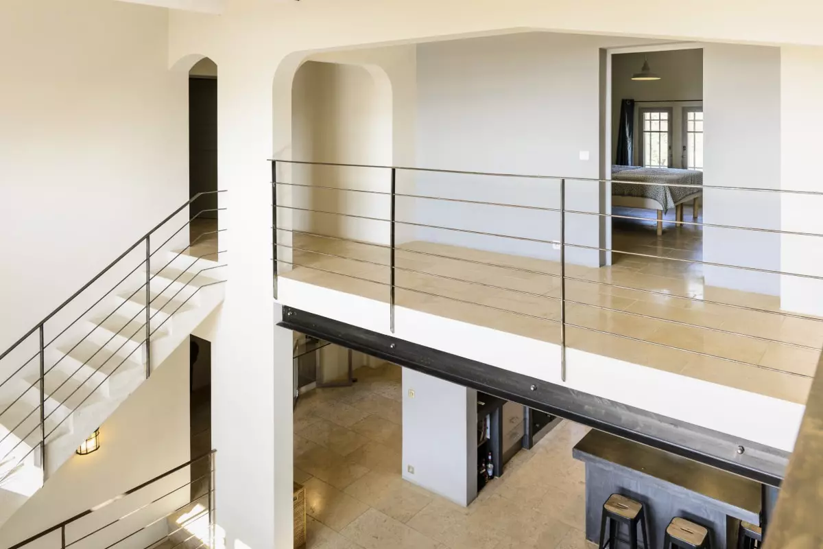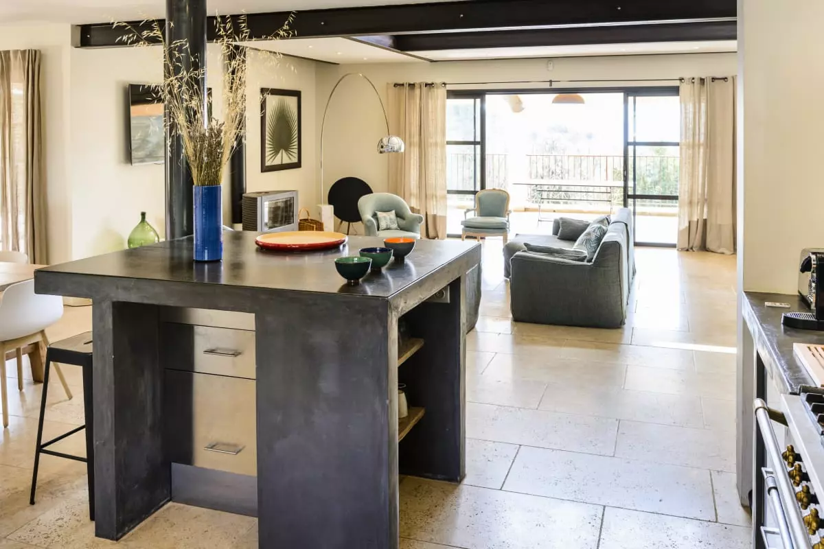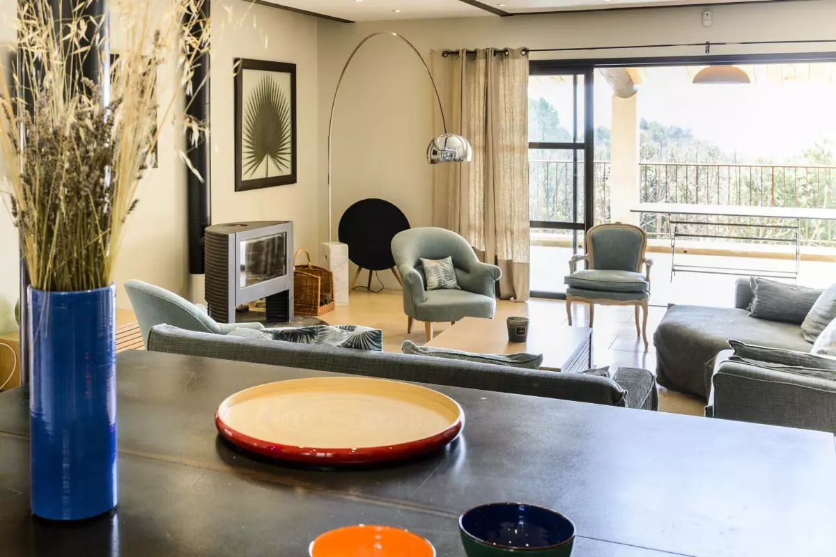The house offers spacious bedrooms, a well-equipped kitchen, and outdoor spaces perfect for relaxing and group gatherings. Six bedrooms are air-conditioned, and the garden-level bedroom remains naturally cool. The spacious living area combines a living room, dining room, and kitchen, with exceptionally high ceilings and a contemporary design.