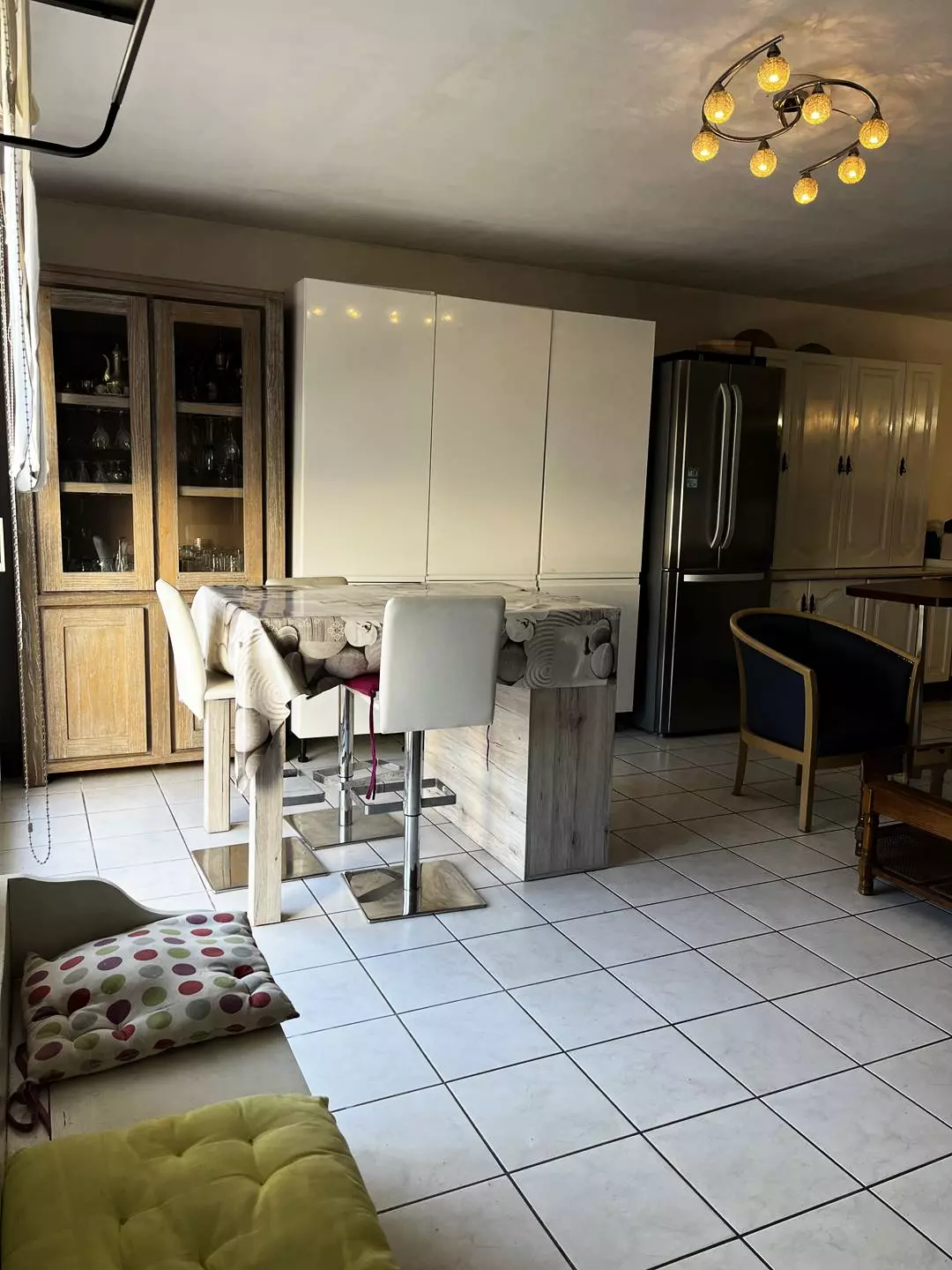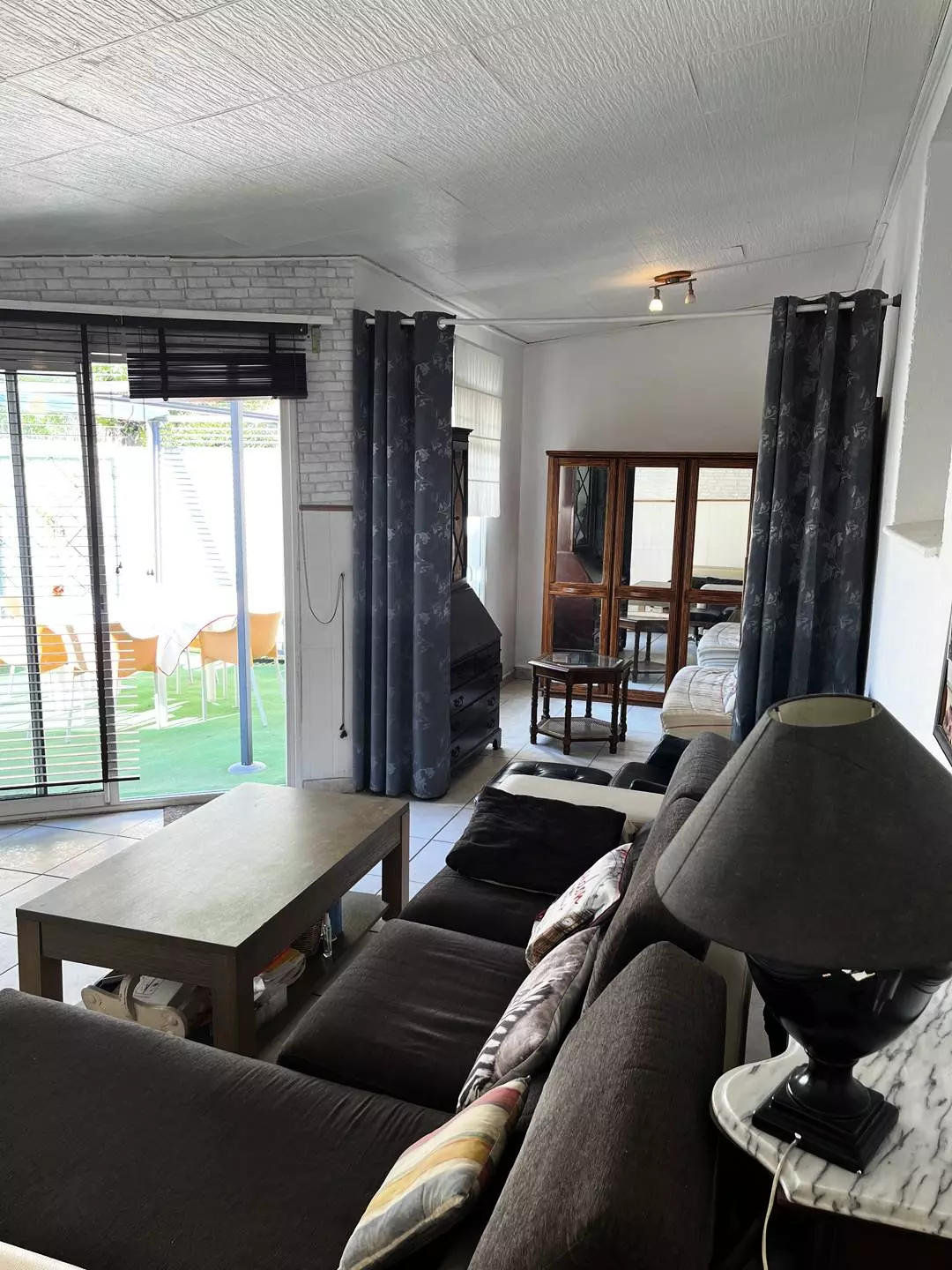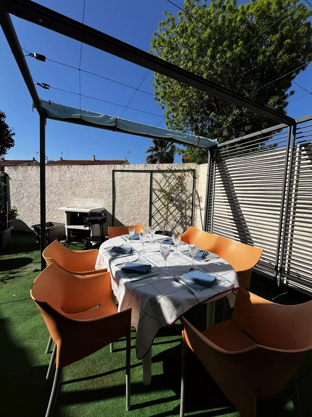 Beyond the kitchen, another large living space awaits, featuring a smart TV and a large sofa bed. Behind this area, a modular space with a BZ (sofa bed) is separated by curtains for added privacy. All of these living spaces extend into the backyard, where you can enjoy a large dining table, a sunshade, and a barbecue for convivial moments outdoors.
