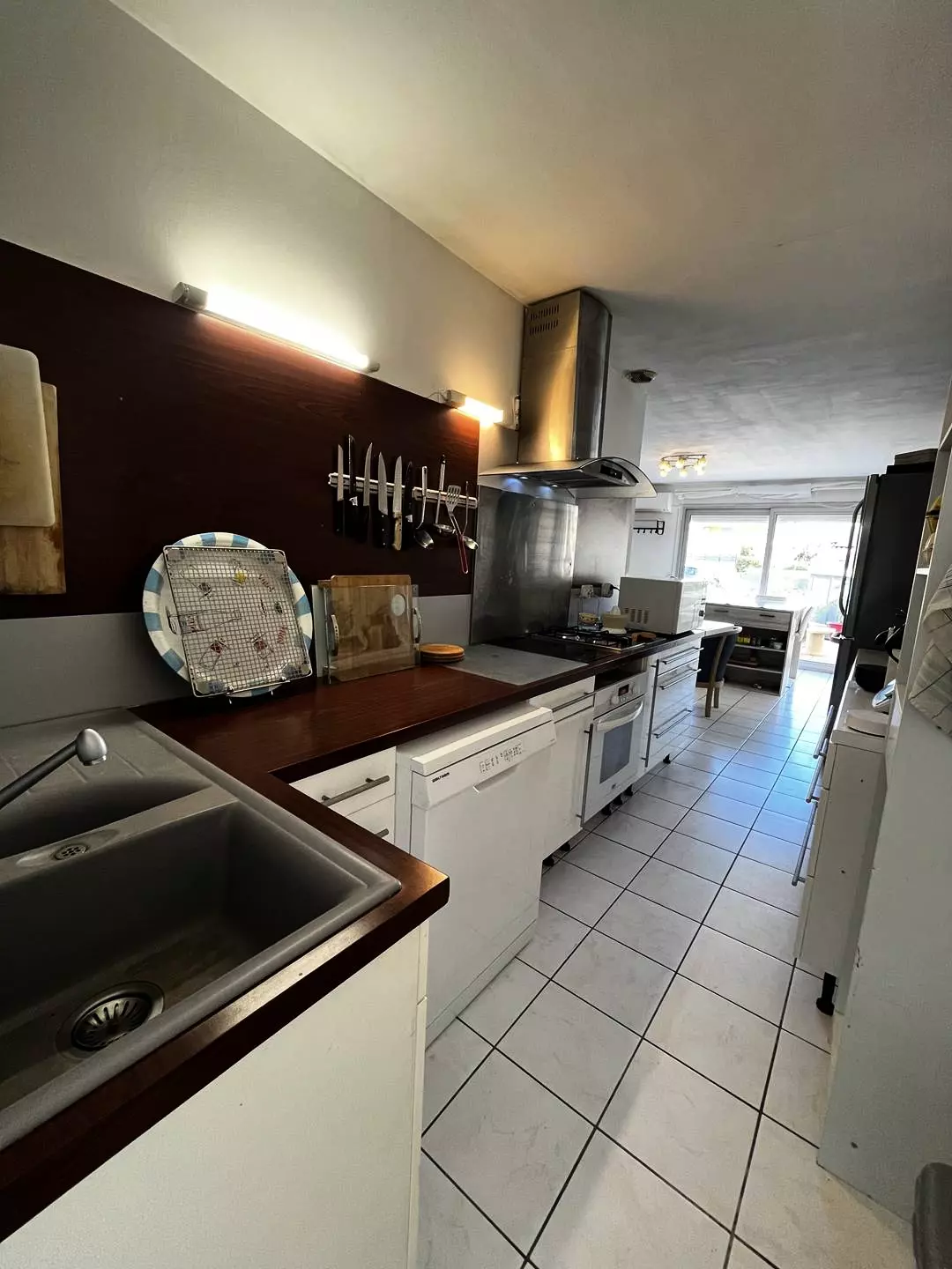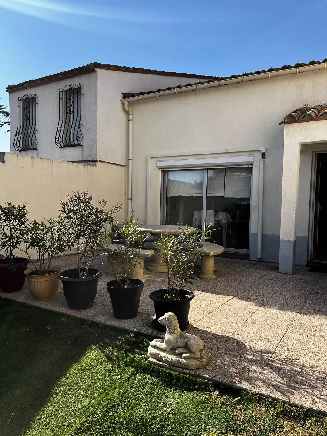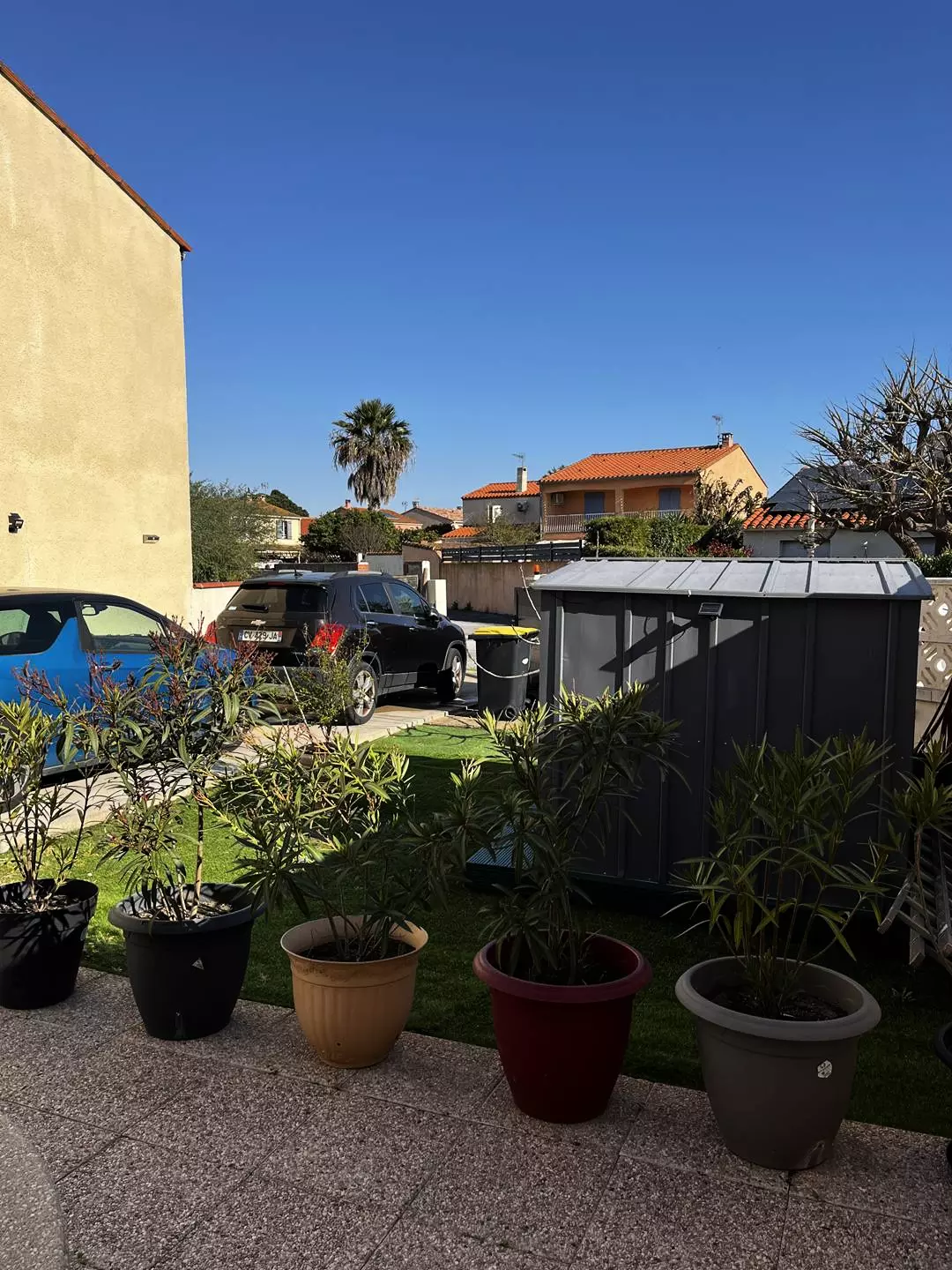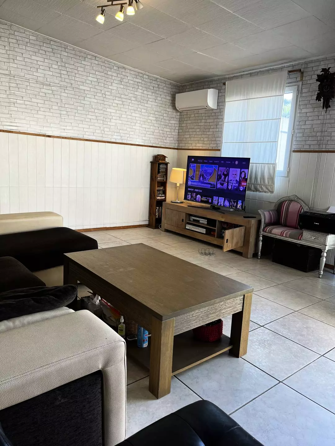 Beyond the kitchen, another large living space awaits, featuring a smart TV and a large sofa bed. Behind this area, a modular space with a BZ (sofa bed) is separated by curtains for added privacy. All of these living spaces extend into the backyard, where you can enjoy a large dining table, a sunshade, and a barbecue for convivial moments outdoors.