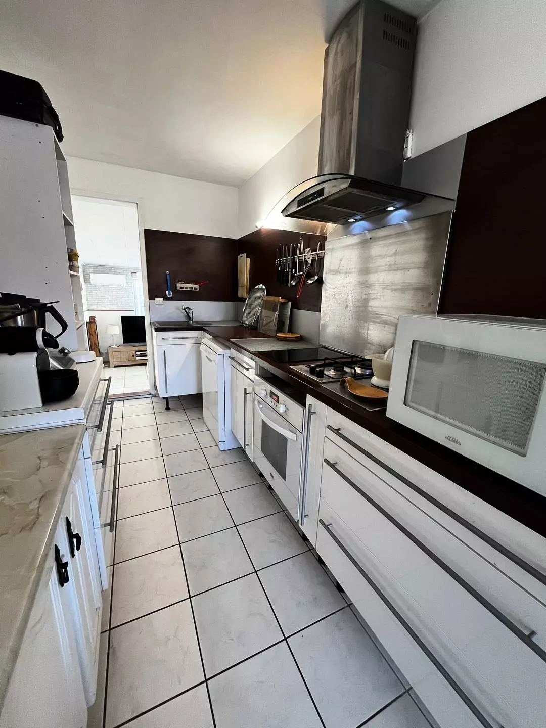 The living room is divided into several convivial spaces. The space, located at the front, overlooks the courtyard with a terrace equipped with an outdoor dining table. The living room has a dining area and a fully equipped open kitchen (oven, microwave, Nespresso and Senseo coffee machine, induction and gas hobs, dishwasher, kitchen utensils, Cookeo and storage).