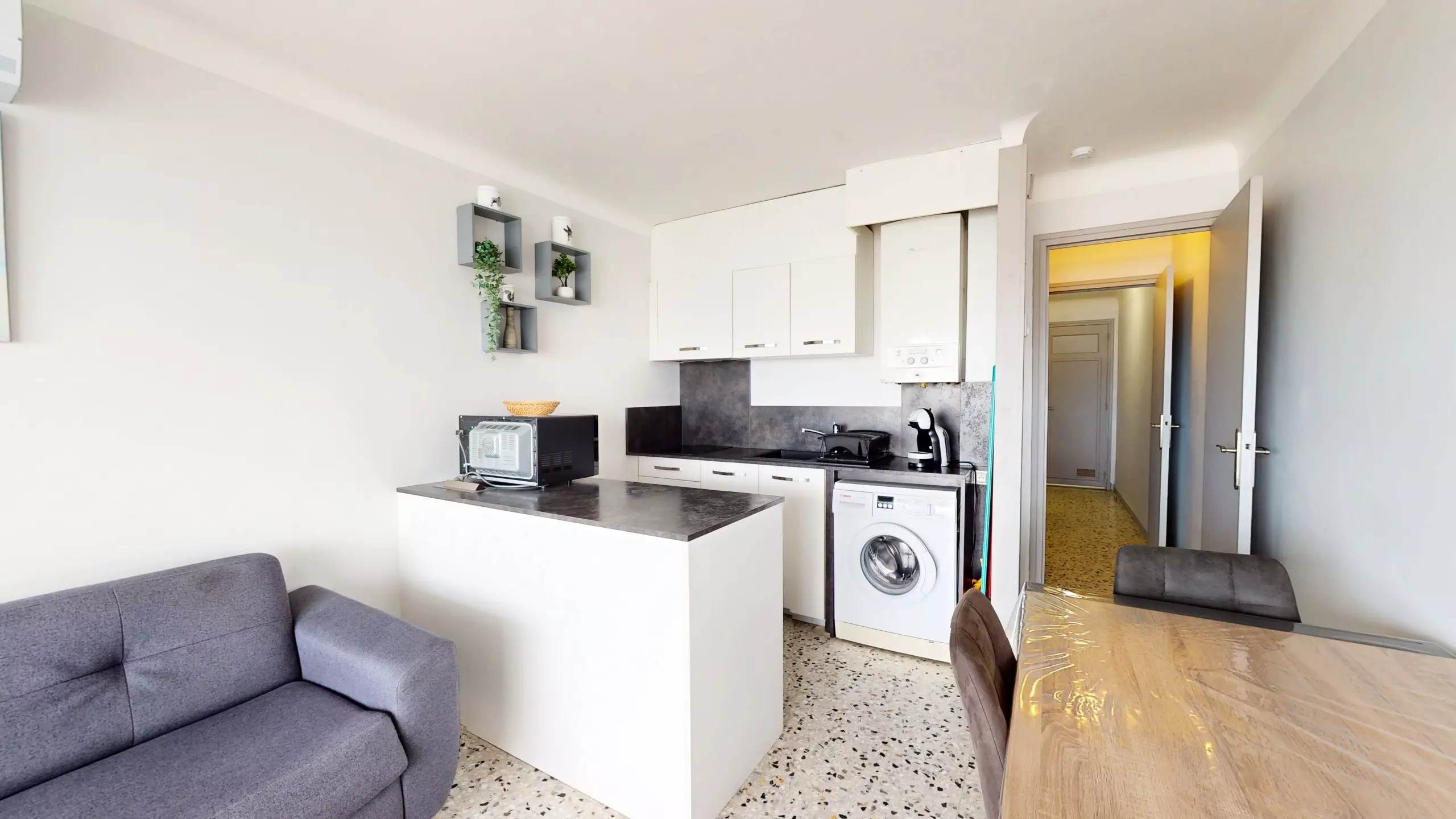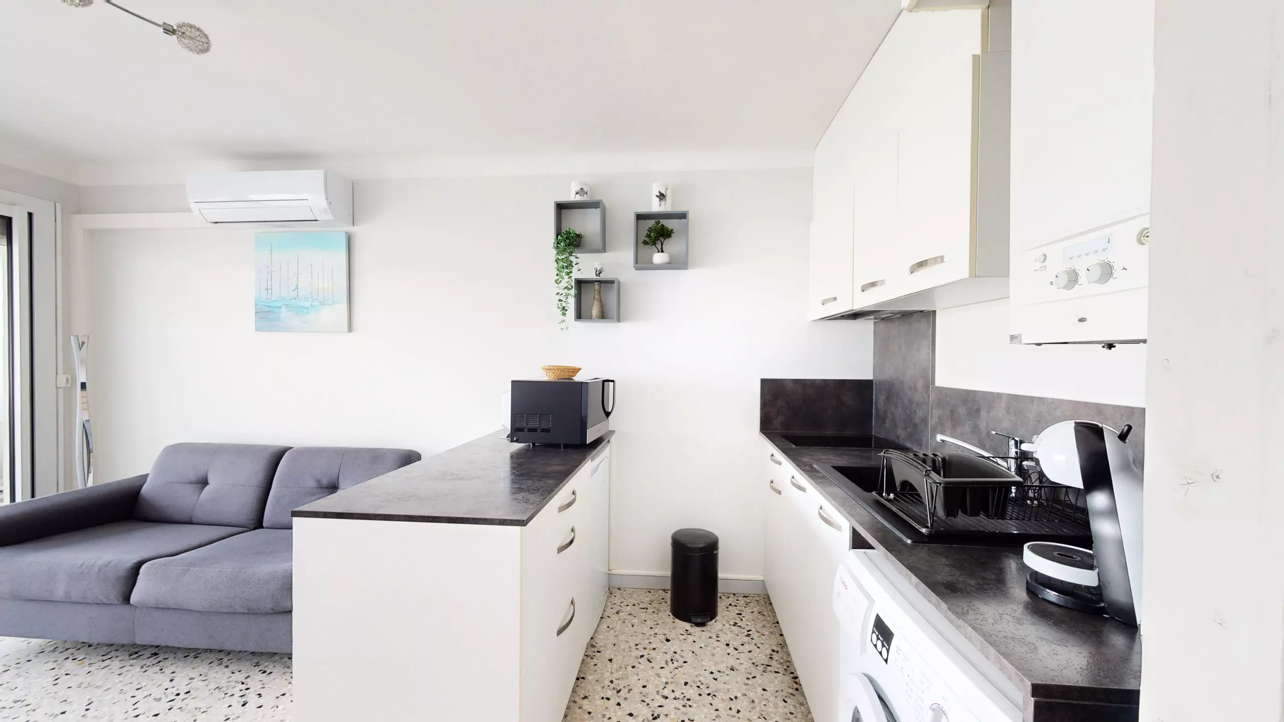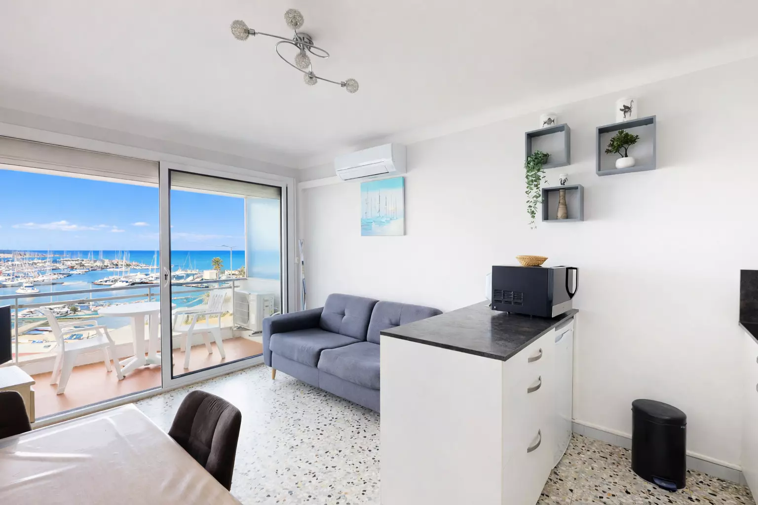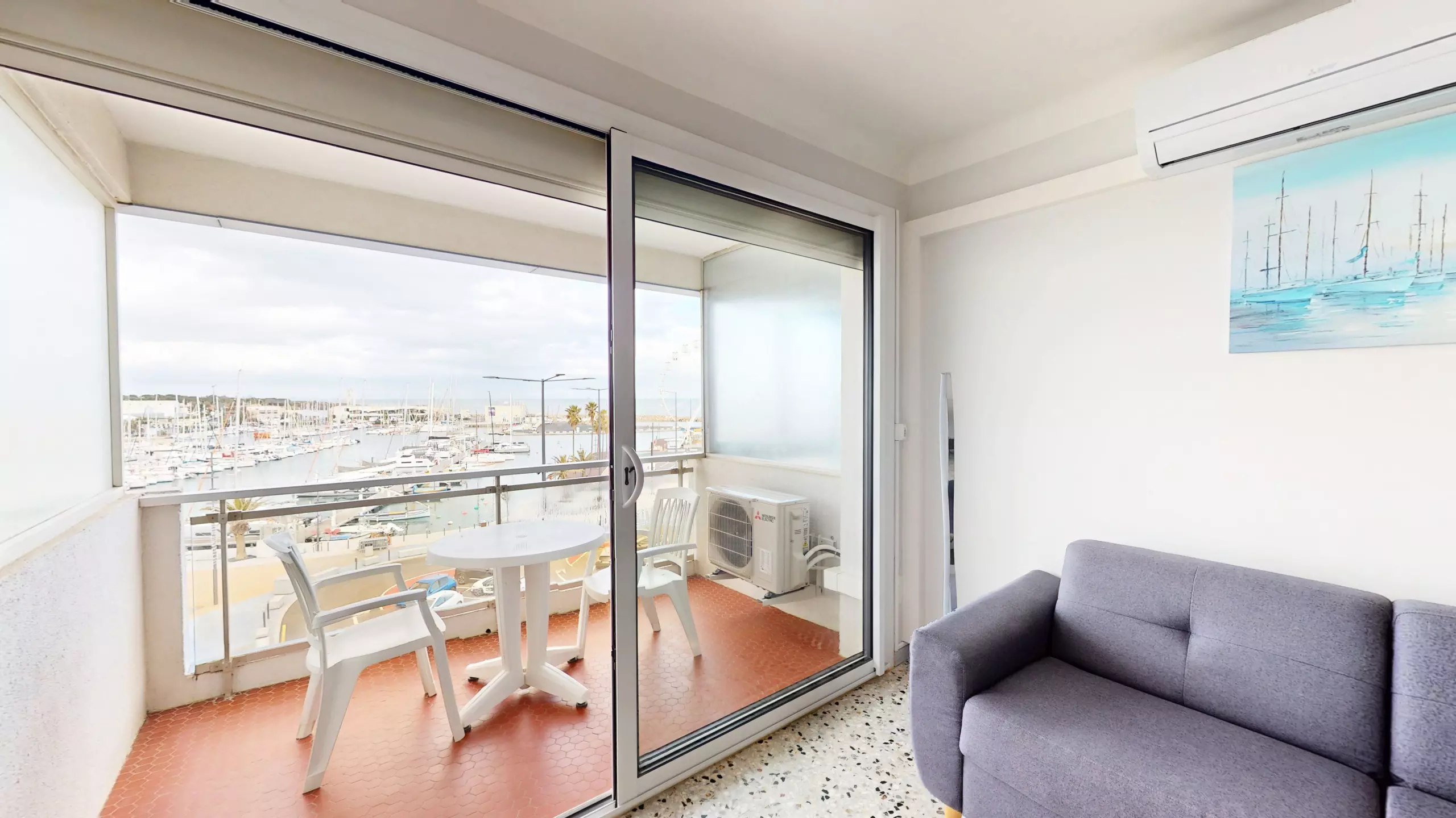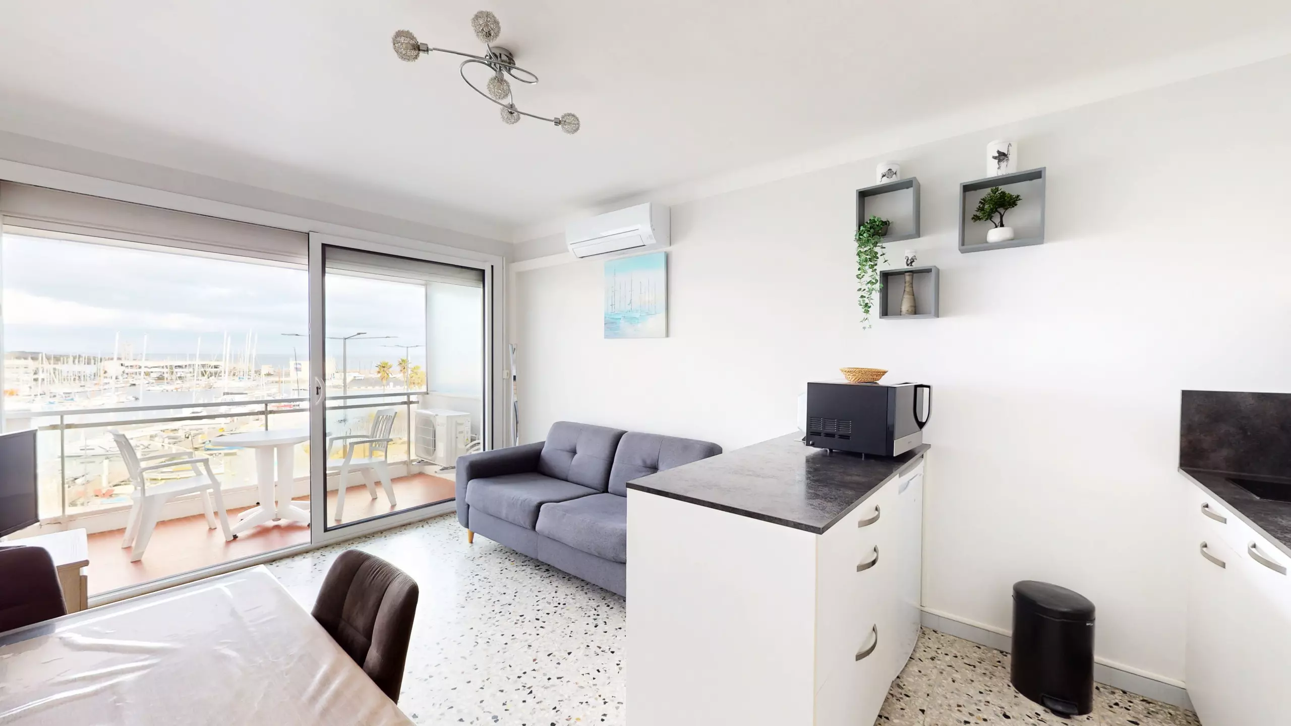 It consists of an entrance hall leading to a bedroom, a shower room with WC, a kitchen open to the living room with a balcony with an unobstructed view of the marina.