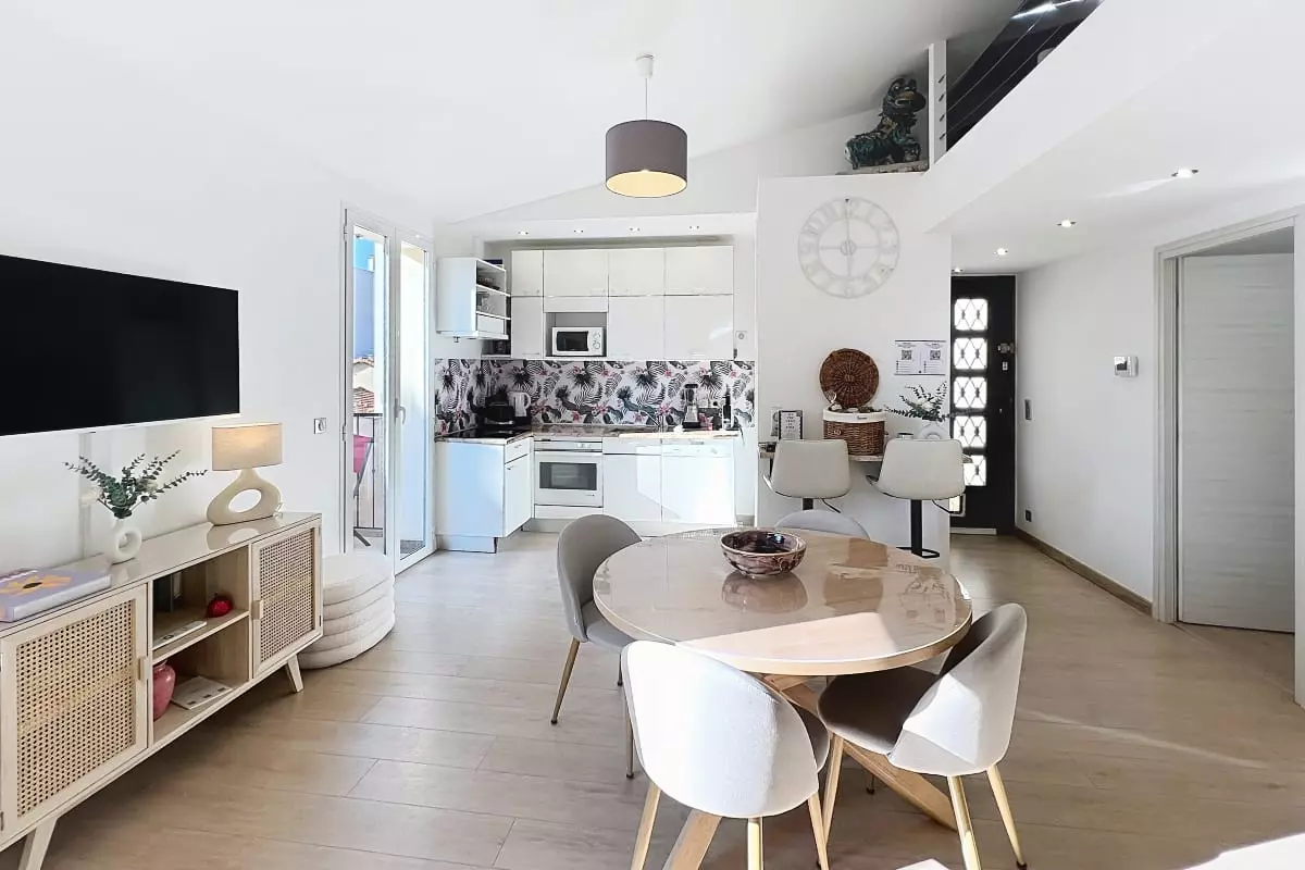 Large "cathedral" living room with modern, fully equipped open kitchen, opening onto 2 south-facing balconies