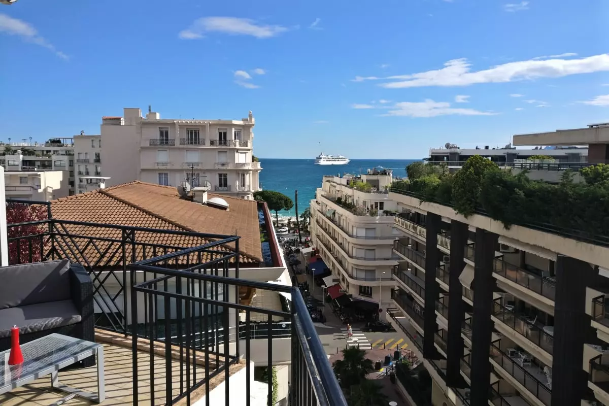 Top-floor studio with terrace and splendid sea view in the heart of Cannes, 40 meters from the Croisette between the Carlton and the Martinez Hotel.