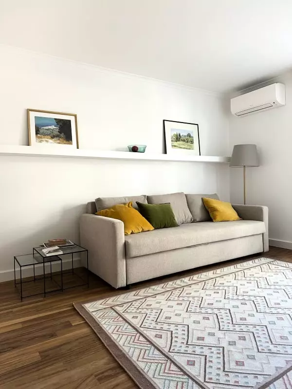 A living room with a comfortable 160 cm convertible sofa, TV, air conditioning and dining table,