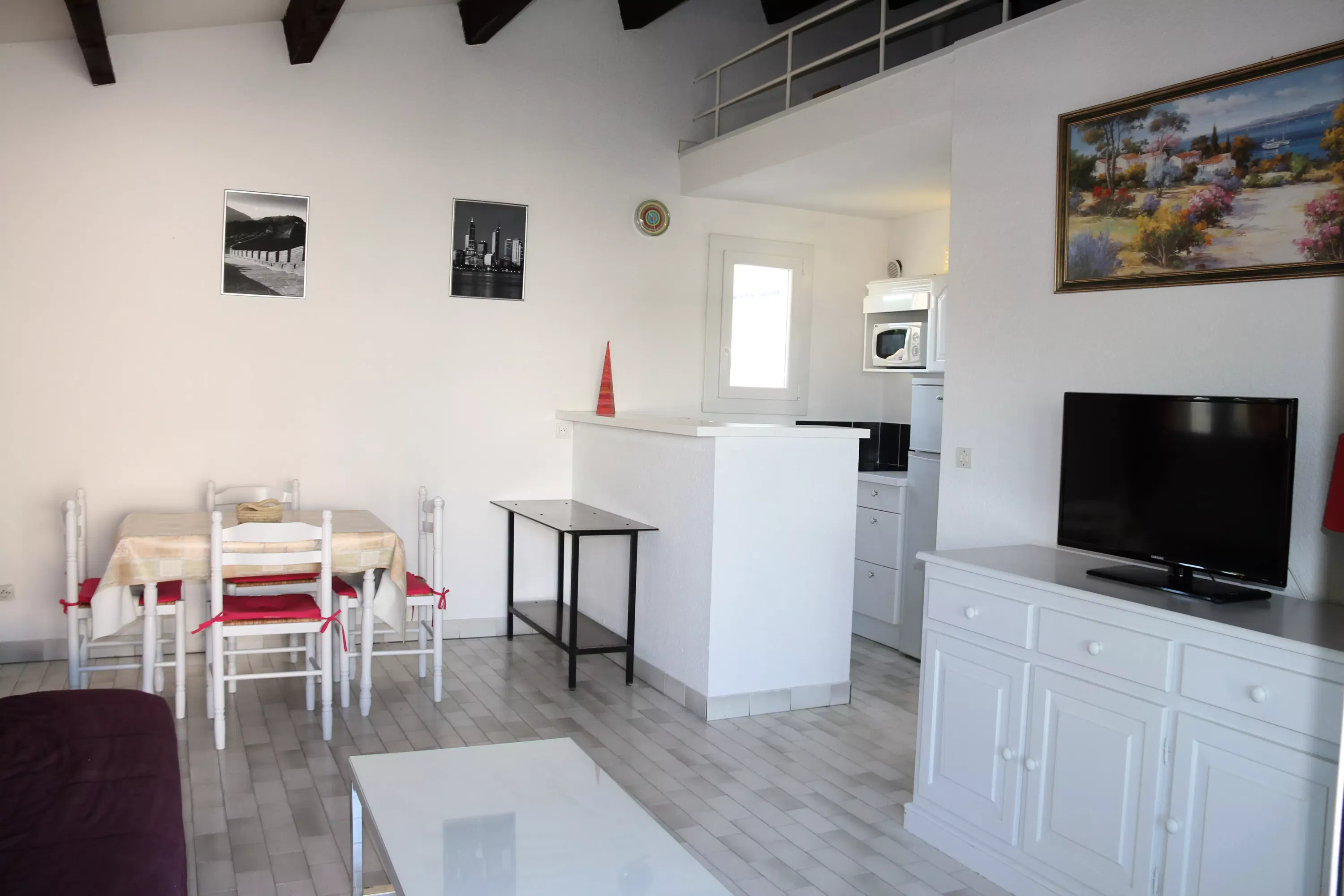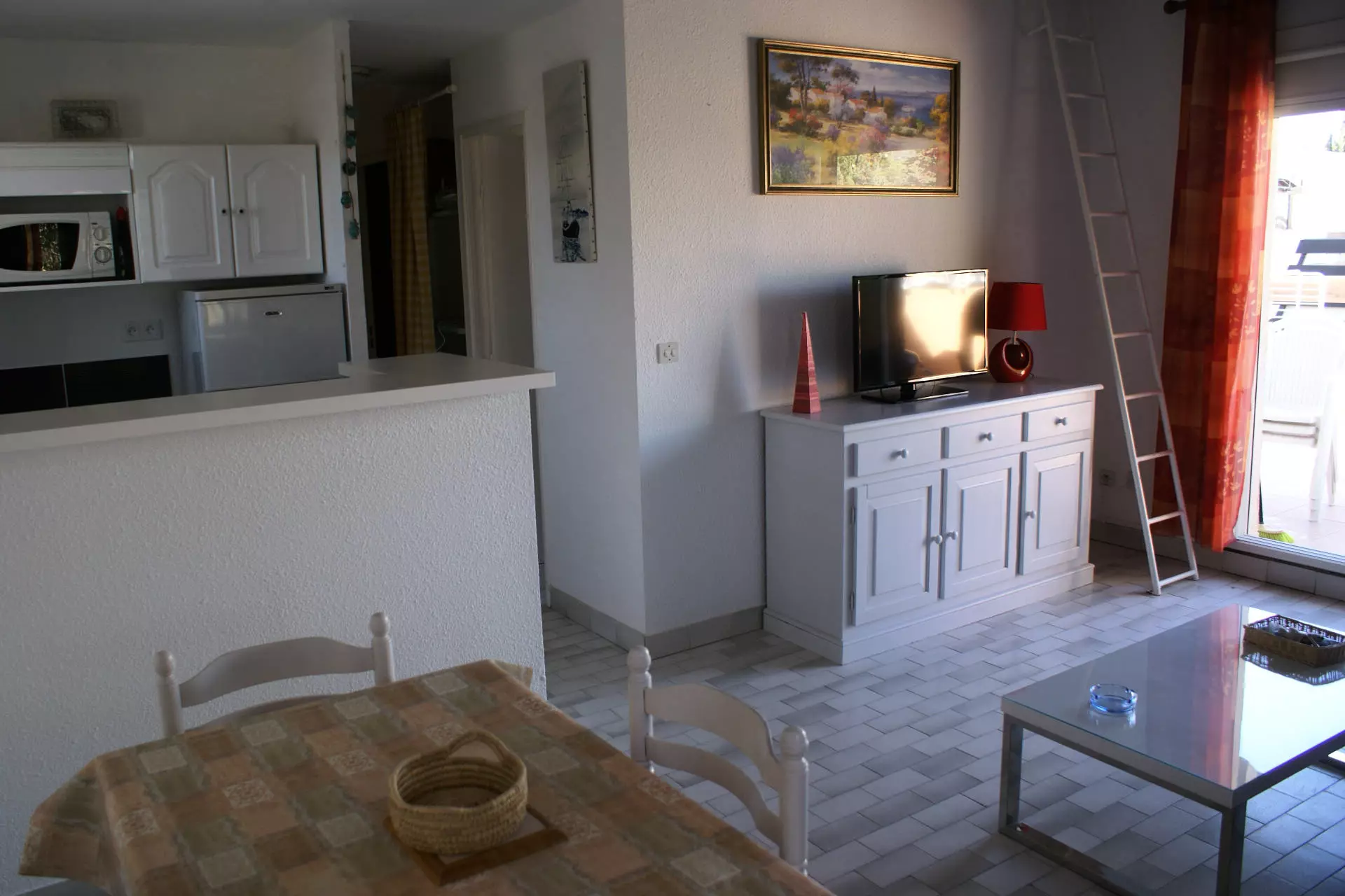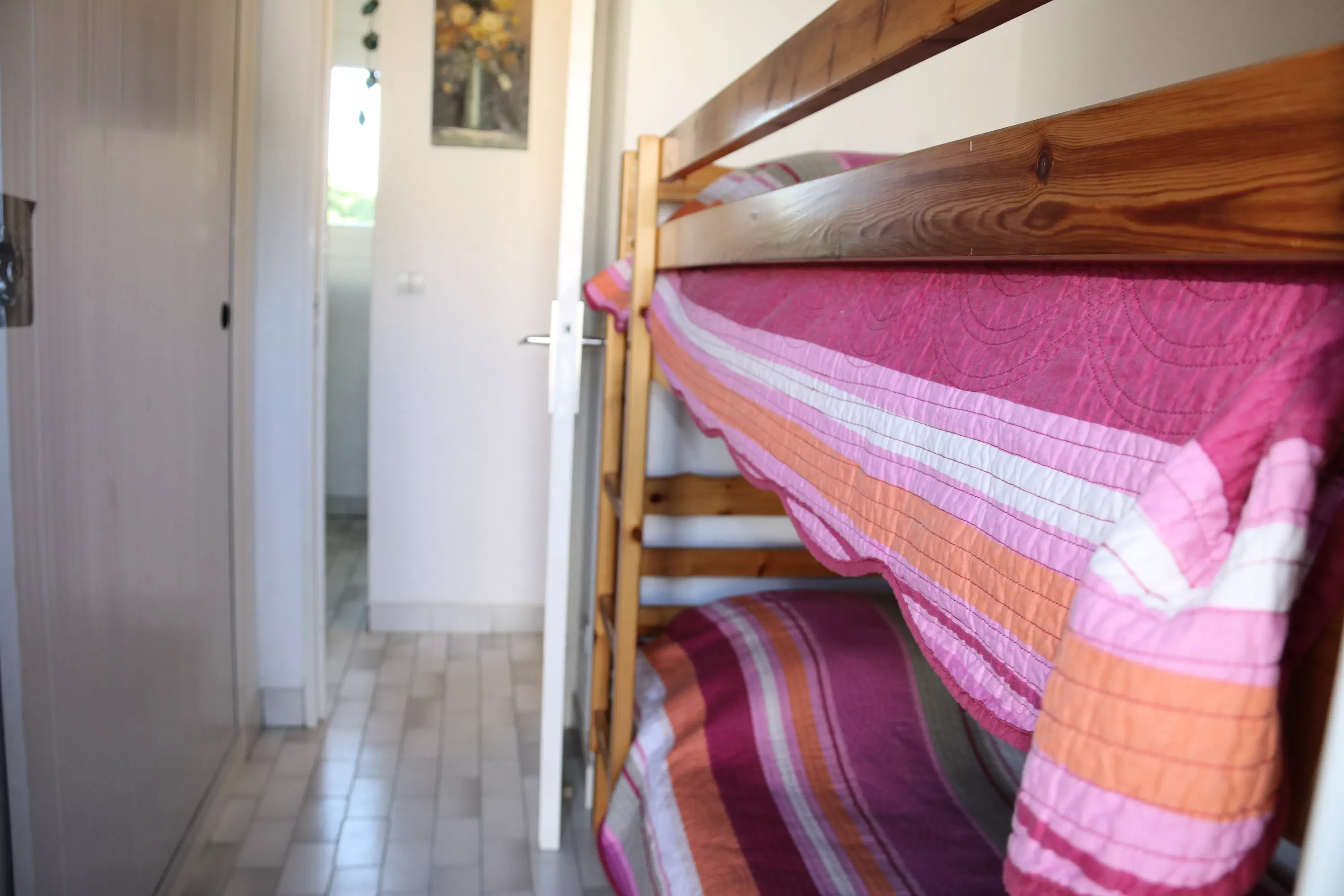 Air-conditioned apartment for 6 people, located in the Tennis Village Residence, block 18, on the 1st floor. Free access to the swimming pool. Living room with equipped kitchenette: dishwasher, washing machine and microwave. One bedroom with a 140 cm bed. A cabin with 2 bunk beds. A mezzanine with 2 twin beds. Shower room with separate toilet. Terrace with awning and barbecue. Parking N°1809.