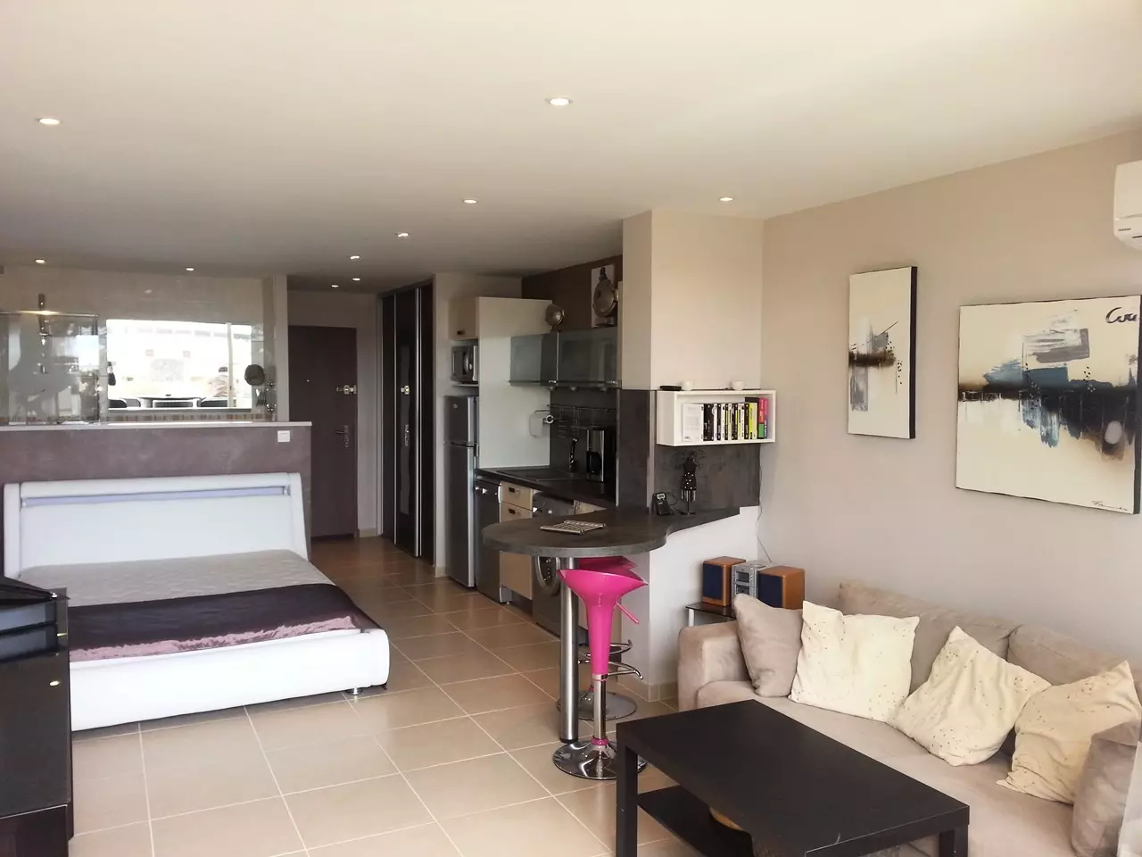 Large, beautifully appointed studio. South-facing, spacious living room opens onto a sunny terrace. The entrance features a large closet. The living room features a queen-size bed and a sofa.