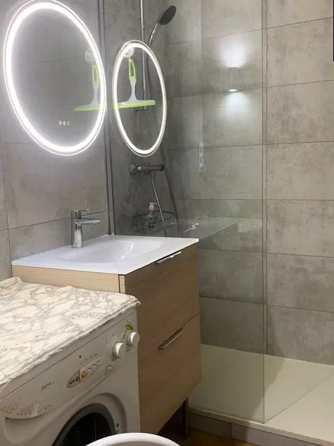 In the entrance hall there is the bathroom with a bathtub and a sink.