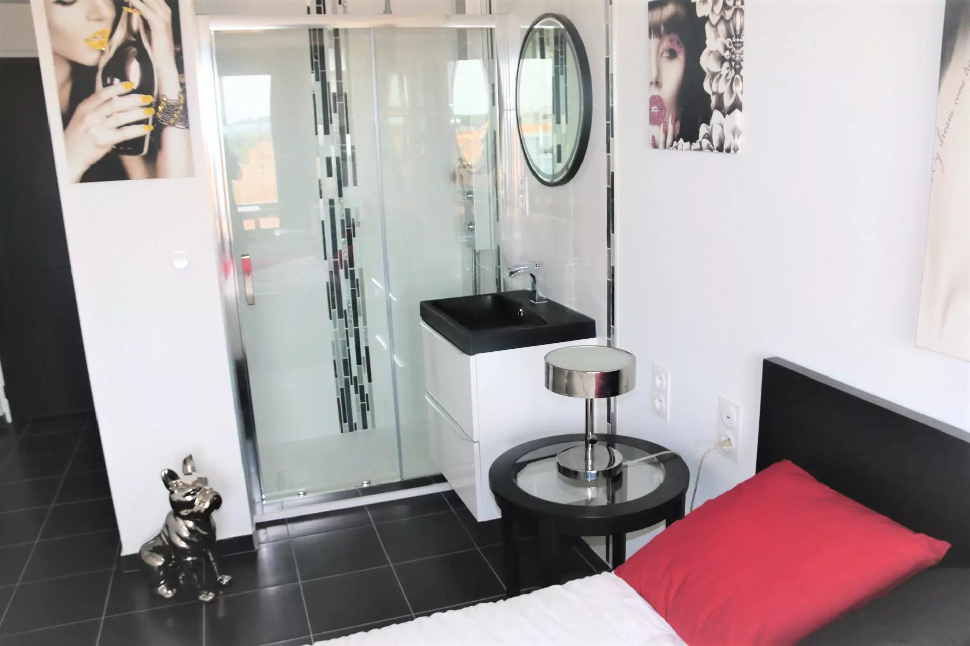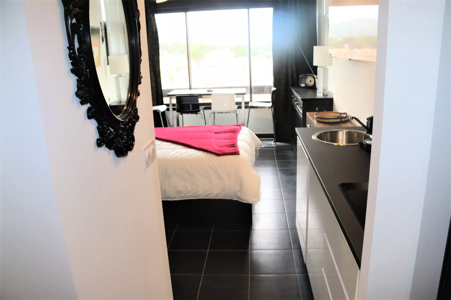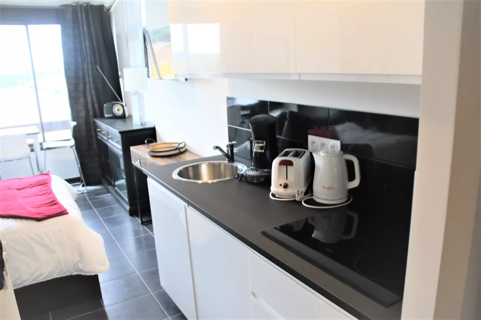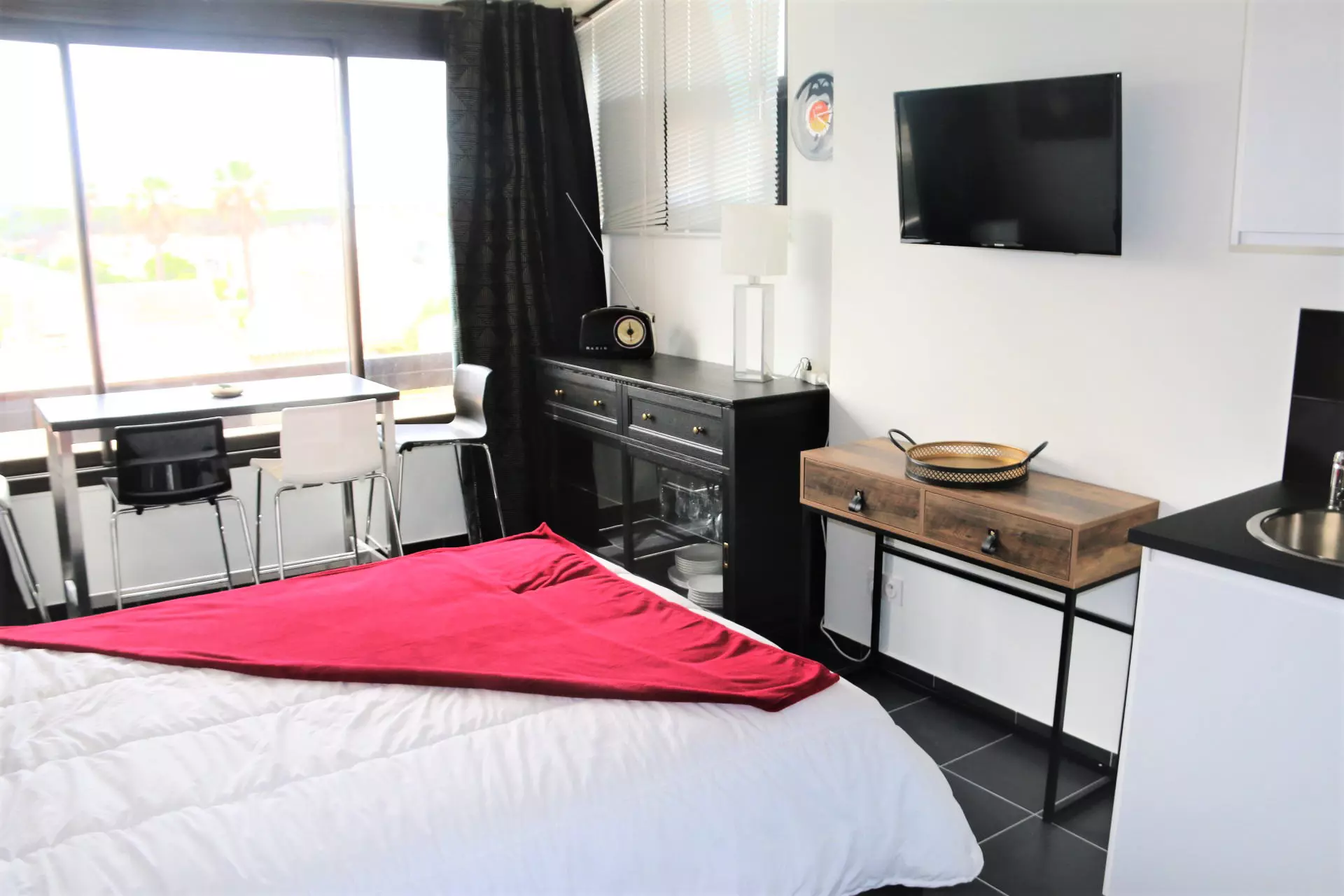 Studio for 2 people, located in the Port Vénus Residence, with free access to the swimming pool. On the 3rd floor with elevator, pool side. Living room with 140 cm bed. Kitchenette with microwave, Senséo coffee maker, toaster, and kettle. Shower room with WC. No terrace. Private parking n°R315.