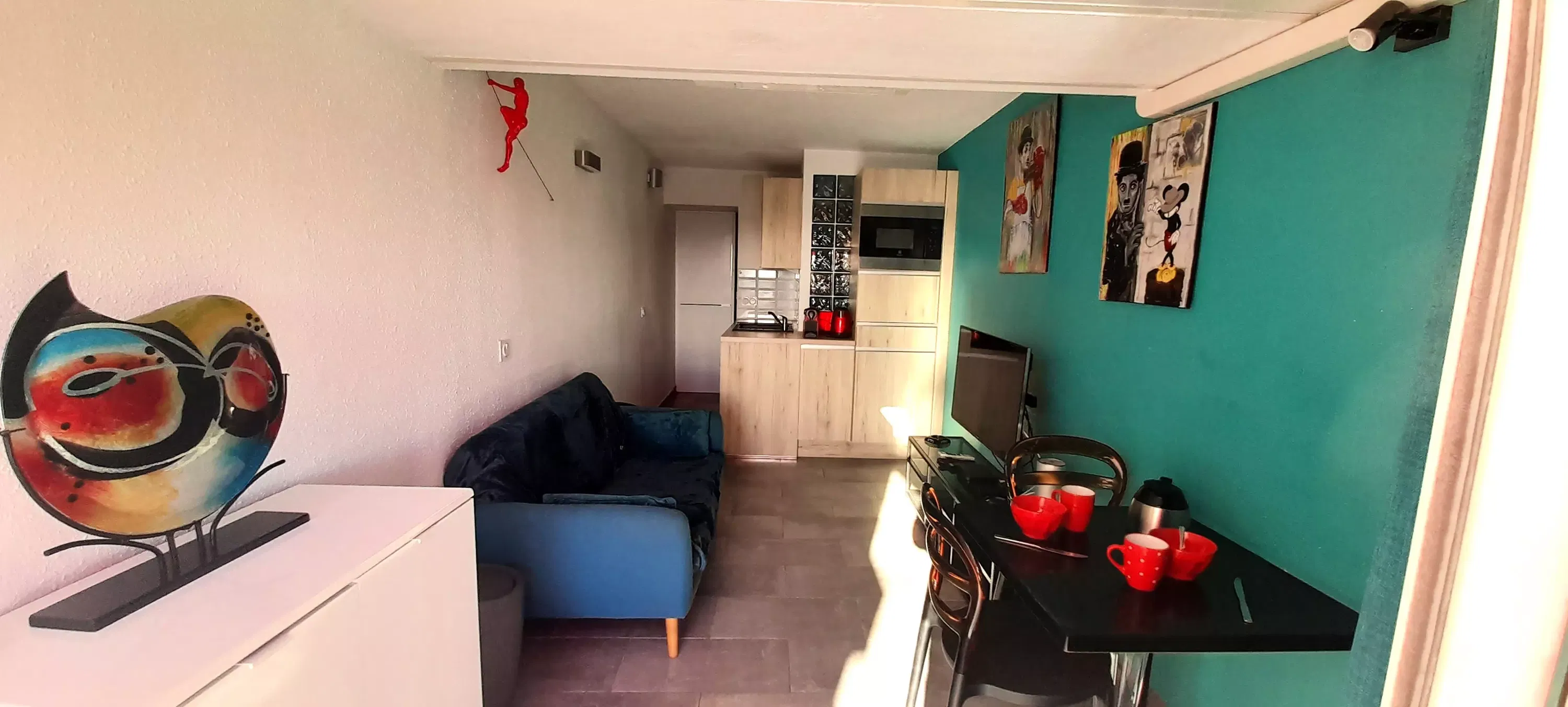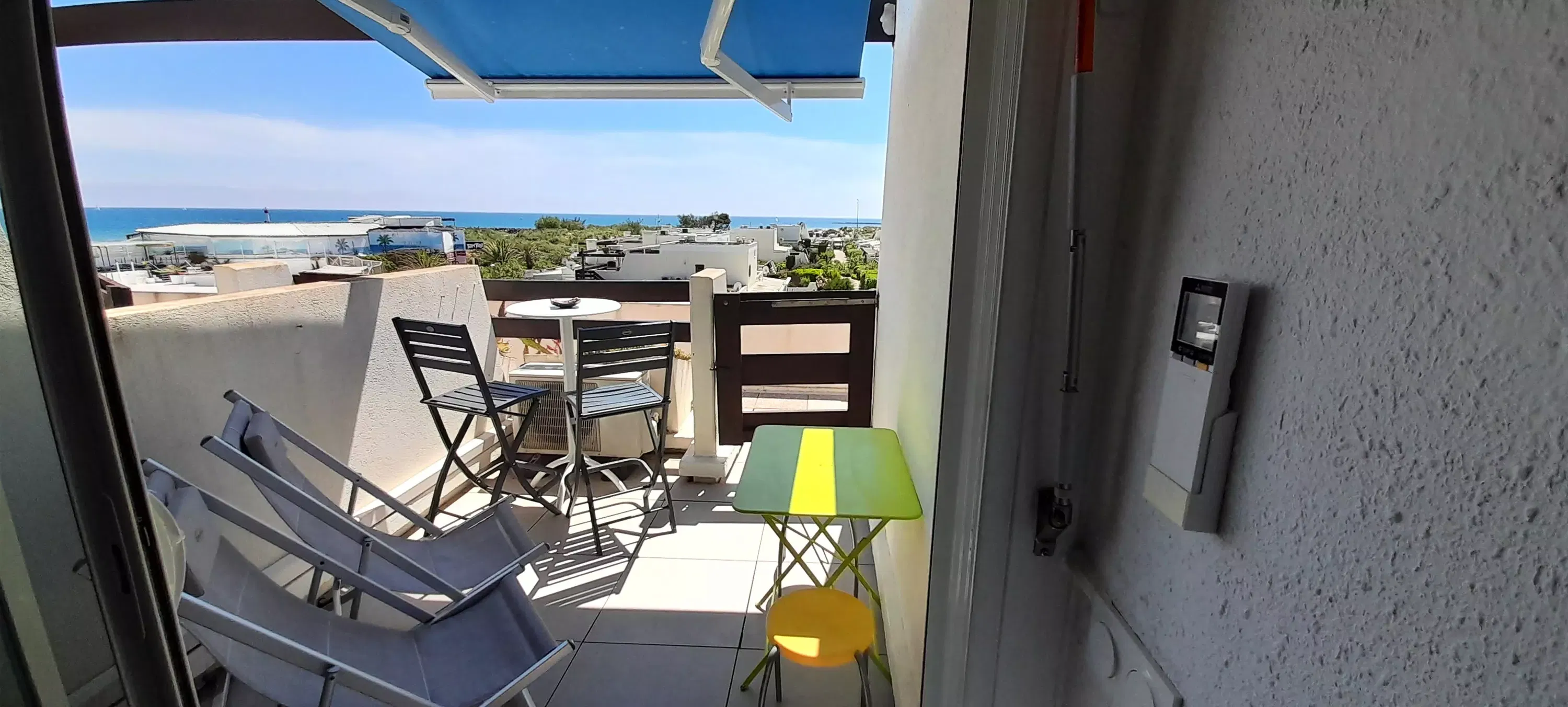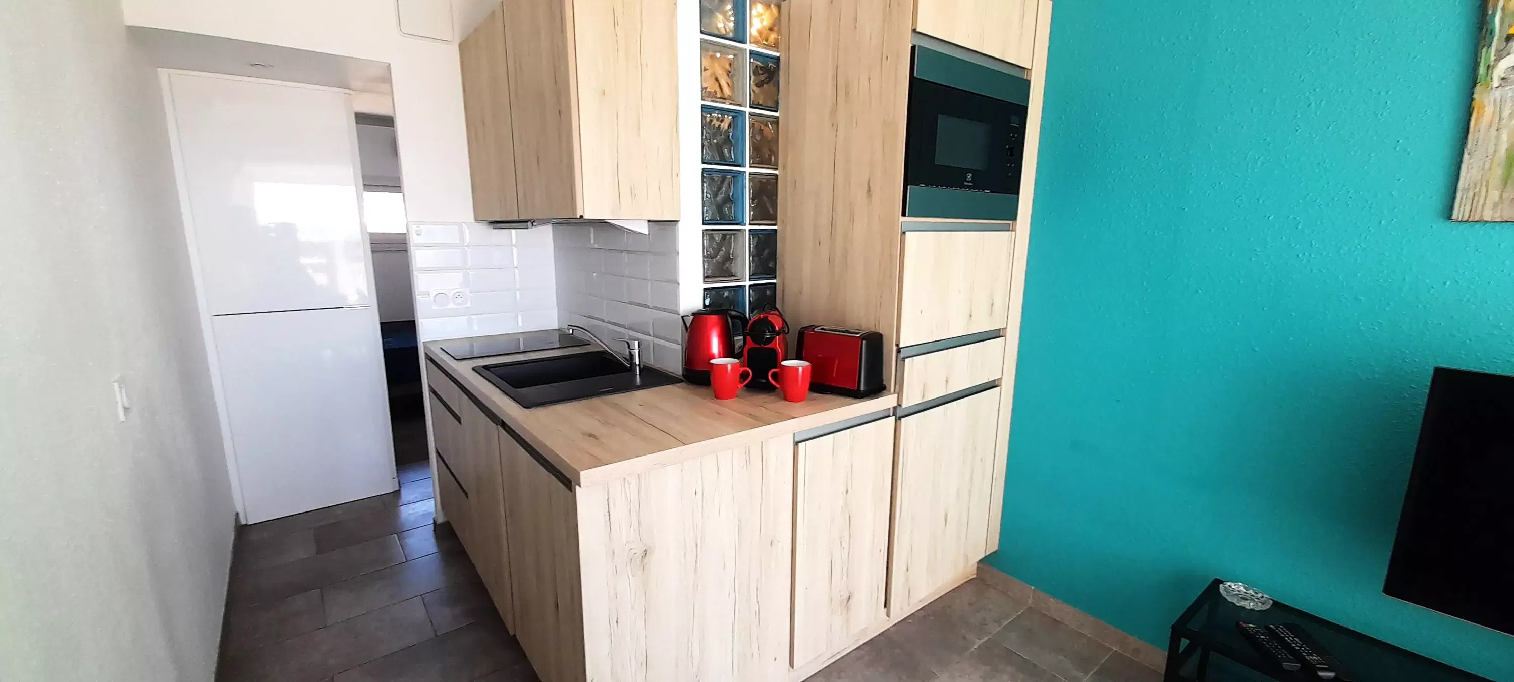 Air-conditioned apartment for 2 people in Port Nature colline 2, on the 2nd floor without elevator, along the corridor. South orientation. A small bedroom with a 140 cm bed. Kitchenette with large refrigerator, microwave, Nespresso and filter coffee machine, kettle, toaster, television, safe, vacuum cleaner, small washing machine and hairdryer. Sea view. Terrace and awning. WIFI. Parking n° 21.