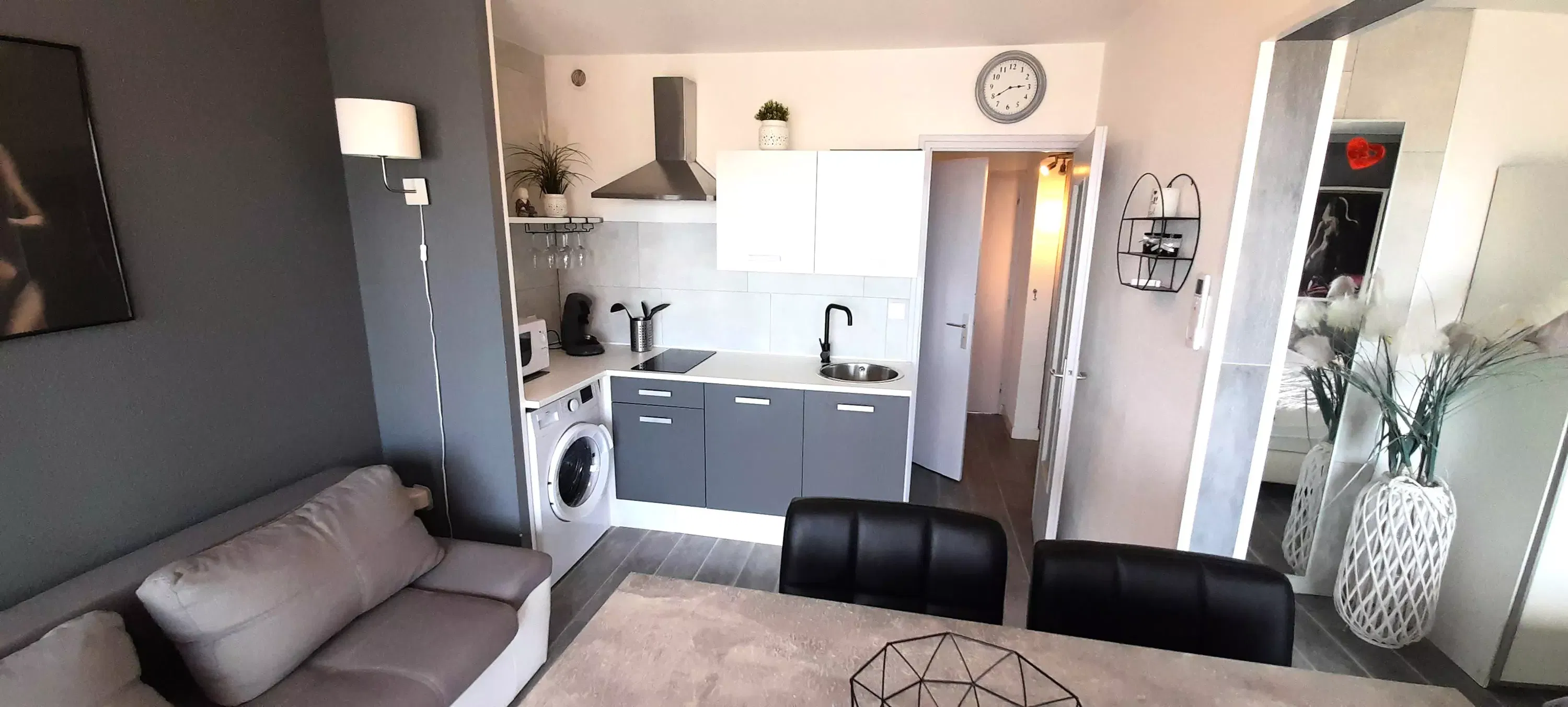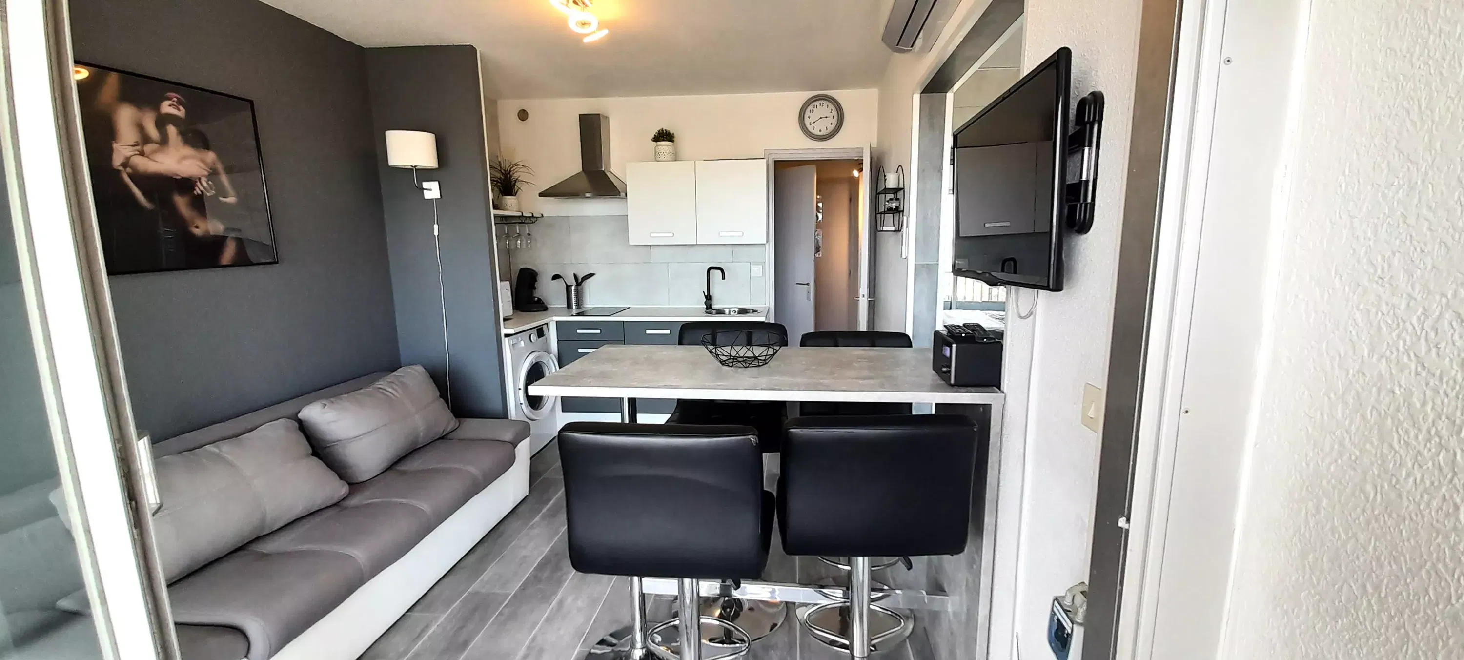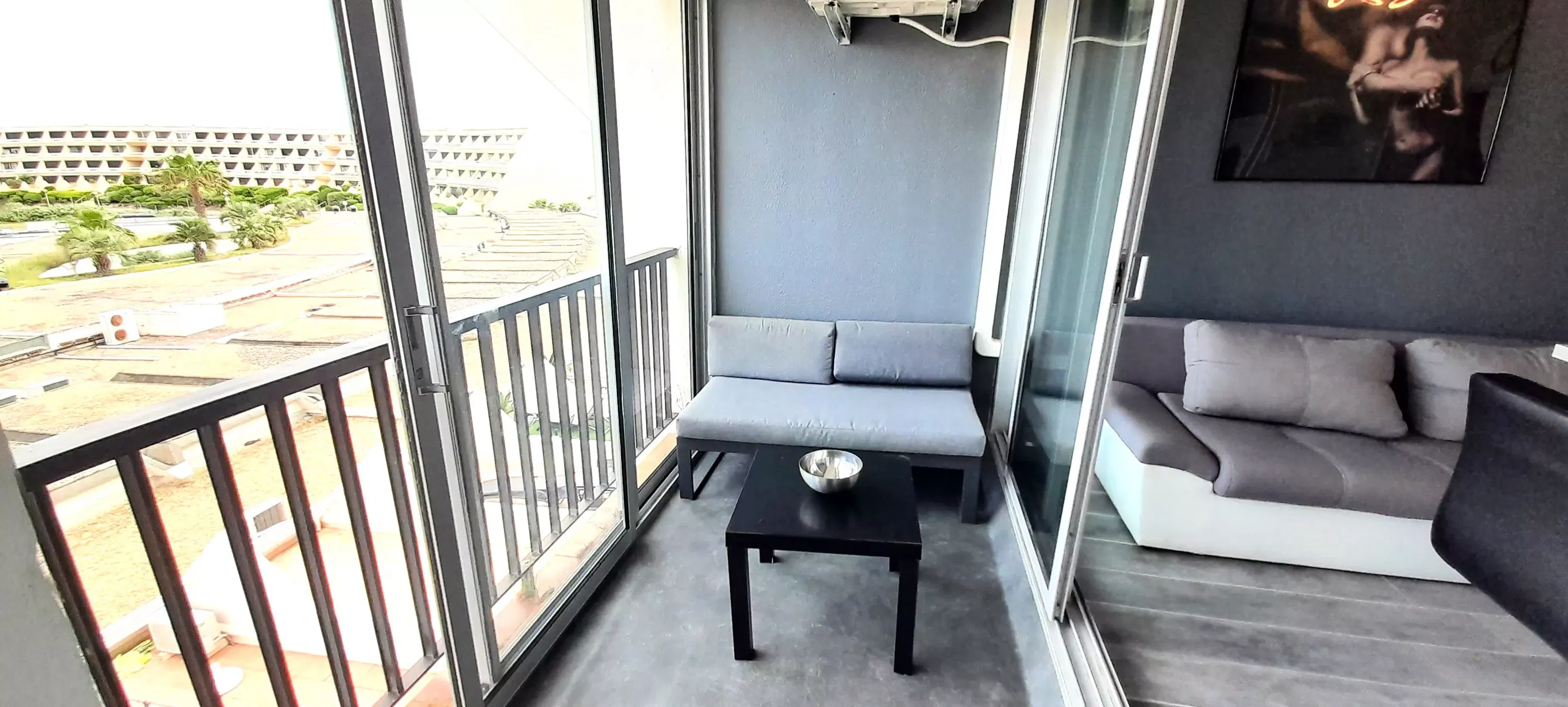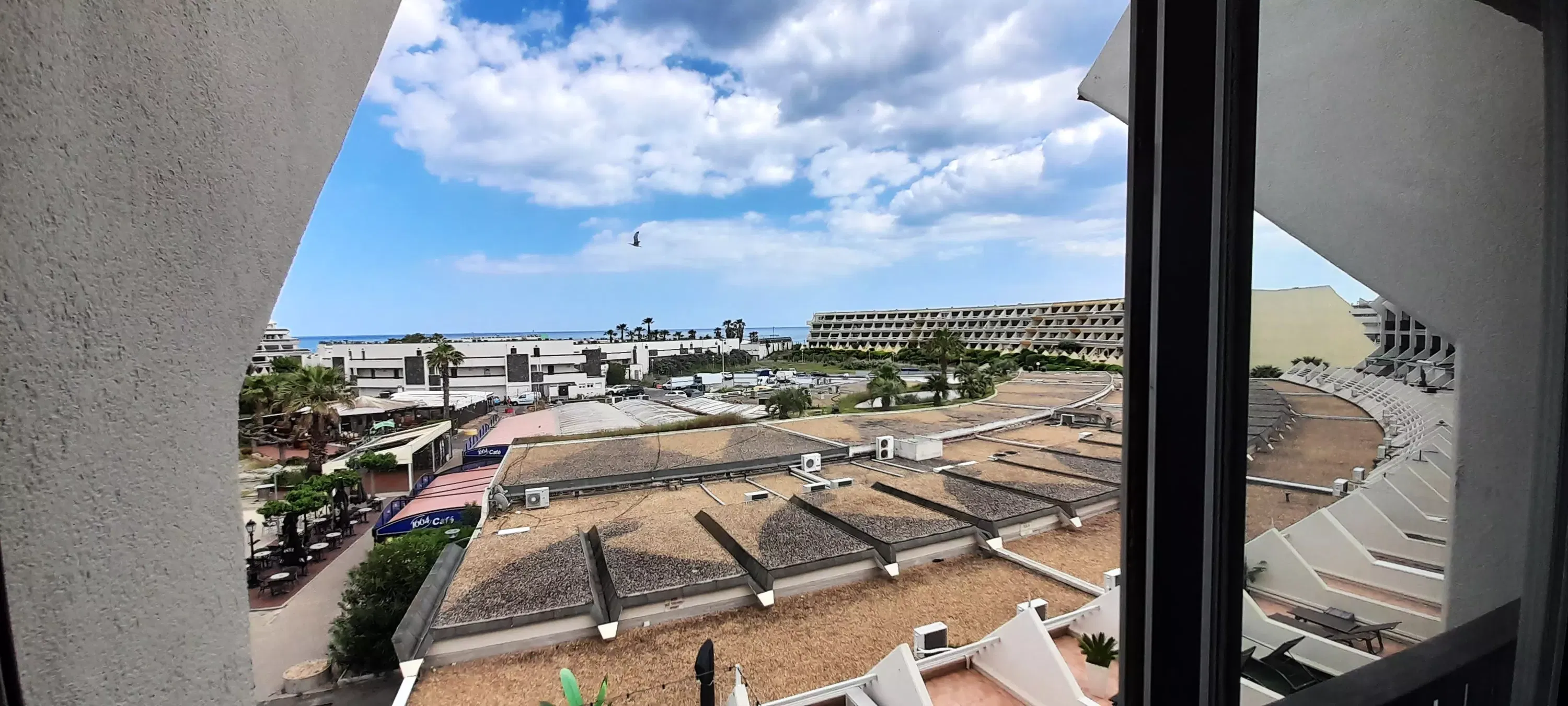 Lovely air-conditioned apartment for 4 people, located in Héliopolis, FGH entrance, on the 3rd floor without elevator. Living room with kitchenette with microwave, coffee maker, Senséo, kettle, vacuum cleaner, washing machine. Bedroom area with a 160 cm bed. A sofa in the living room. Shower room, separate WC. 2 connecting balconies. (10 m²). Parking n° 30.