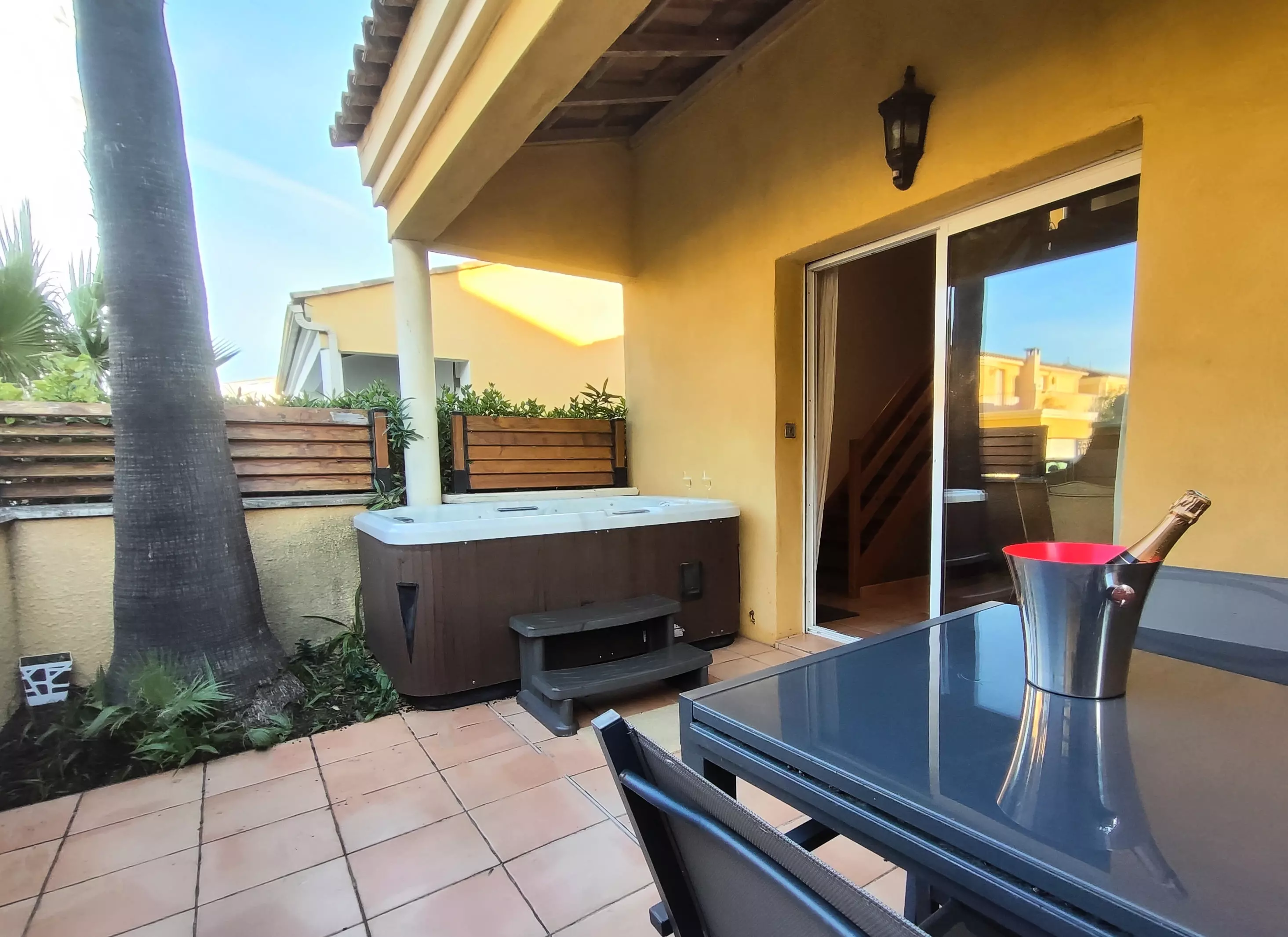 Air-conditioned villa for 4 people located in the Le Jardin de la Palmeraie residence. On the ground floor: equipped kitchen area, living room, terrace with jacuzzi (in season). Bedroom with 160cm bed. Mezzanine with sofa bed. Shower room, separate toilet. Private parking.