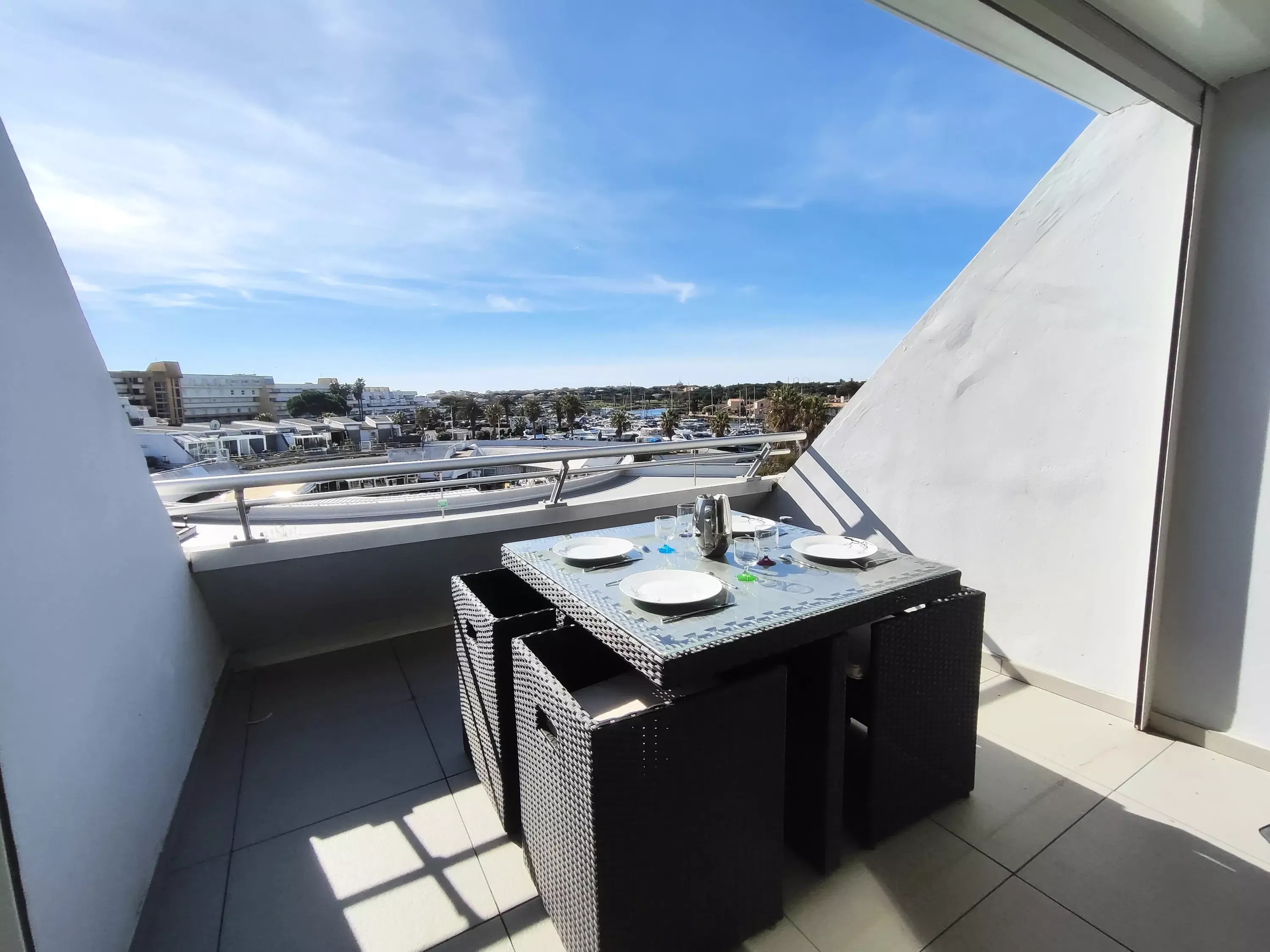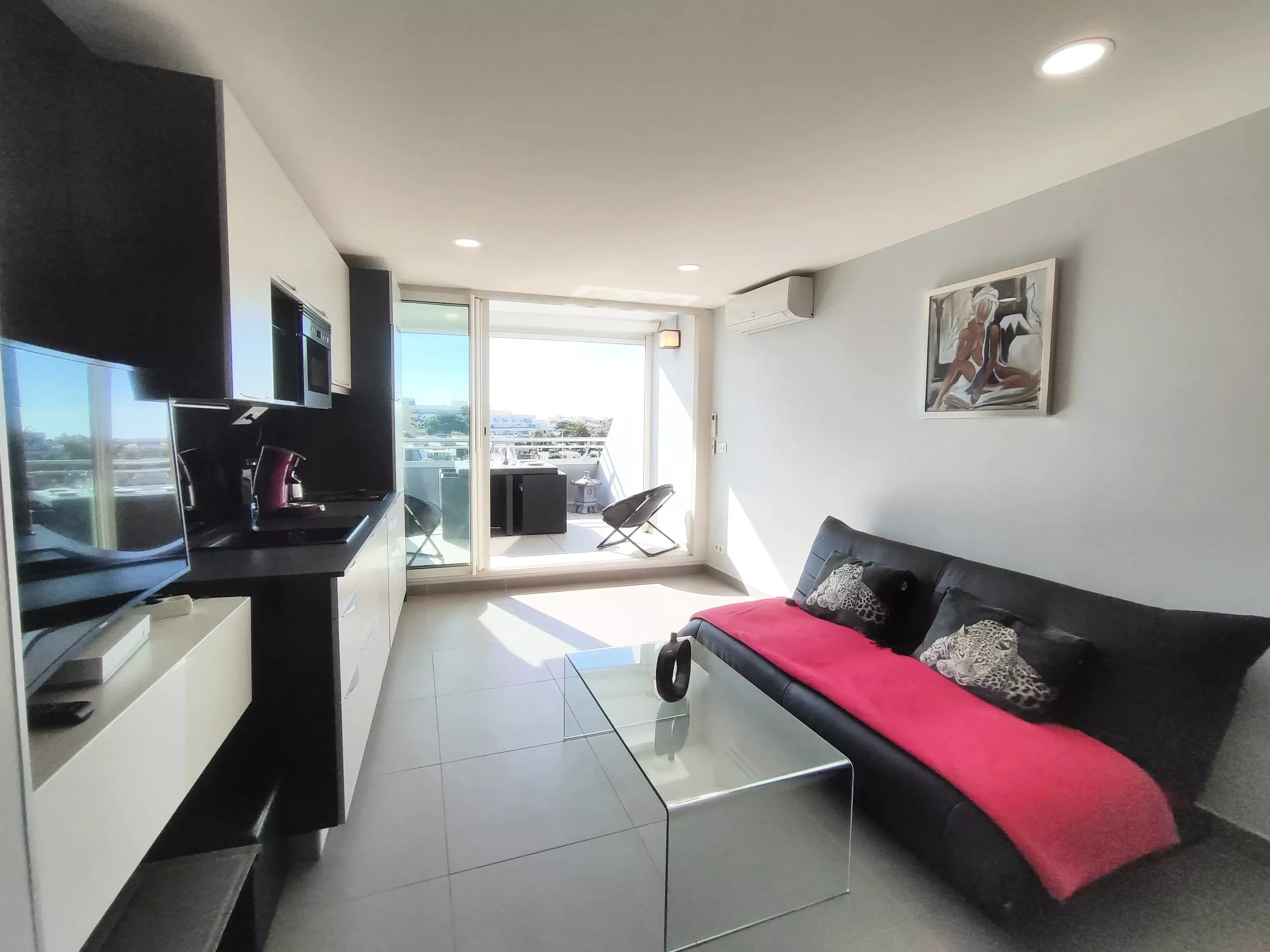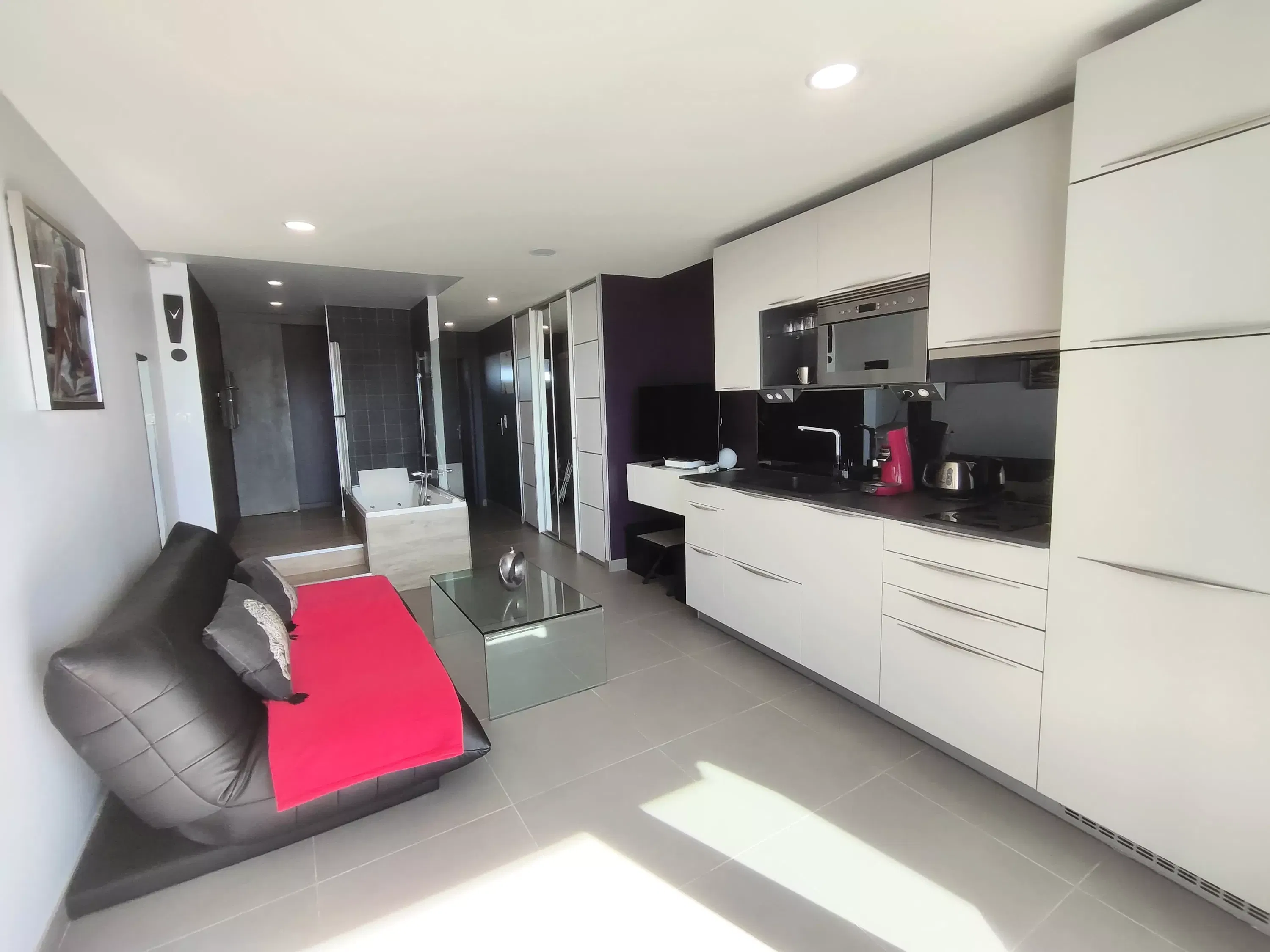 Air-conditioned apartment for 2 people, located in the Port Ambonne Residence. Bathroom with a whirlpool tub opens onto the living room. Equipped kitchen area (dishwasher, washing machine, microwave, oven, coffee maker, etc.)