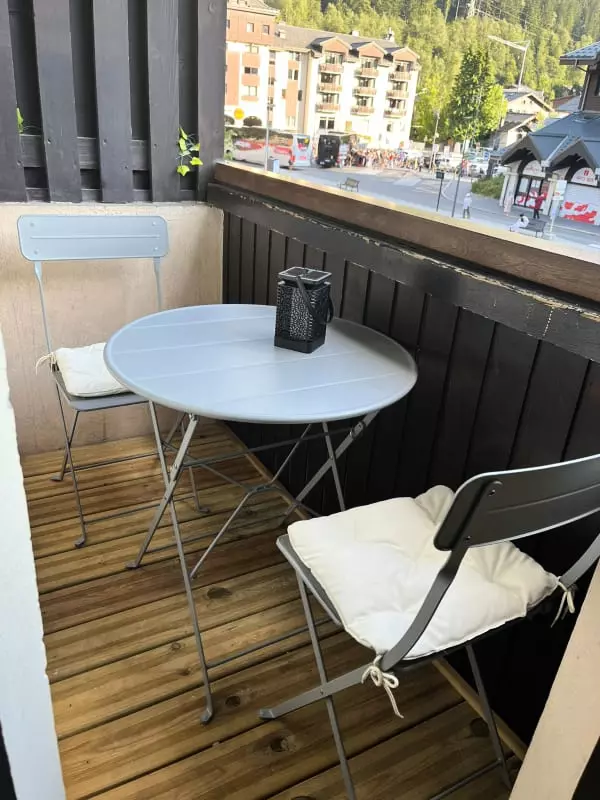 - small terrace overlooking Mont-Blanc with two chairs and a bistro table.