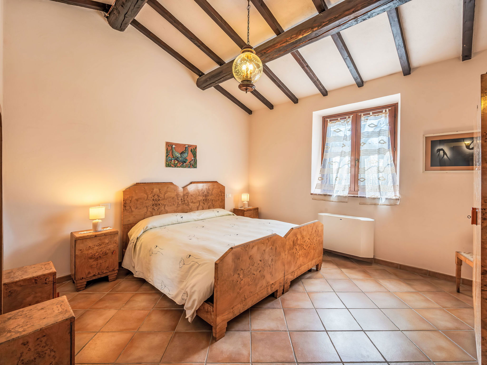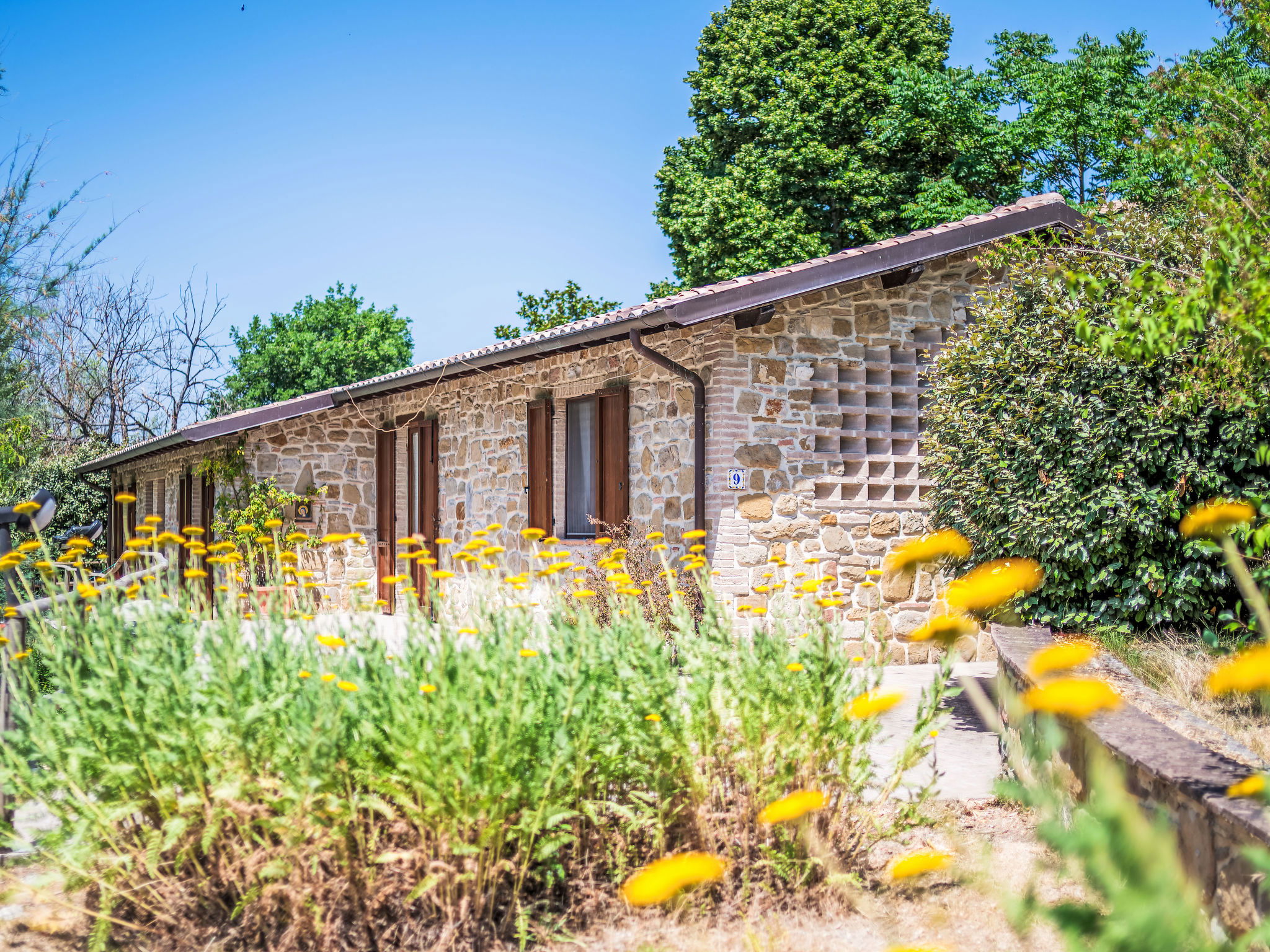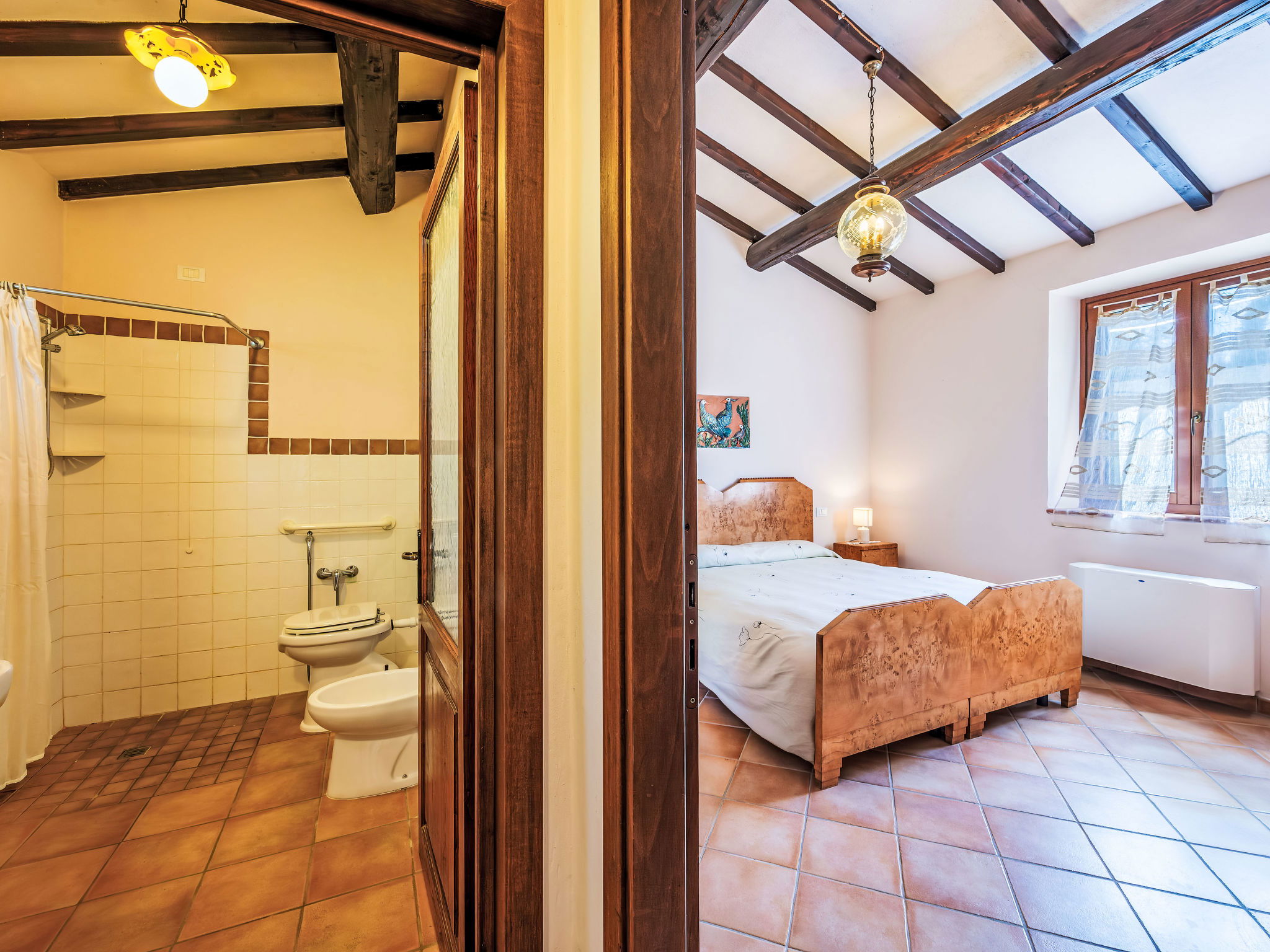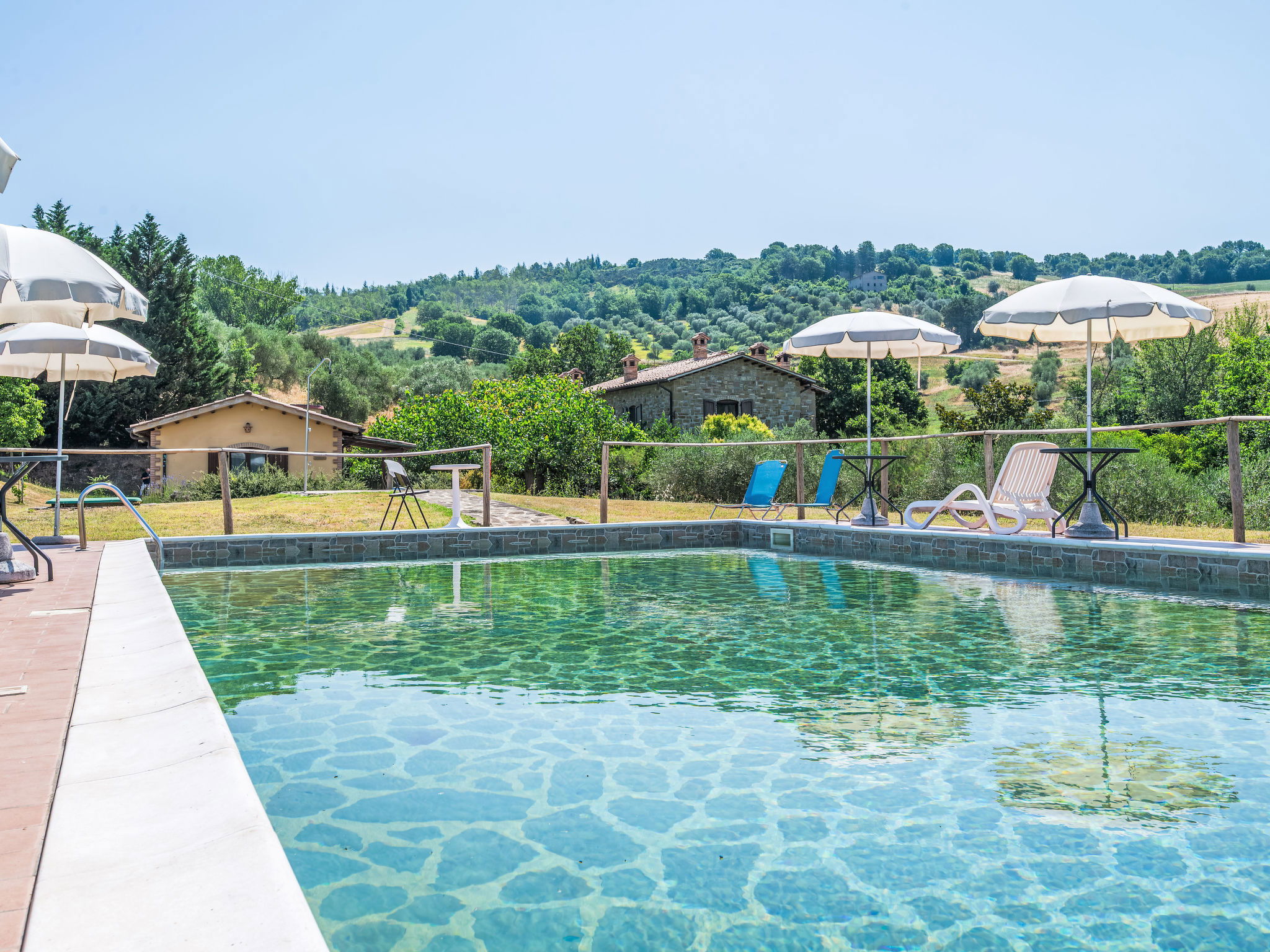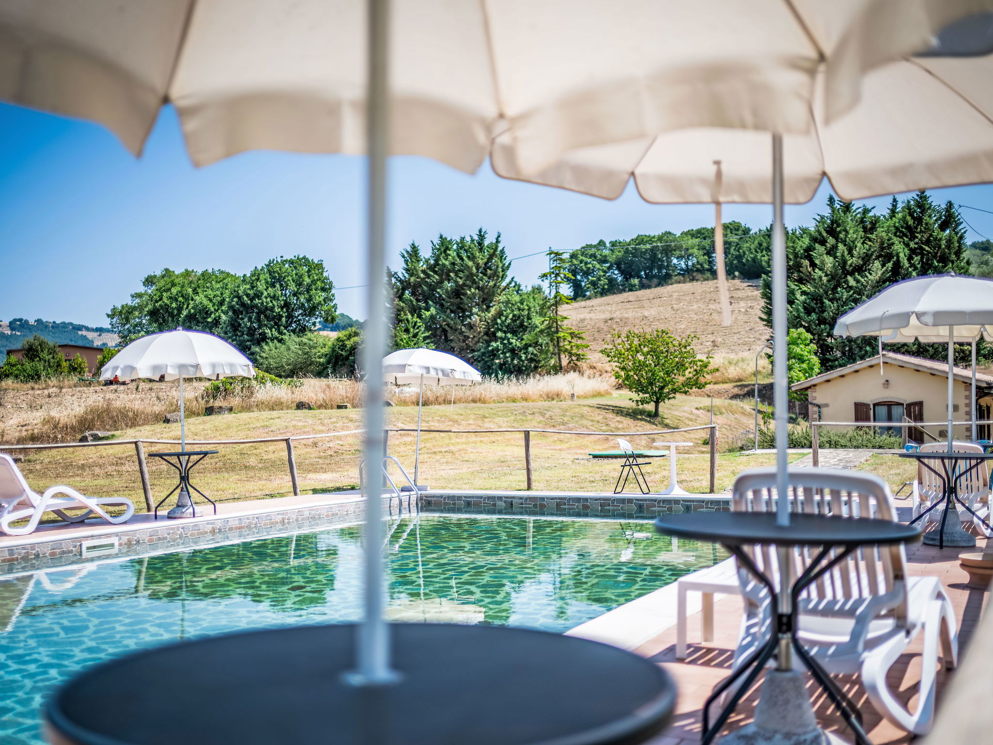 Cosy, comfortable working farm "Giuncheto". For shared use: property 40 ha, garden 1 ha, swimming pool (6 x 12 m, depth 140 cm, seasonal availability: 15.May. - 30.Sep.). Outdoor shower. 500 m long bumpy motor access. Parking on the premises. Grocery 5 km, supermarket 5 km, restaurant 5 km, bar 5 km, bus stop 5 km, railway station "Roma -Firenze" 22 km, bathing lake "Trasimeno" 37 km. Nearby attractions: Assisi 17 km, Gubbio 30 km, San Feliciano 38 km, Spello 36 km, Bevagna 36 km. Please note: car recommended. The owner does not accept any youth groups. Fishing [permit required]. The owner lives on the same property. The tap water has no drinking water quality.