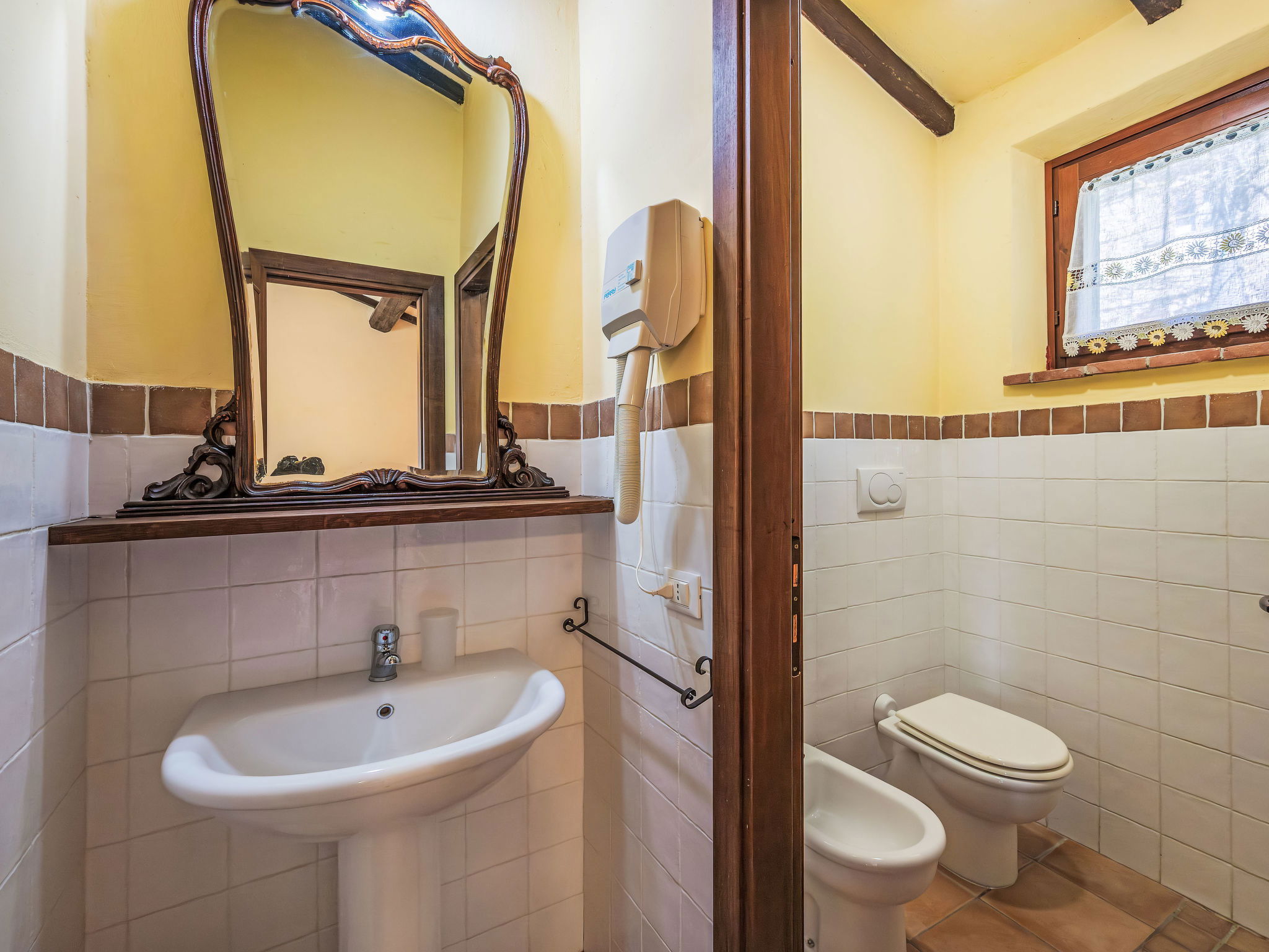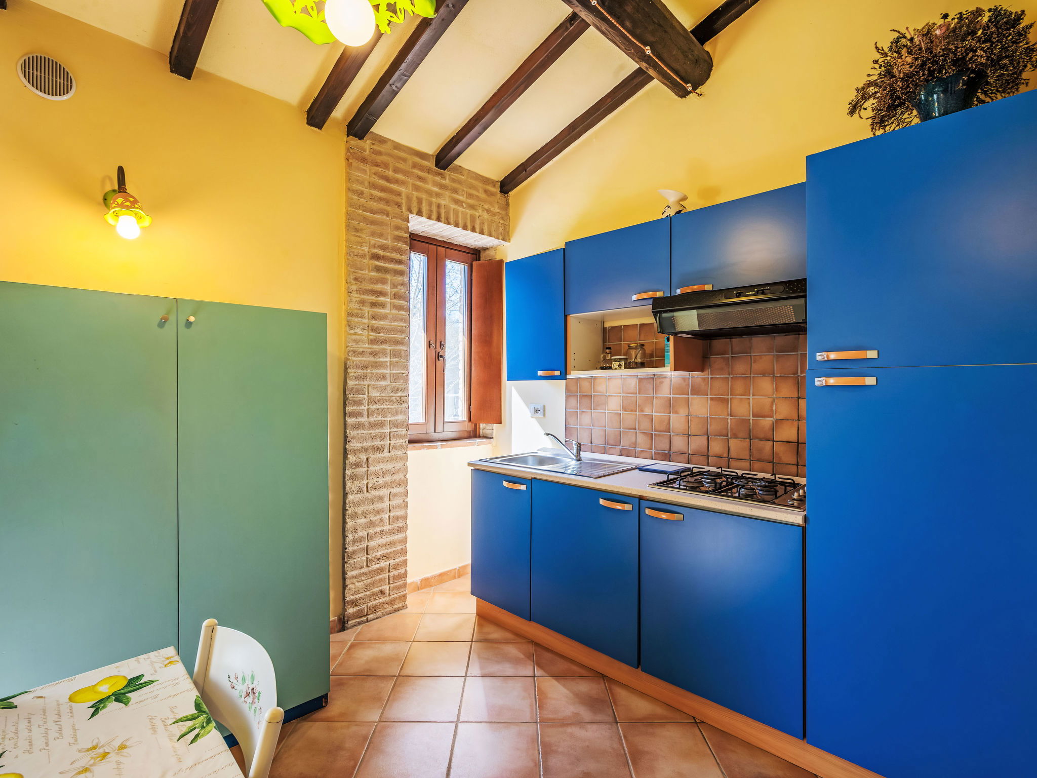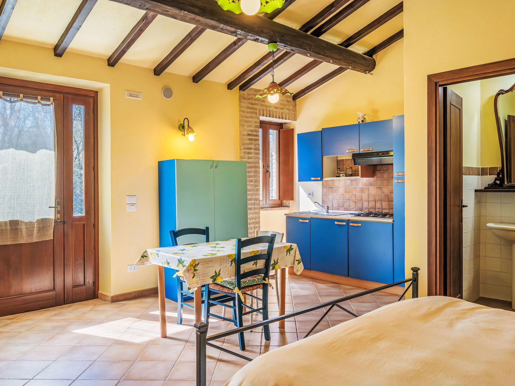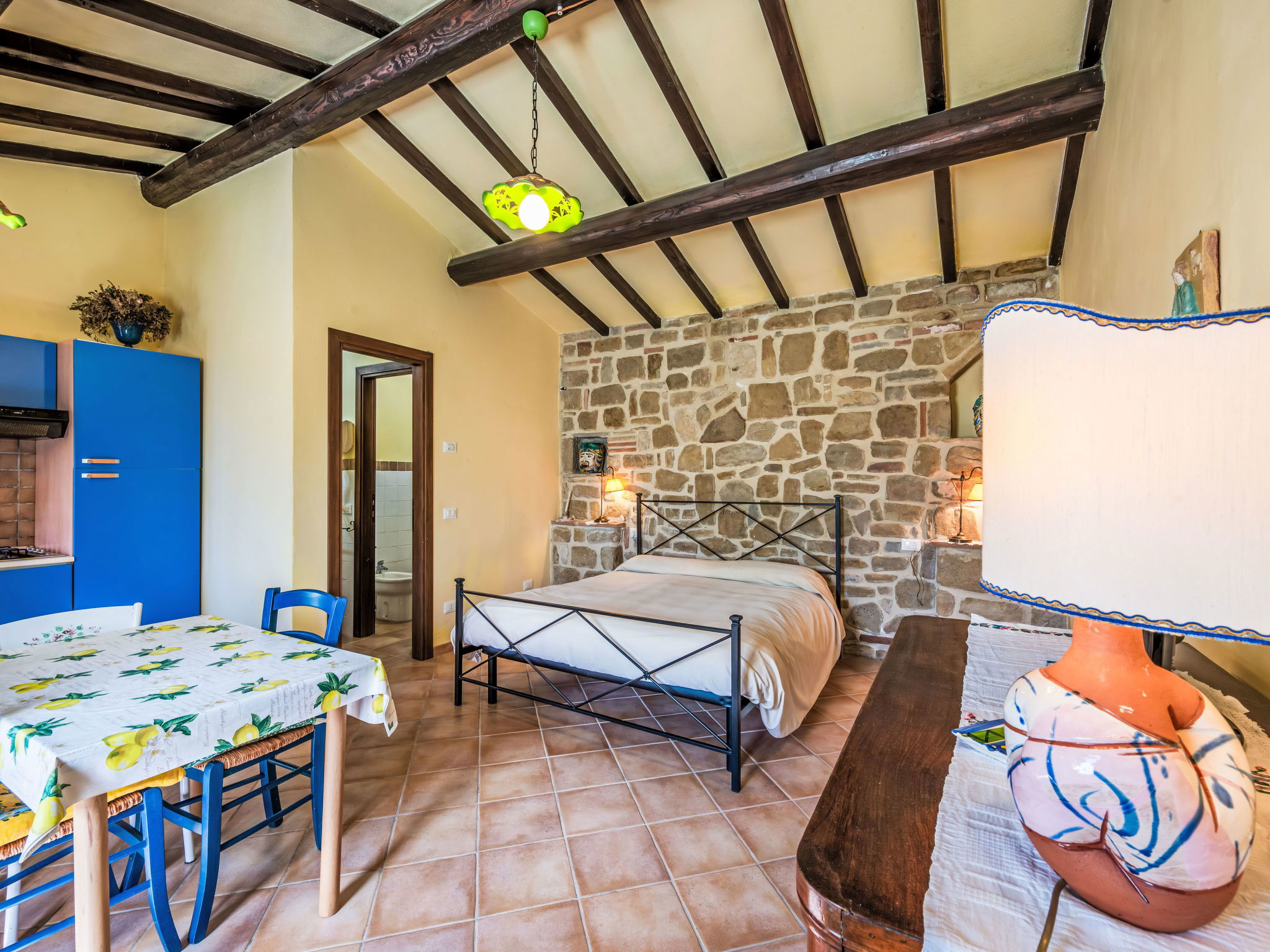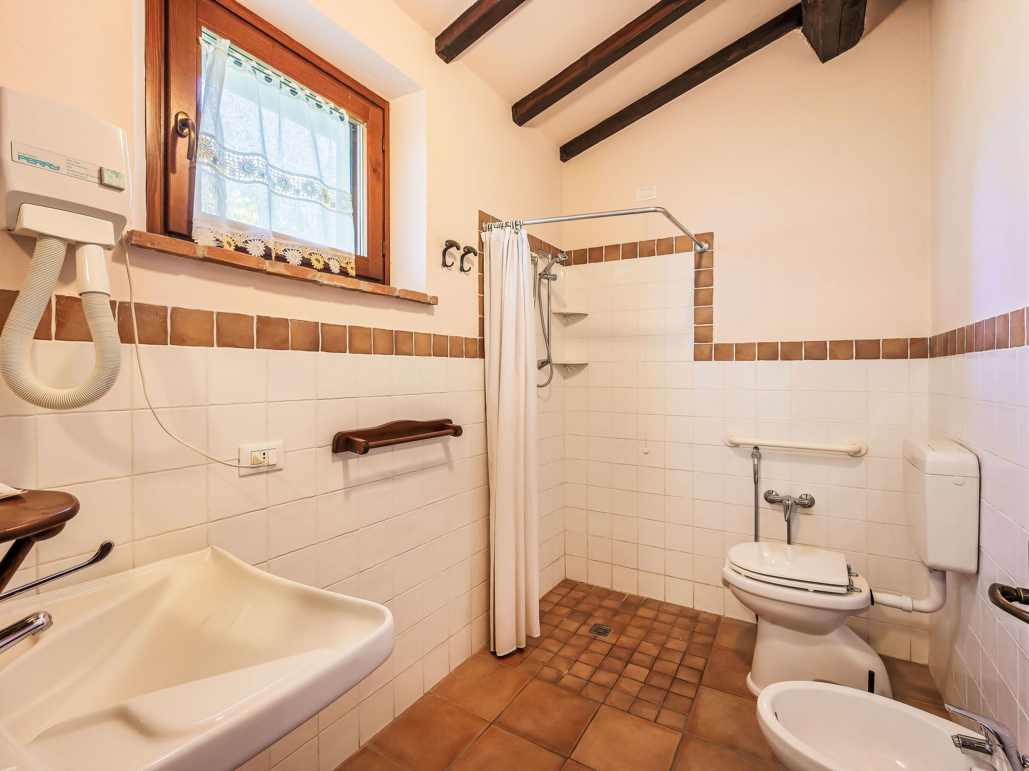 Cosy, comfortable working farm "Giuncheto". For shared use: property 40 ha, garden 1 ha, swimming pool (6 x 12 m, depth 140 cm, seasonal availability: 15.May. - 30.Sep.). Outdoor shower. 500 m long bumpy motor access. Parking on the premises. Grocery 5 km, supermarket 5 km, restaurant 5 km, bar 5 km, bus stop 5 km, railway station "Roma -Firenze" 22 km, bathing lake "Trasimeno" 37 km. Nearby attractions: Assisi 17 km, Gubbio 30 km, San Feliciano 38 km, Spello 36 km, Bevagna 36 km. Please note: car recommended. The owner does not accept any youth groups. Fishing [permit required]. The owner lives on the same property. The tap water has no drinking water quality.