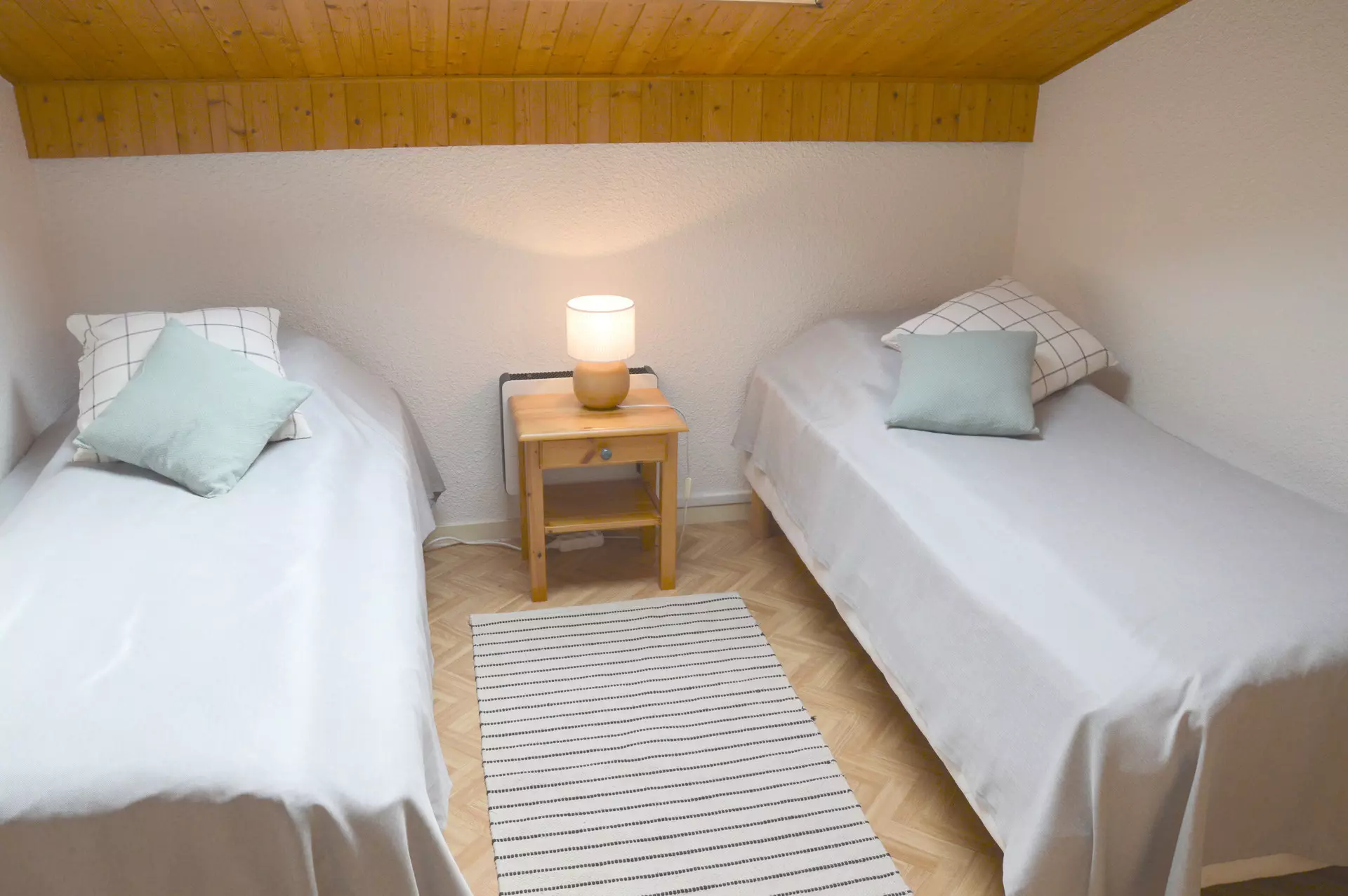 At the entrance, a mountain corner with 2 folding beds, two bedrooms with 2 single beds, a living room with a sofa bed, a bathroom, a separate toilet, a kitchen, and a balcony.