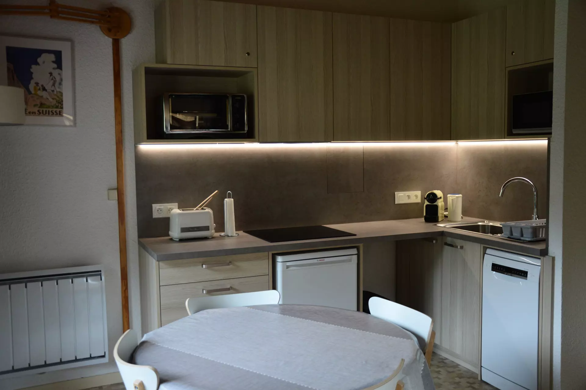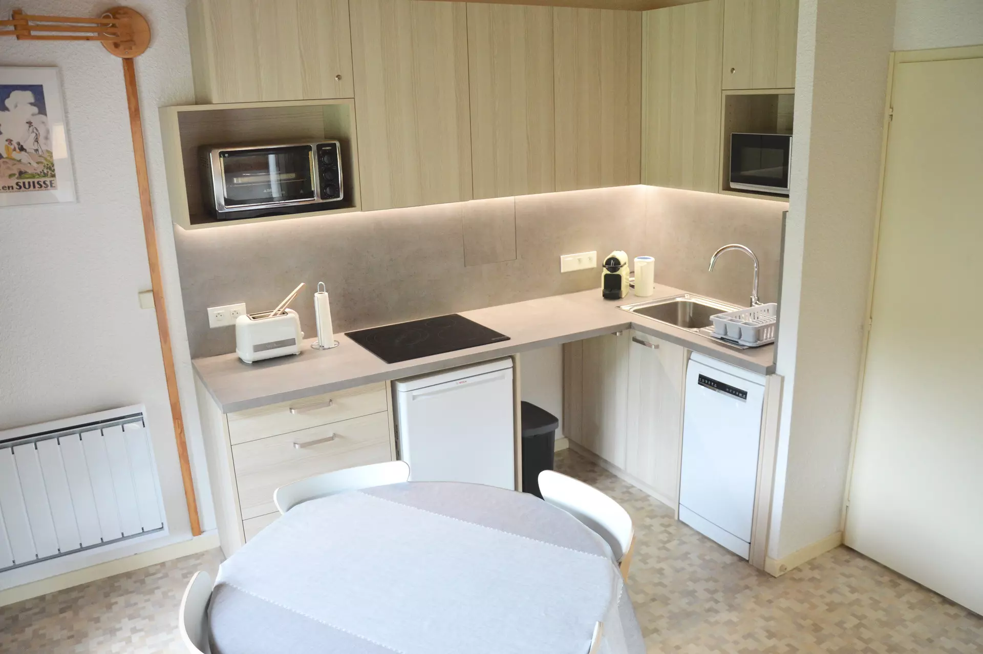 The kitchen is equipped with an induction hob, a microwave, a mini oven, a Nespresso coffee machine, a kettle, a toaster, a dishwasher, a raclette machine and a fondue set.
