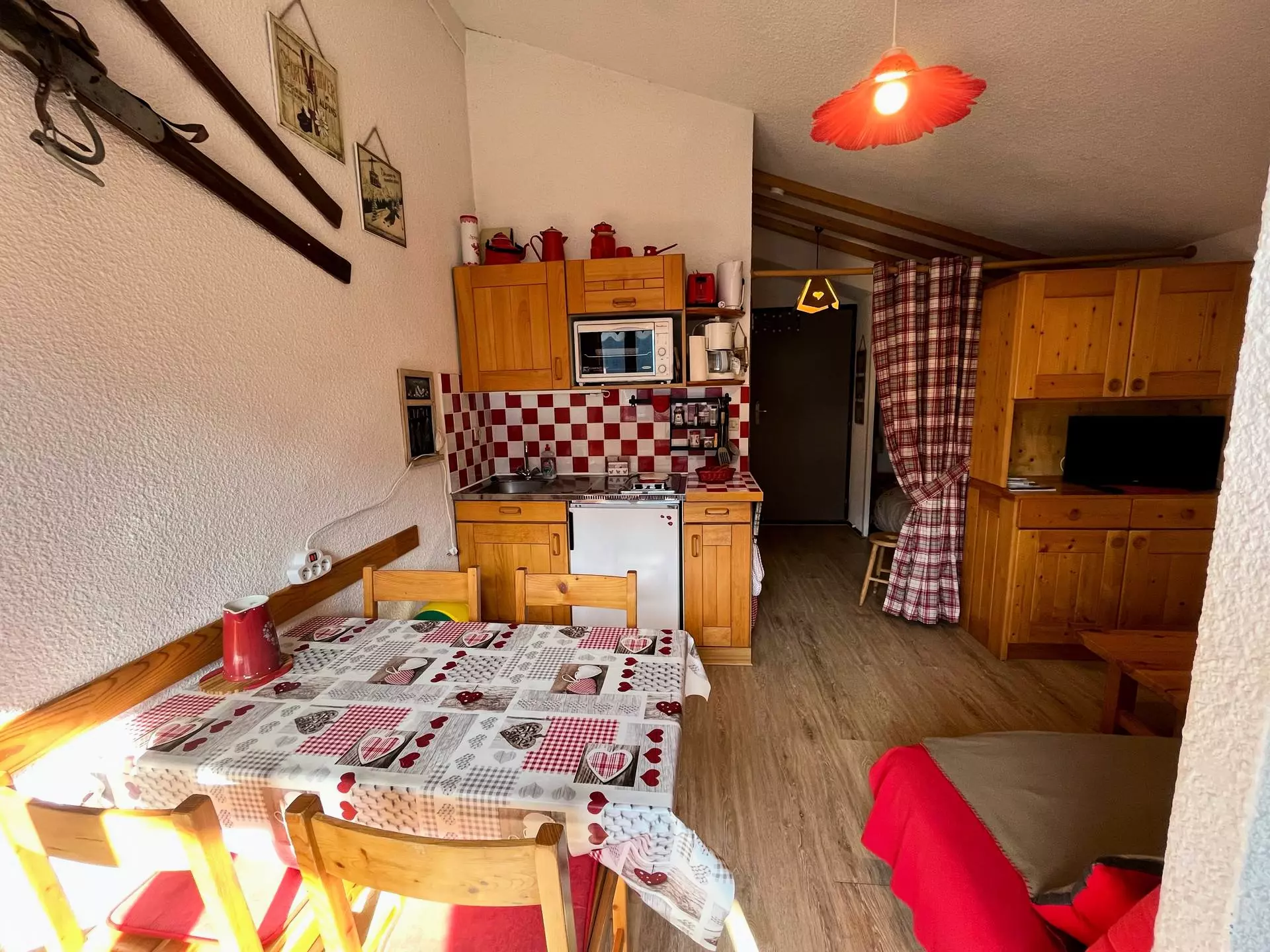 The kitchen is equipped with a hob, microwave, coffee maker, and kettle.