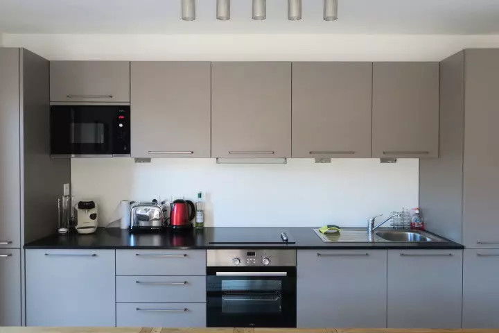 The kitchen is equipped with a hob, oven, microwave, coffee maker, kettle, toaster, and dishwasher.