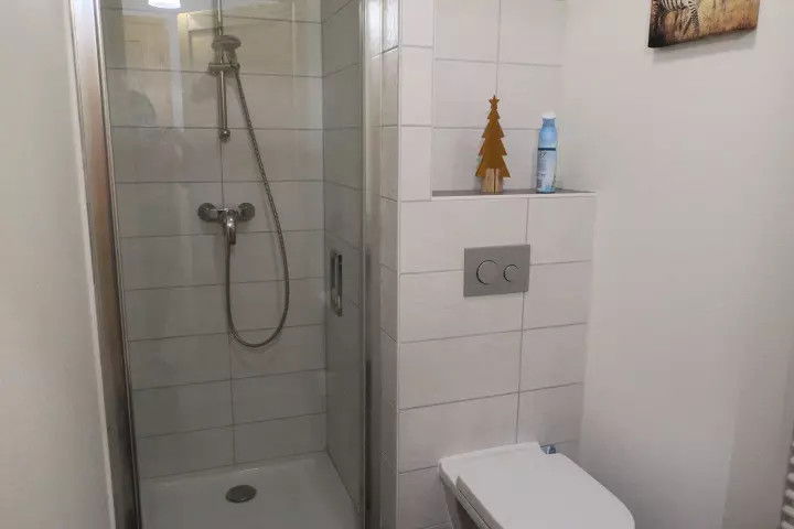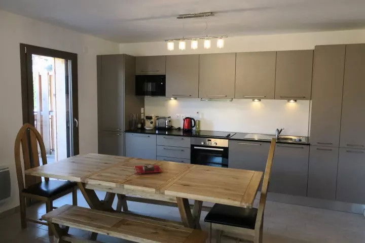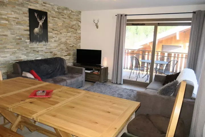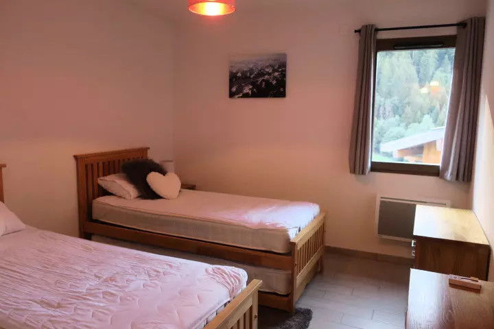 At the entrance, you will find a mountain corner with 2 bunk beds, 2 bedrooms, one with a double bed, and another with 2 single beds, there are also 2 bathrooms, one with a WC, a living room, a kitchen, and a northwest-facing terrace offering a magnificent view of the mountains and part of the village.