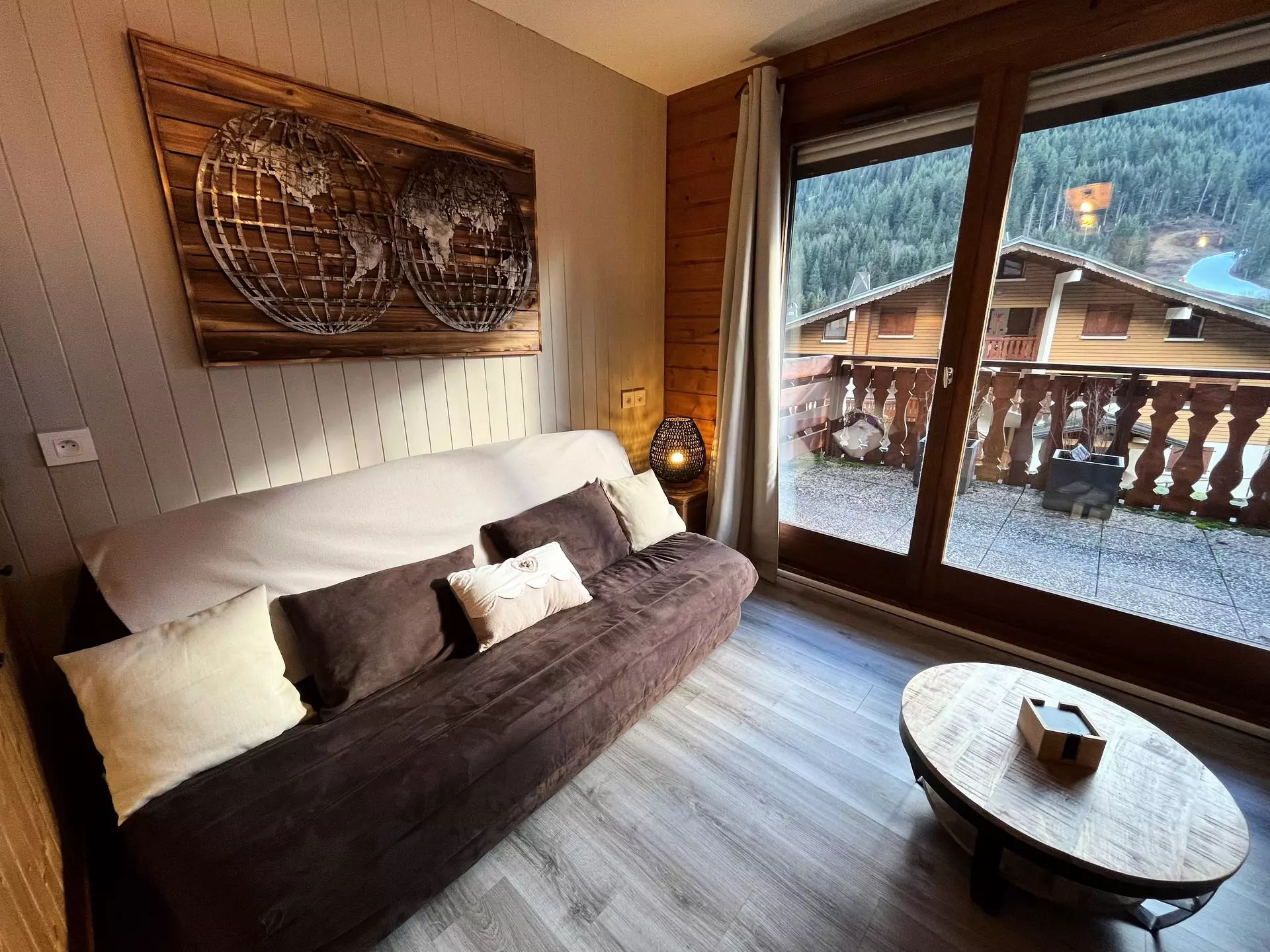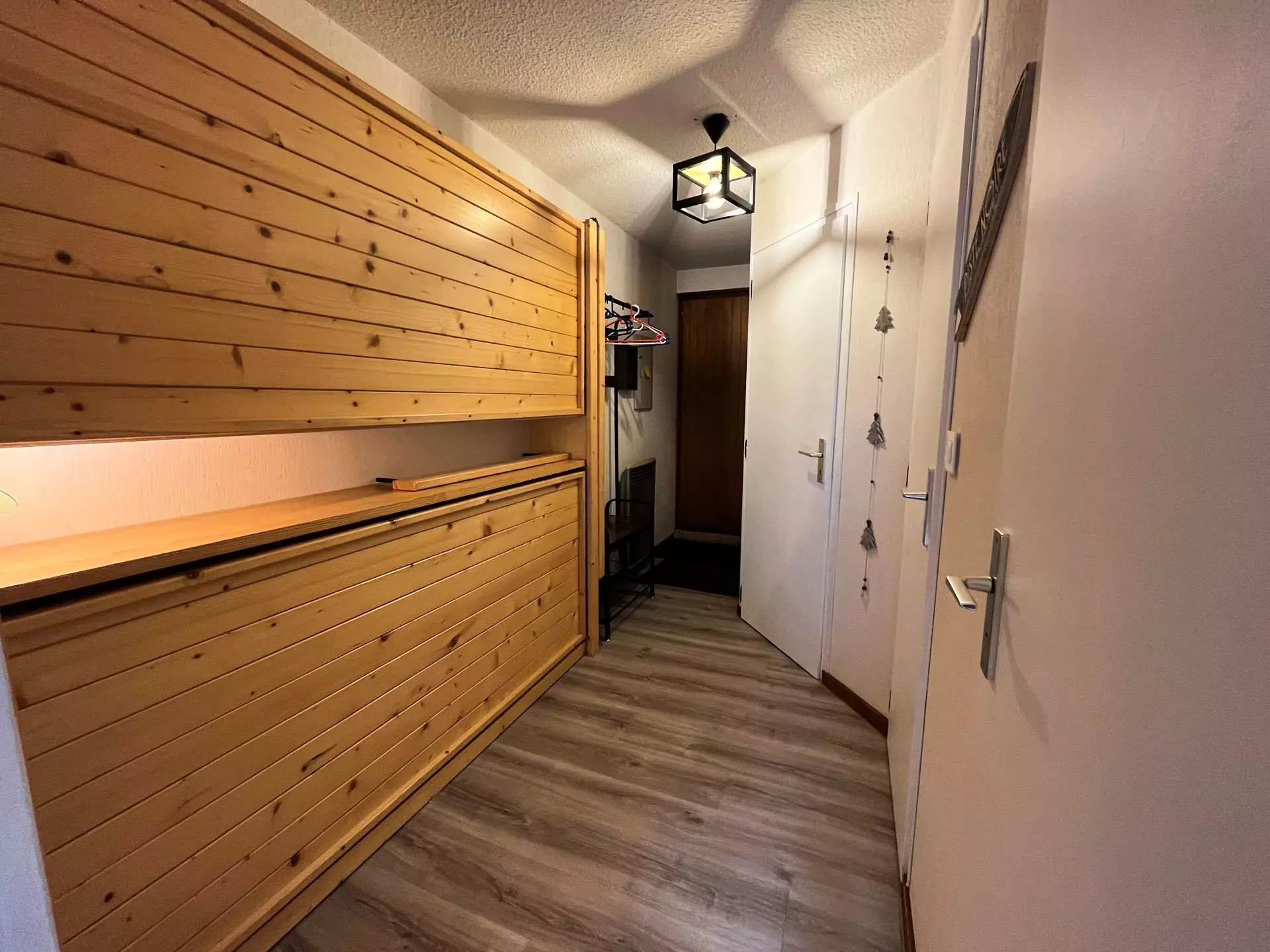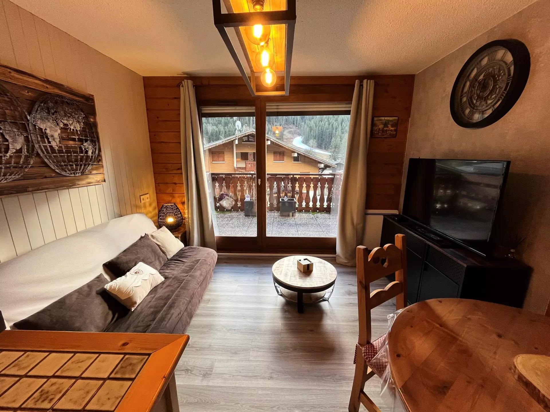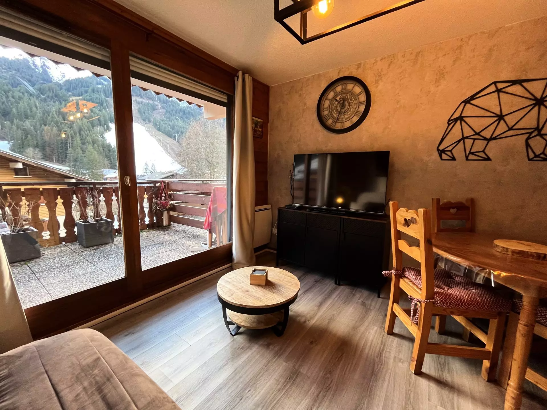 At the entrance, a mountain corner including 2 folding beds measuring 80x200 with 2 duvets of 200x200 provided, a bedroom with a double bed of 140x200 including a TV, a bathroom, a separate WC, a living room, a kitchen, and a large south-facing terrace.