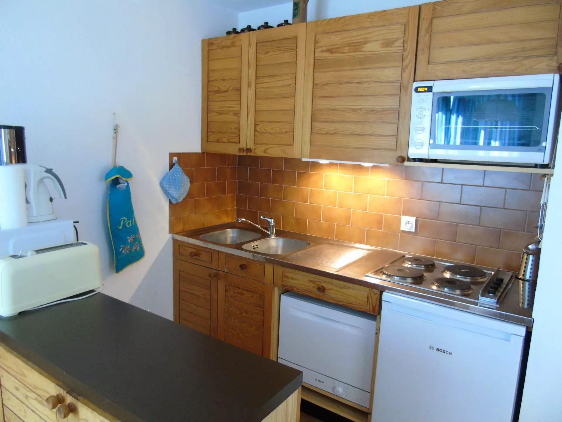 The kitchen is equipped with a hob, a mini oven, a microwave, a filter coffee maker, a toaster and a dishwasher.