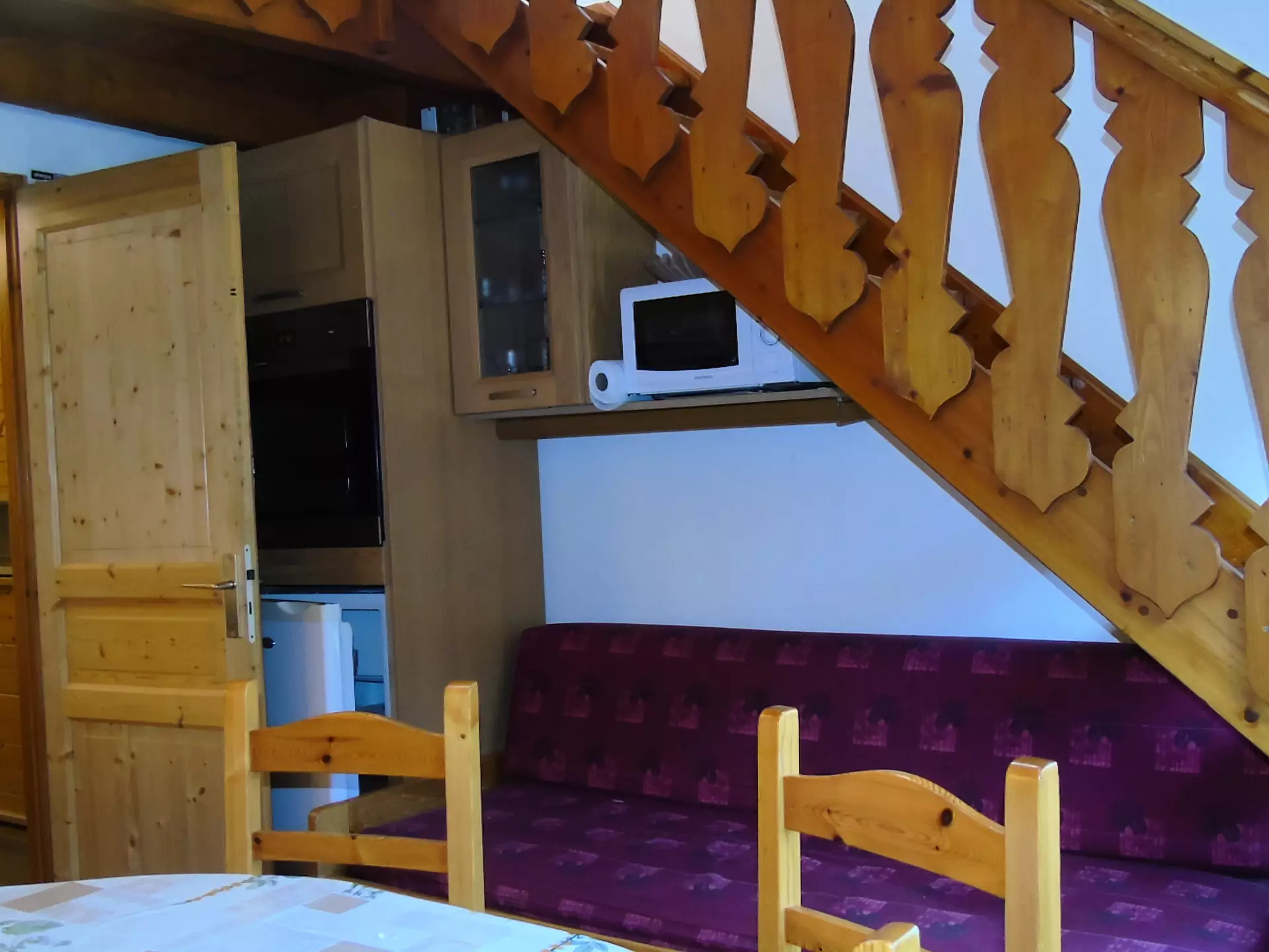 At the entrance, a mountain corner with 2 bunk beds, a double bed in the ground floor bedroom, in the upstairs bedroom a double bed also, and a sofa bed in the mezzanine. There is also a bathroom with bathtub, a separate toilet, a living room, a kitchen, and an east-facing balcony.