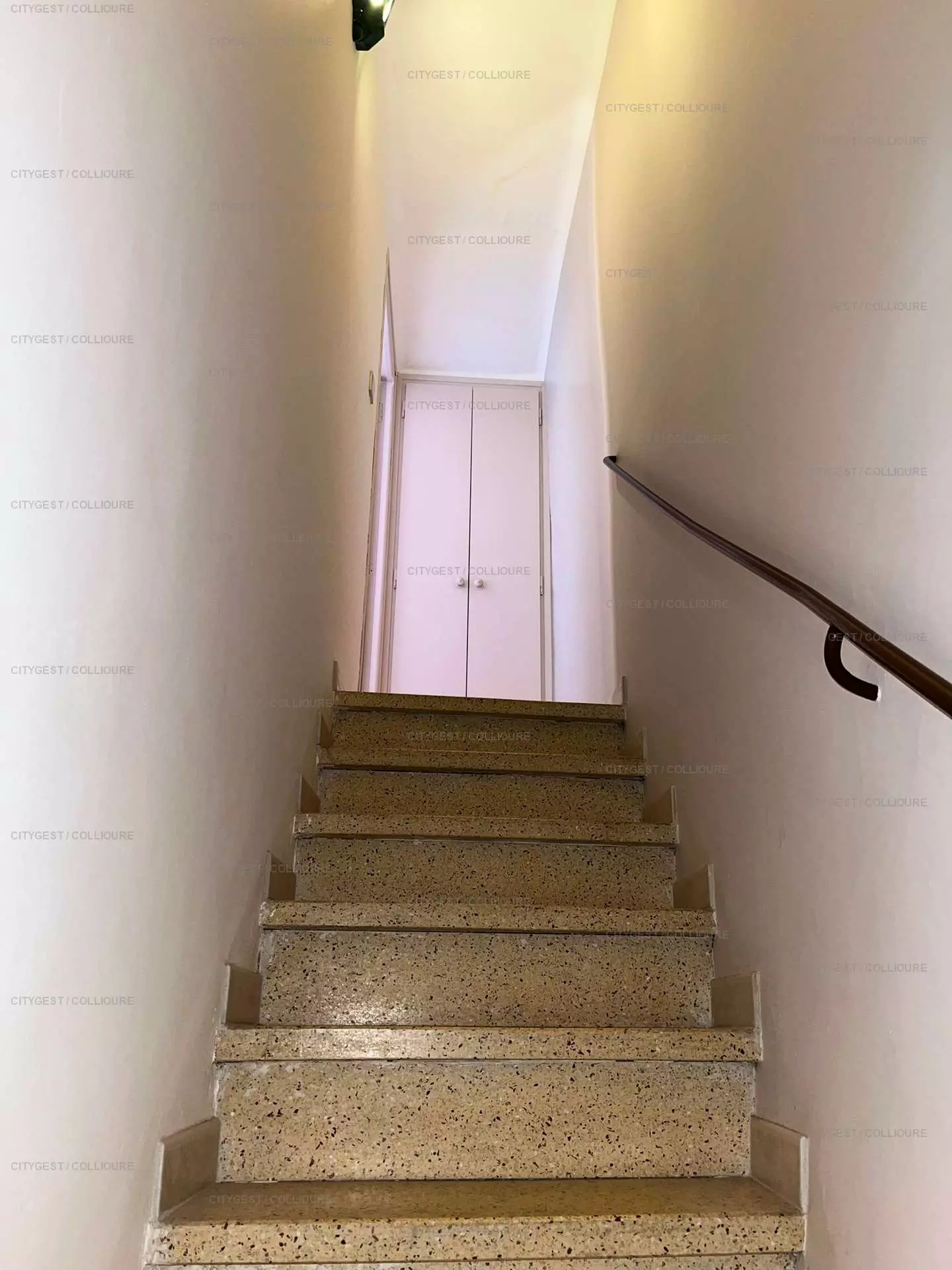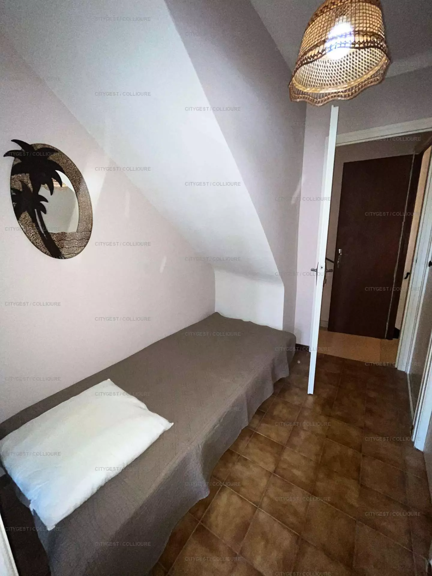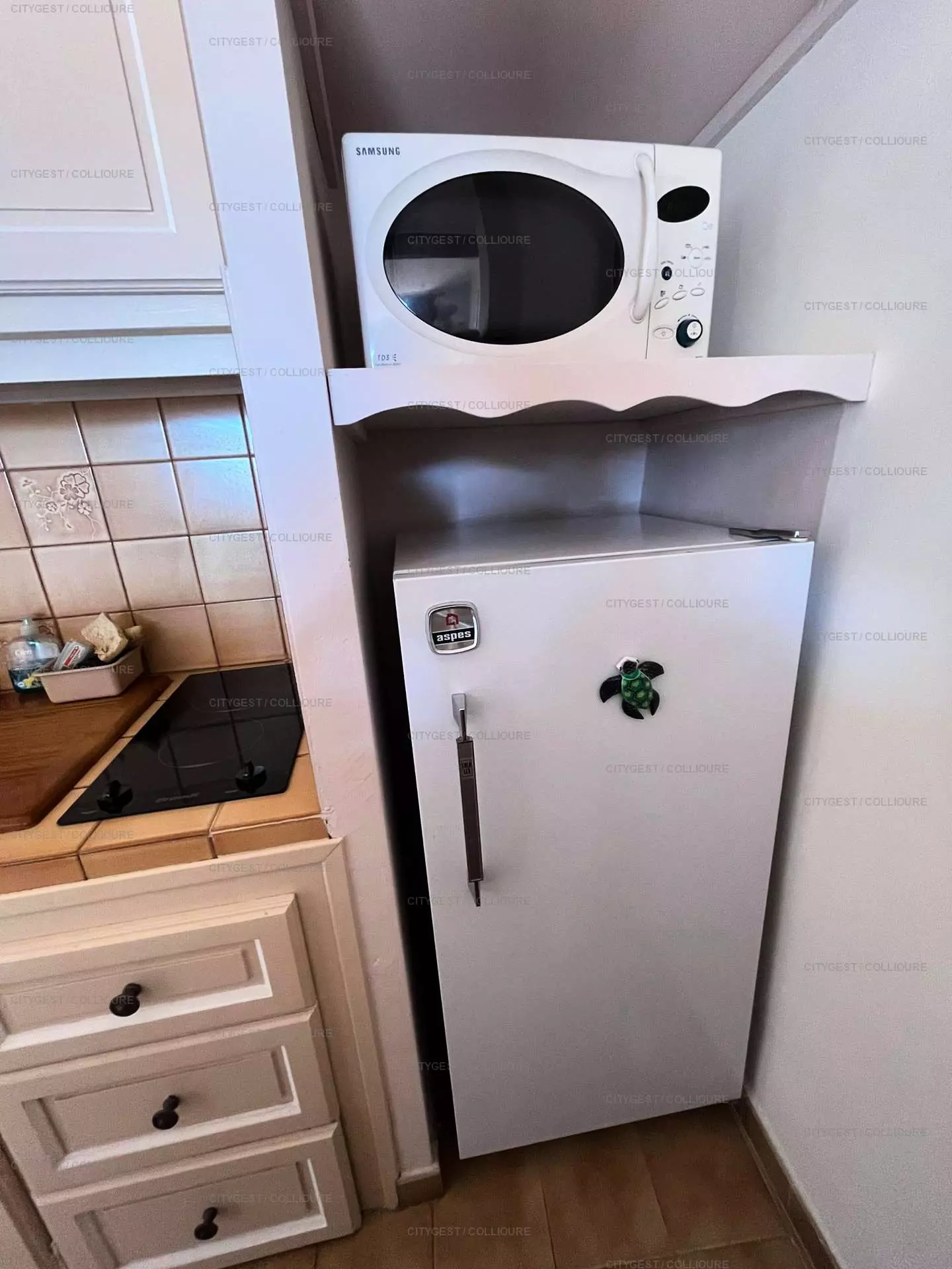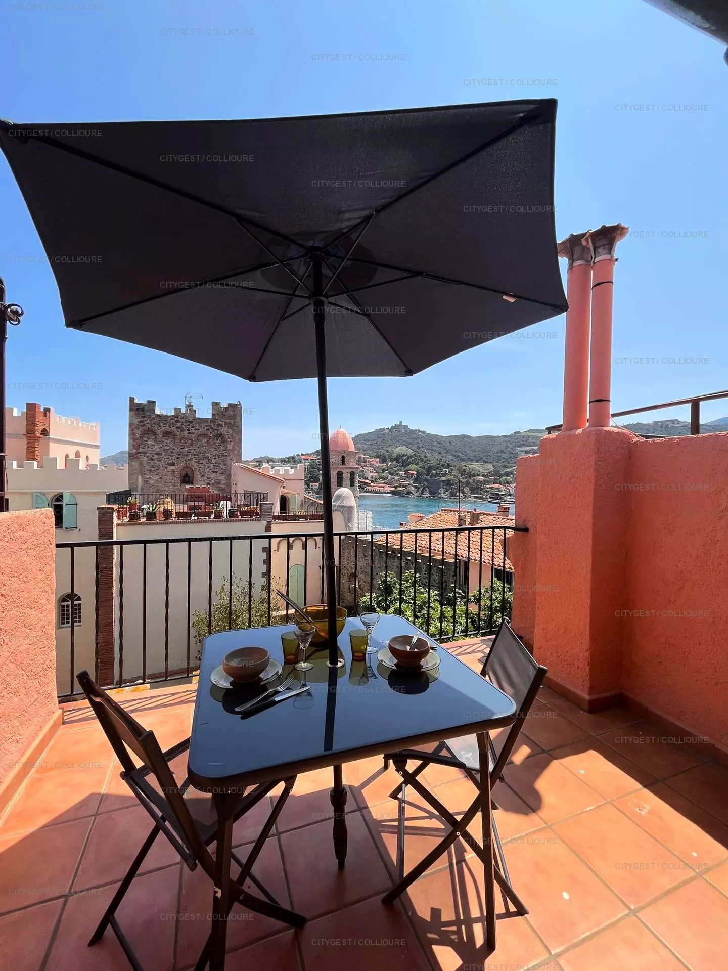 On the second level is the equipped kitchen (microwave, filter and pod coffee maker, fridge, toaster, hotplates), a living area with a wrought iron sofa and coffee table. The apartment has a real asset, it has a large terrace with breathtaking views of the sea and Collioure bell tower, it is equipped with a table and four chairs for dining outside as well as a parasol.