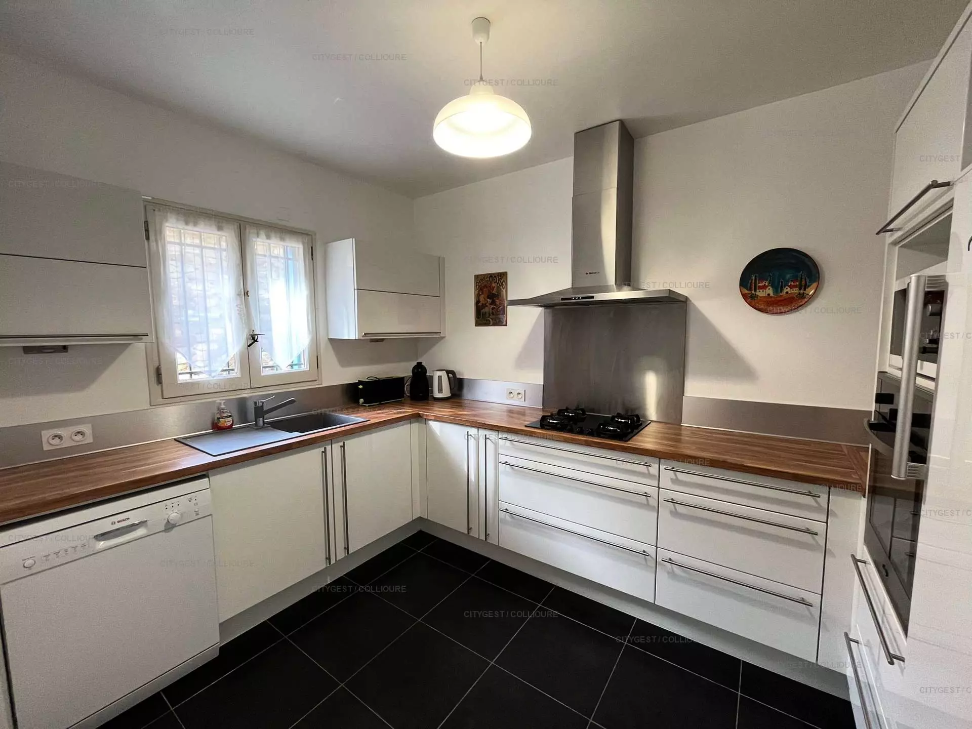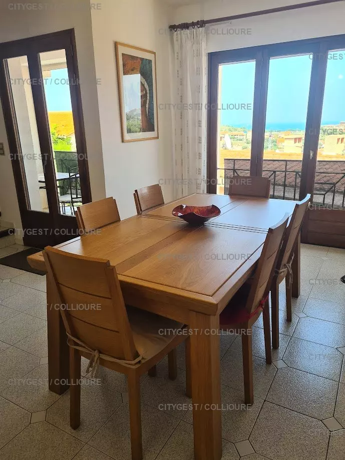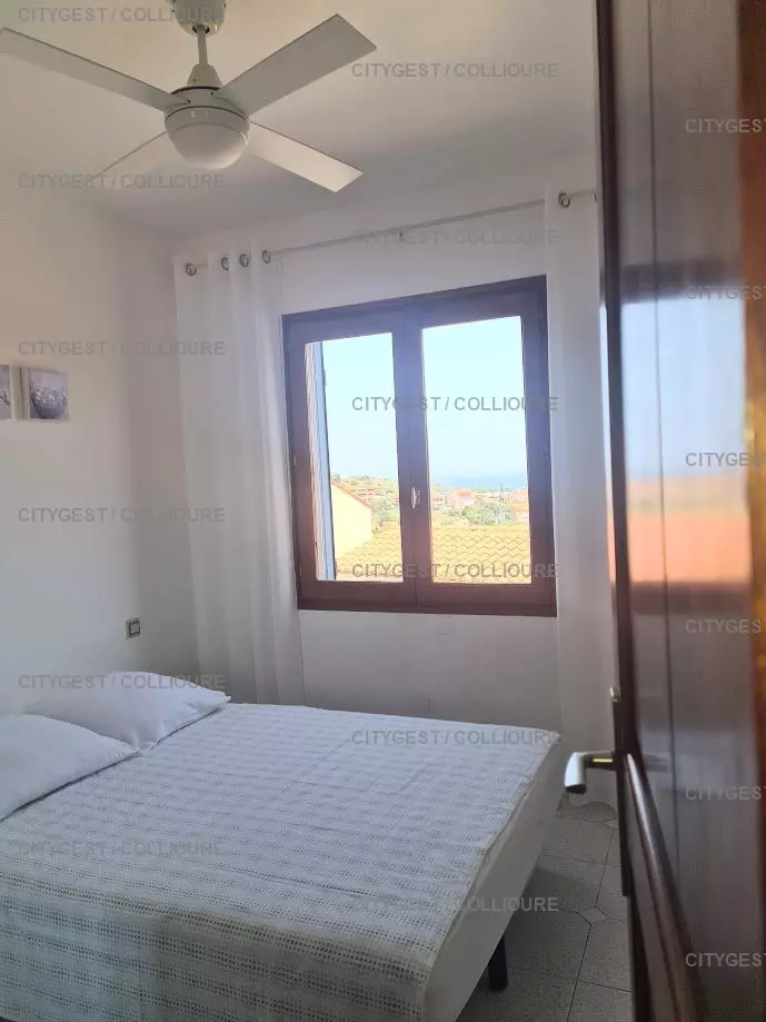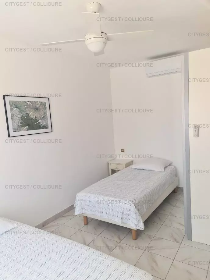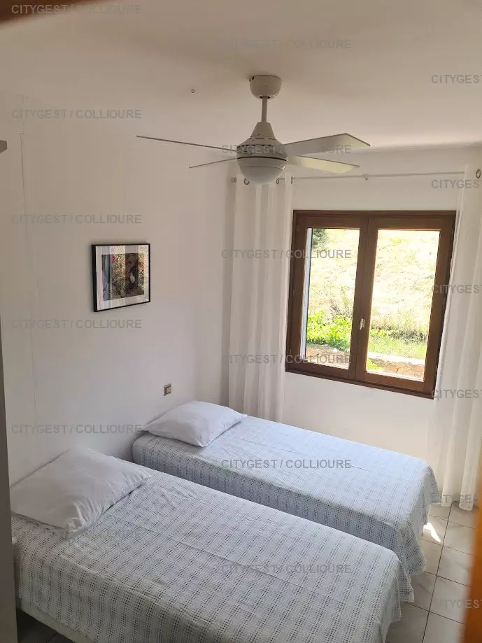 In a recent residence, come and enjoy this pleasant 3-sided T4 villa with space, quality equipment, 3 bedrooms each with its own bathroom and a panoramic view of the bay of Collioure. The accommodation includes, on the ground floor, a garage with parking space, freezer and washing machine, 1 bedroom with 2 single beds and a shower room.