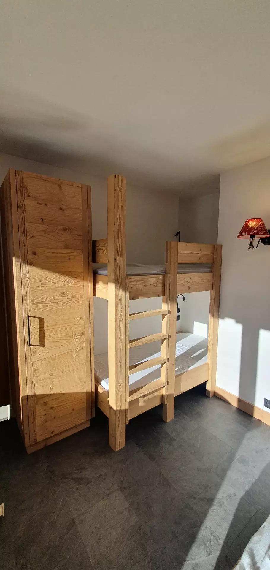 - A bedroom with a bunk bed and a 140cm double bed and balcony access.