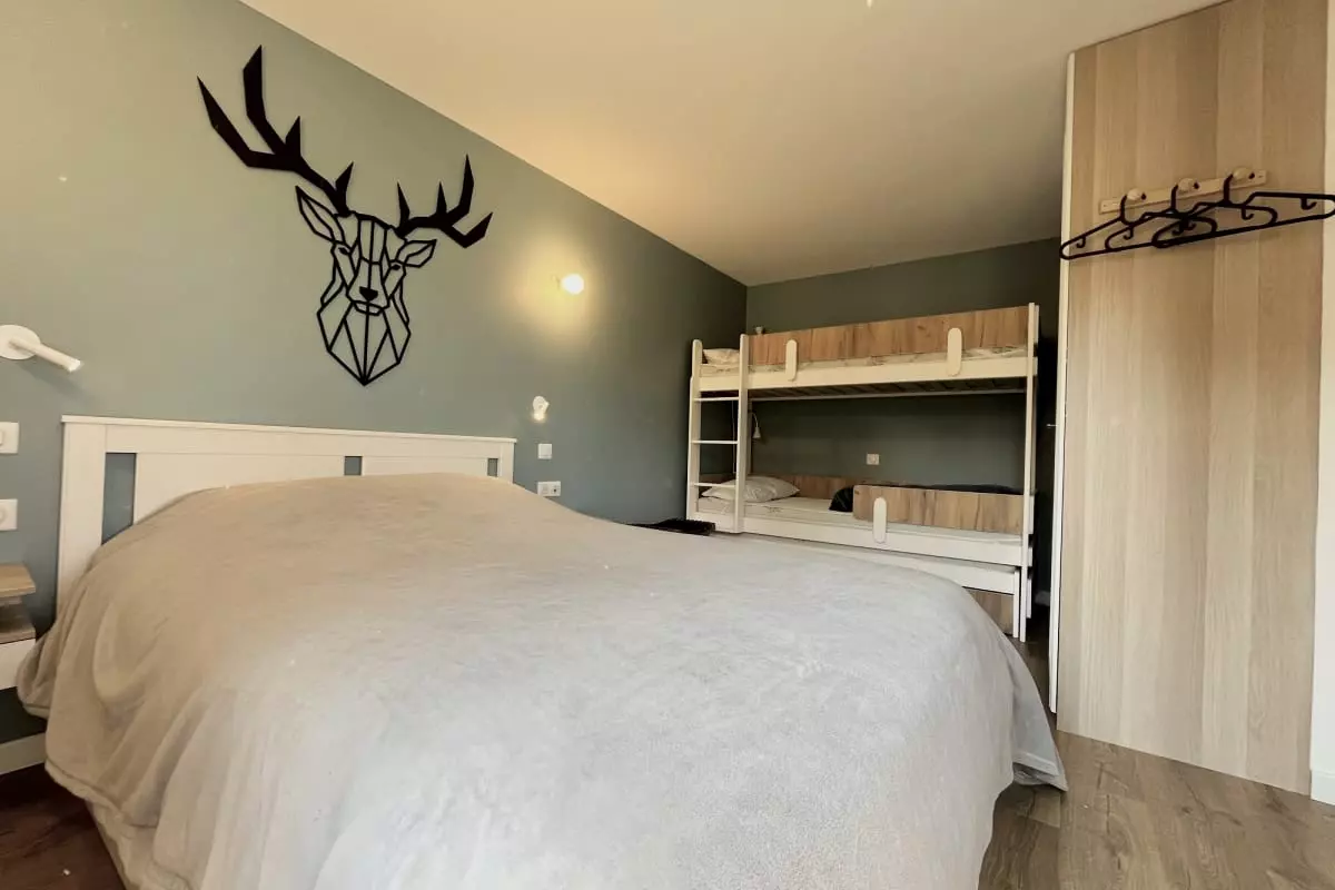 - a bedroom with a double bed and a bunk bed;