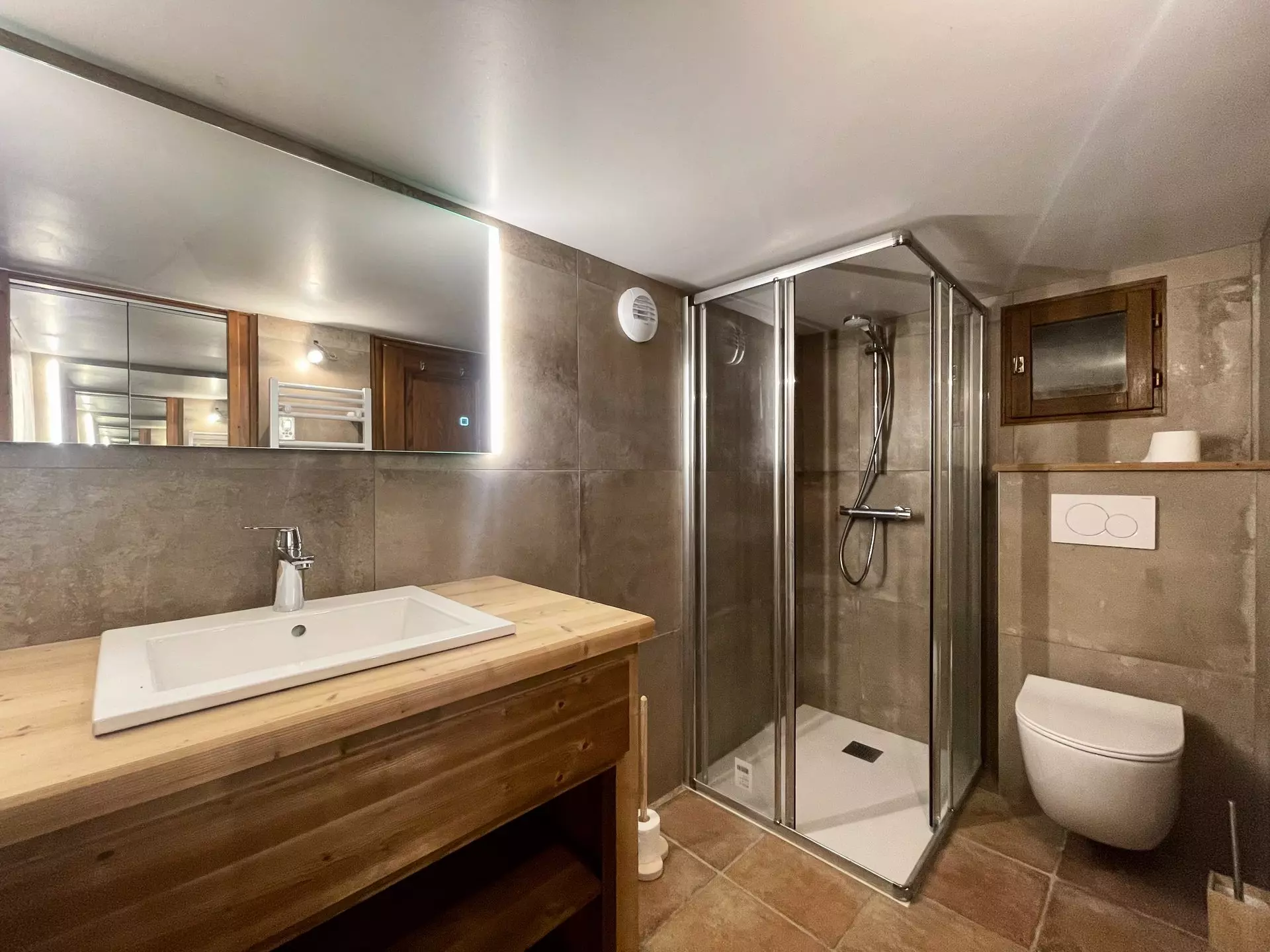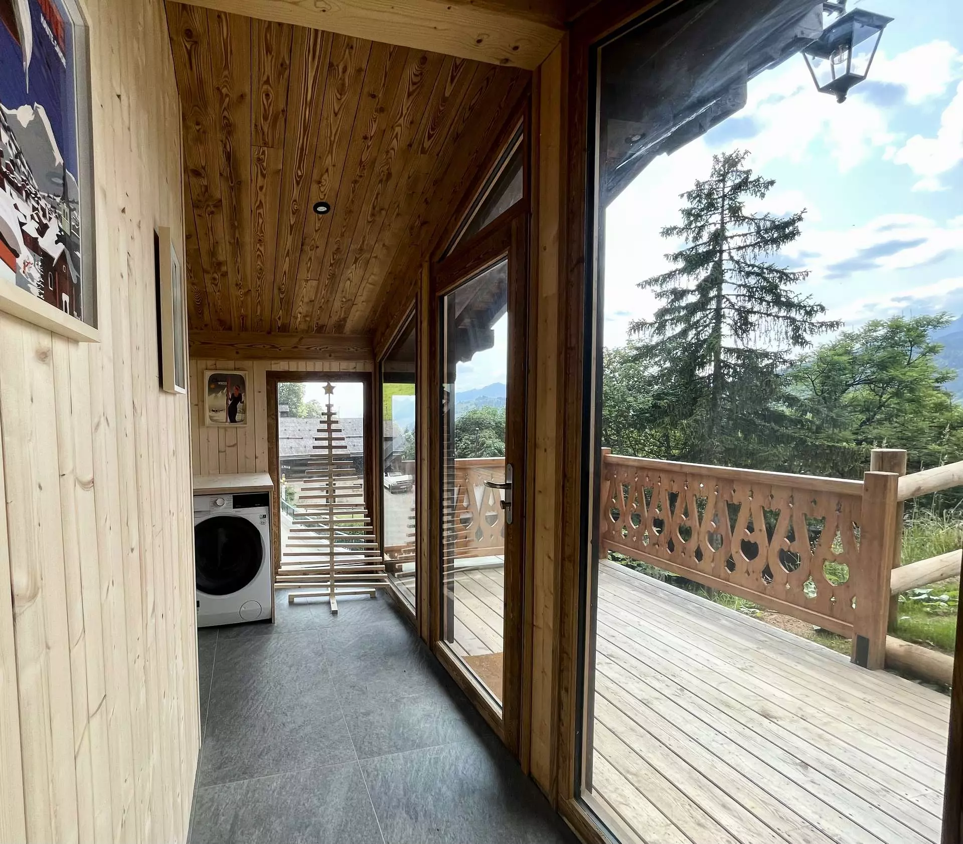 *1ST LEVEL: Laundry room with washer/dryer, and solarium terrace facing Mont Charvin. Bathroom with walk-in shower (note: high ceilings)