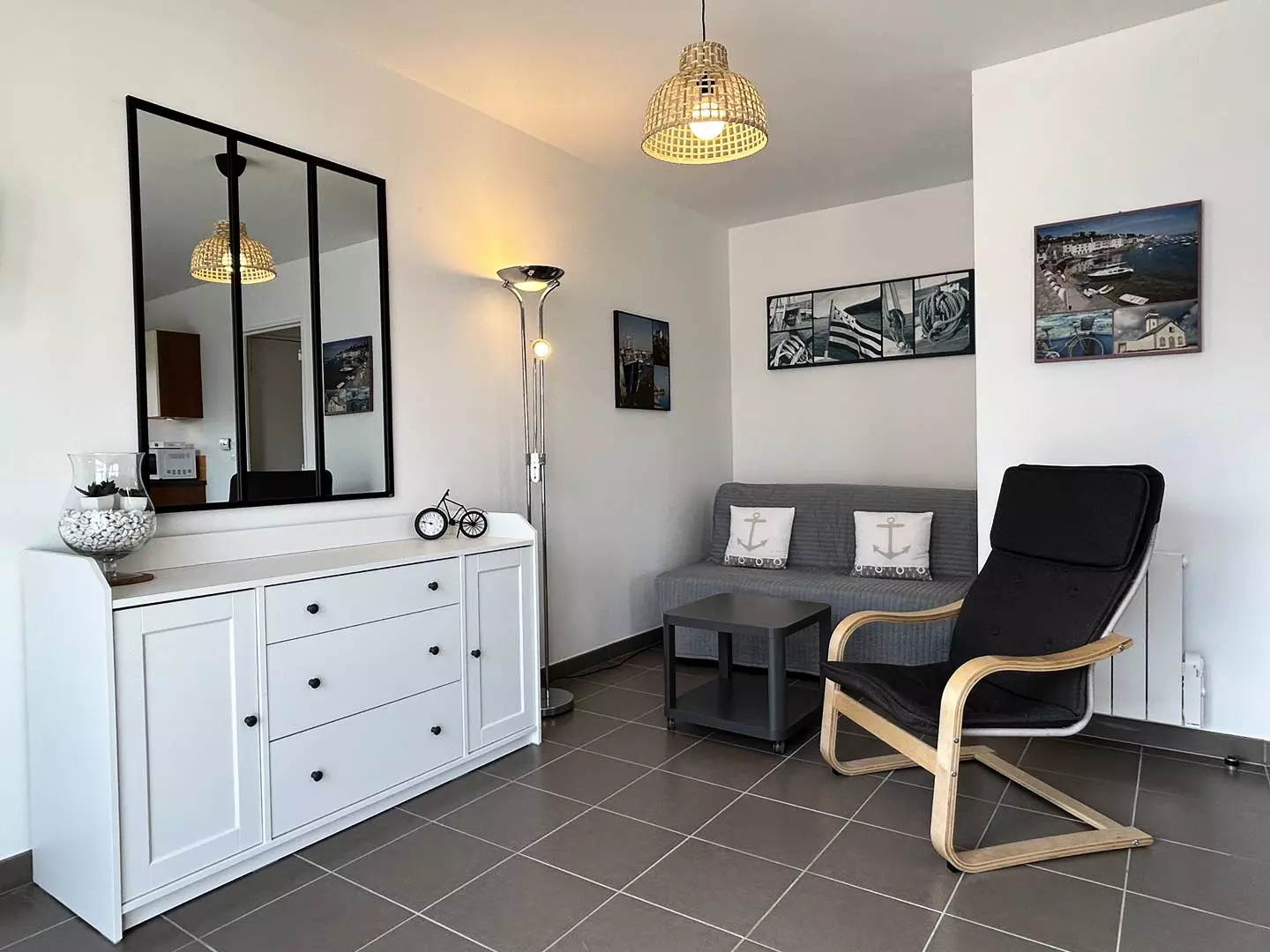 - A living room with a convertible sofa that can accommodate 2 people;