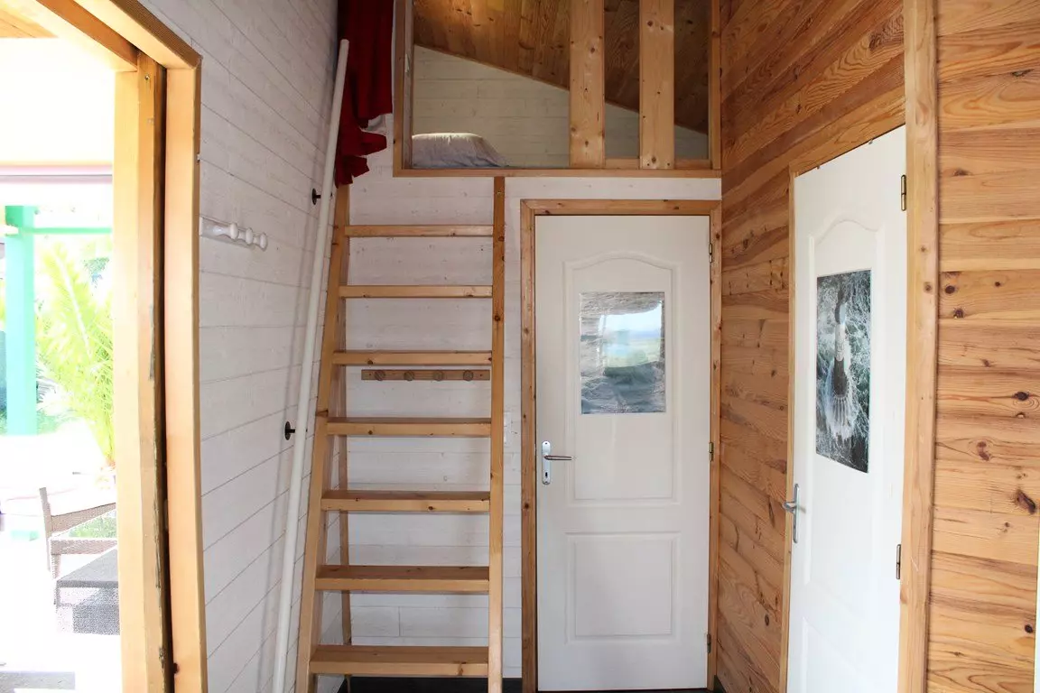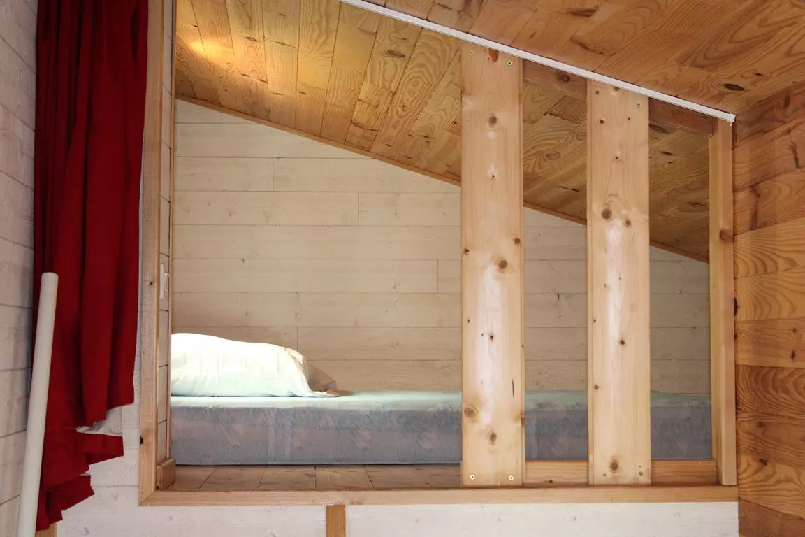 - A living room with TV, sofa, mezzanine with double bed;