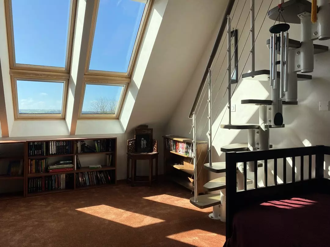 - A living room with cinema area (overhead projector and DVD player) and garden access;